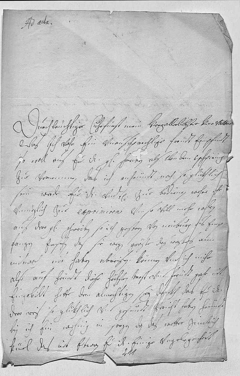 0001Ad acta0002Durchleüchtiger Cuhrfürst, mein herzallerliebster herr vatter 0003Was ich vohr ein vnauschprechlige freüdt empfindt, 0004so woll aus ewer Durchlaucht gnädigem schreiben als von dem v Schpiring 0005zue vernemmen, das ich anheündt noch so glükhlich 0006sein werde, ewer Durchlaucht vnterdehnigst zue bedienen, wehre mihr0007vnmöglich zue exprimiren. Vmso vill mehr, weilen0008aus dero gnädigem schreiben, so ich gestren von Neüburg aus emp- 0009fangen, ersehn, das sie wegen größe des waßers am 0010mitwoch nit haben abreisen können, vnd ich mihr 0011also auf heündt diese höchsten trost vnd freüdt gahr nit 0012eingebilt hette. Dem almechtigen sey dankh, das ewer Durchlaucht 0013dero reis so glükhlich vnd gesundt vericht haben. Heündt 0014bin ich ein wehnig in sorgen, dan das wetter zimlich 0015küel, das nit etwan ewer Durchlaucht einige vngelegenheit