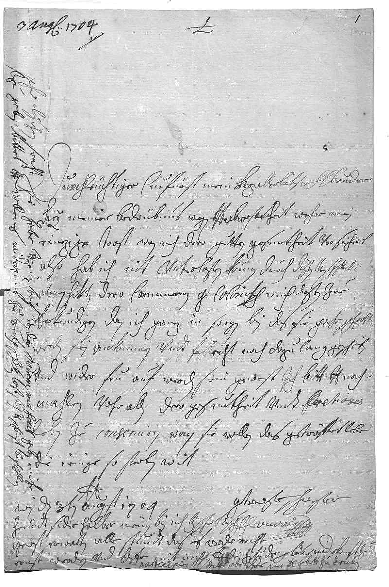00013 august 17040002Durchleüchtiger Curfürst, mein herzallerliebster herr bruder 0003Bey meiner bedrübnus wegen dero Liebden abweßenheit wehre mein 0004einziger trost, wan ich dero gutten gesuntheit versichert, 0005also hab ich nit vnterlaßen können, durch dißen von ihr Mayestät 0006abgeschikten, dero cammerern Grav Colonitsch, mich deßen zue 0007erkundigen, dan ich ganz in sorgen bin, das sie gahr schpaht 0008werden sein ankommen vndt filleicht noch dazu lang geschriben 0009vnd wider fru auf werden sein gewest. Ich bitt dero Liebden noch- 0010mahlen, vohr allen dero gesuntheit vndt pretioses 0011leben zu conseruiren, wan sie wollen, das getröstet lebe 0012die ienige, so sterben wirt 0013dero Liebden 0014getrewste schwester 0015Eleonora 0016Wien den 3ten august 1704 0017Heündt sider halber neün bin ich bey schwester Lischen 0018gewest, erwarten alle stundt, das es werde recht 0019ernst werden vnd hoffe, mit nechsten dero Liebden die zeitung der glückhlichen niderkunft zu 0020participiren. Bitte aber ihrer im heiligen gebett zu denken. 00211Schwester Lischen sacht, sie habe dero Liebden ein brif in der Madamma hent geben, mihr 0022zu geben, bittet, dero Liebden wollens widerumb zu rukh schiken, last sich dero Liebden schönst befehlen.