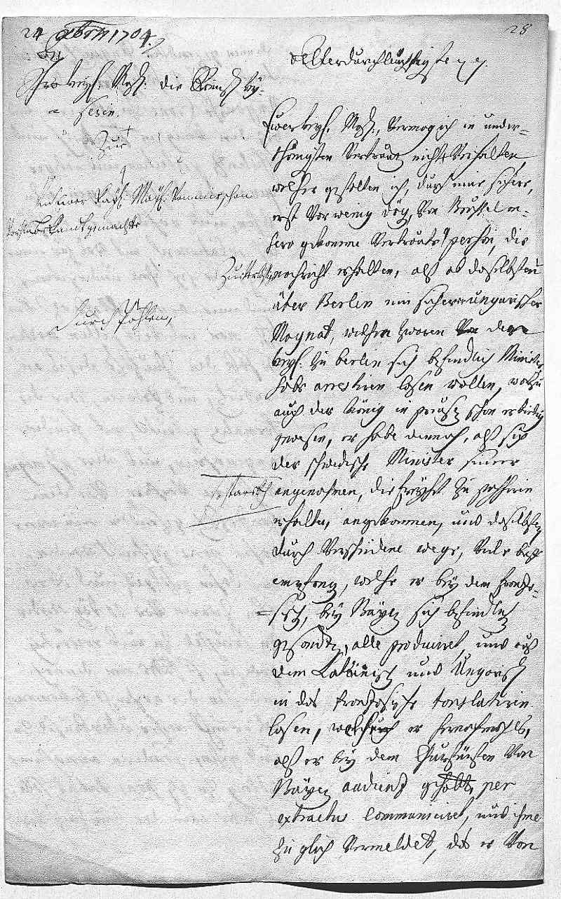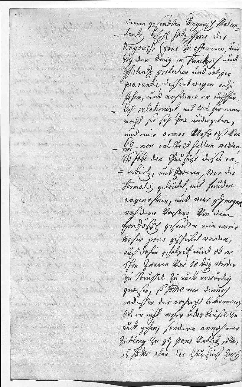 Hat von einer Vertrauensperson, die aus Brüssel zu ihm gekommen ist, die Nachricht erhalten, dass ein ungarischer Magnat über Berlin nach Brüssel gereist sei und dem Kurfürsten Max Emanuel von Bayern im Namen aller unzufriedenen Magnaten die ungarische Krone angetragen habe. Der Kurfürst habe das Angebot freudig angenommen und einen Kurier nach Paris geschickt, warte bisher aber vergeblich auf die Antwort des französischen Königs.