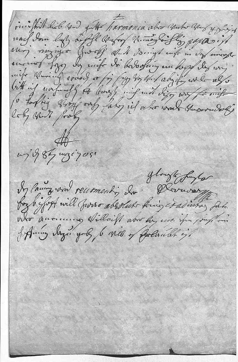 0168einichkeit, lieb vnd gutte harmonia aber vnter vns geschwistert 0169nach dem lezten befehl vnsers vnuergleichligen papa ist 0170mein einziger zwekh, vndt dringt mihr in das inerste 0171meines herzen, dan mihr die bedrohung im kopf, das wan 0172mihr vneinig wurden, er sein segen von vns abzihen wolle. Also 0173bitt ich nochmahlen, dero Liebden trosten mich mit disen, was sie mihr 0174so kreftig verschprochen haben. Ich aber werde vnverenderlich 0175leben vndt sterben 0176dero Liebden 0177getrewste schwester 0178Eleonora 0179Wien den 8ten merz 1705 0180Den Cauniz werd reccomendiren, der 0181Erzbischoff will zwar absolute keinen coadiutorn haben 0182oder anemmen, villeicht aber kan man ihm sonst ein 0183hoffnung dazu geben, so vill es erlaubt ist.