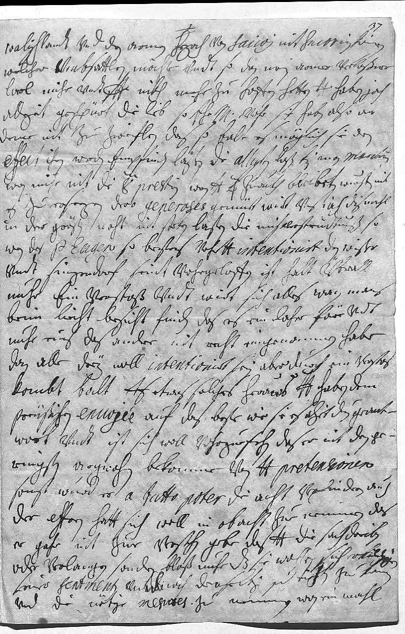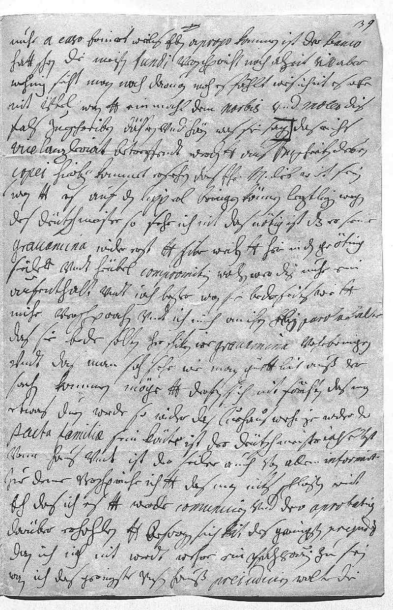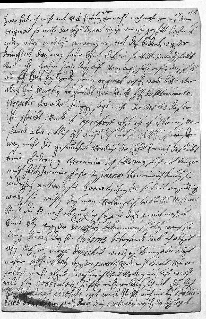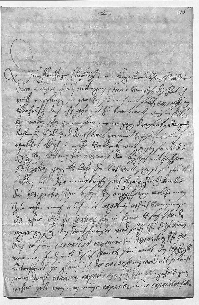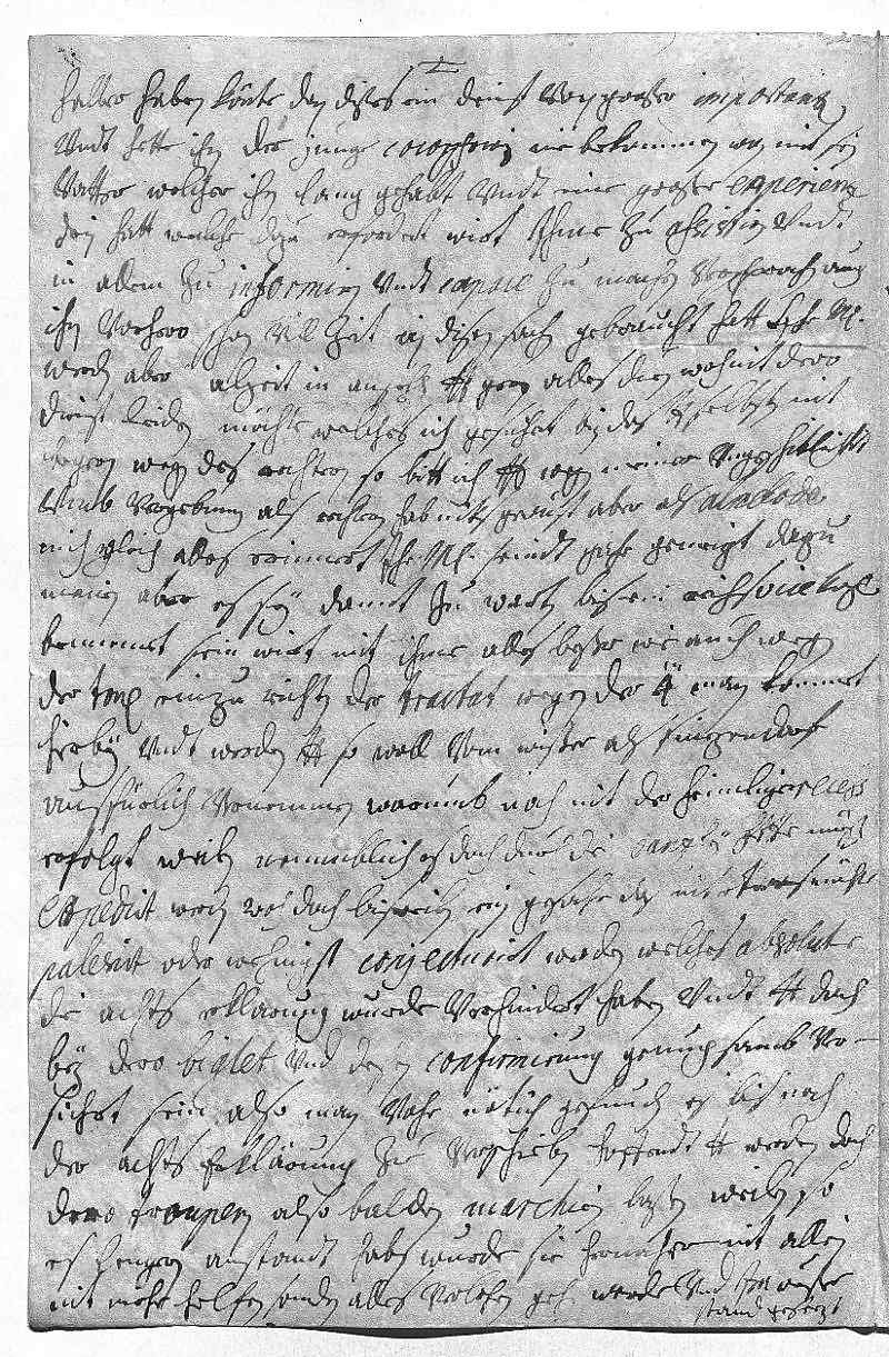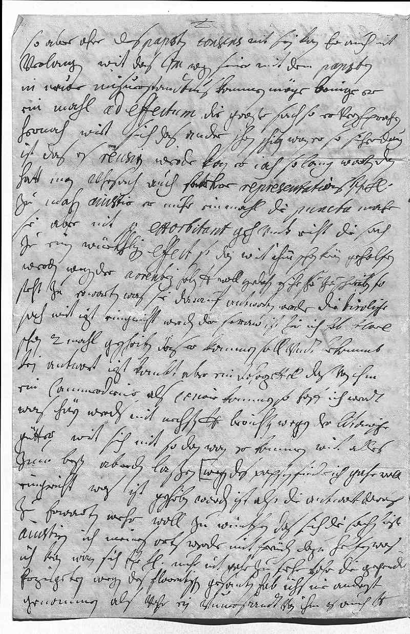 0001Durchleüchtiger Curfürst, mein herzallerliebster herr bruder 0002Dero liebstes schreiben mit eignen courir vom 17ten dis hab ich 0003woll empfangen, in welchen sie mich mit solchen expressionen 0004überheüfen, das ichs gahr nit zu beantworten weis in hoffnung, 0005dero Liebden werden schon genuegsam meiner gegen deroselben dragenden 0006bestendig lieb vnd dankhbares gemüet versichert sein, 0007welches ewich in mihr verbleiben wirt. Gestren seindt die 0008Herzogen von Lottring hier abgereist, der Bischoff mit höchster 0009obligation gegen dero Liebden vohr die lieb vndt sorg, so sie seinet- 0010halben in der münstrischen sach bezeigen. Hierbey kombt 0011die resignation vom Bischoffen von Augschpurg, welche man 0012zue Rohm mues auch mit negotiren, woh ich vernimme, 0013das ohne diß der sentenz schon in fauor vnsers herrn brudern 0014ergangen sey. Den Deütschmeister werd suchen zu disponiren, 0015das er sein canonicat resignire zu disposition ihr Mayestät, 0016wie man finden wirt, das es vonöten sein wirt. Den Laschanzki 0017betreffendt, so glaub ich, der Cocorschowiz werd nit so leicht 0018seinen dienst resigniren, expectanzen geben ihr Mayestät gahr vngern, 0019wehre guet, wan man einige experienz seiner capacitet halber