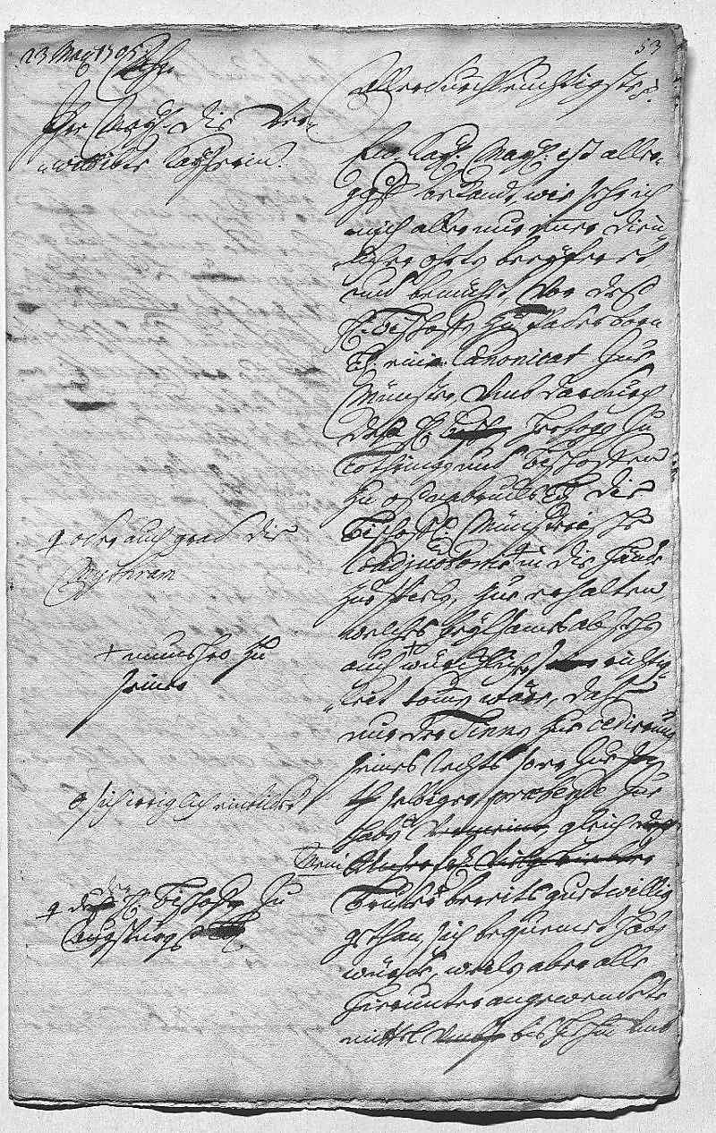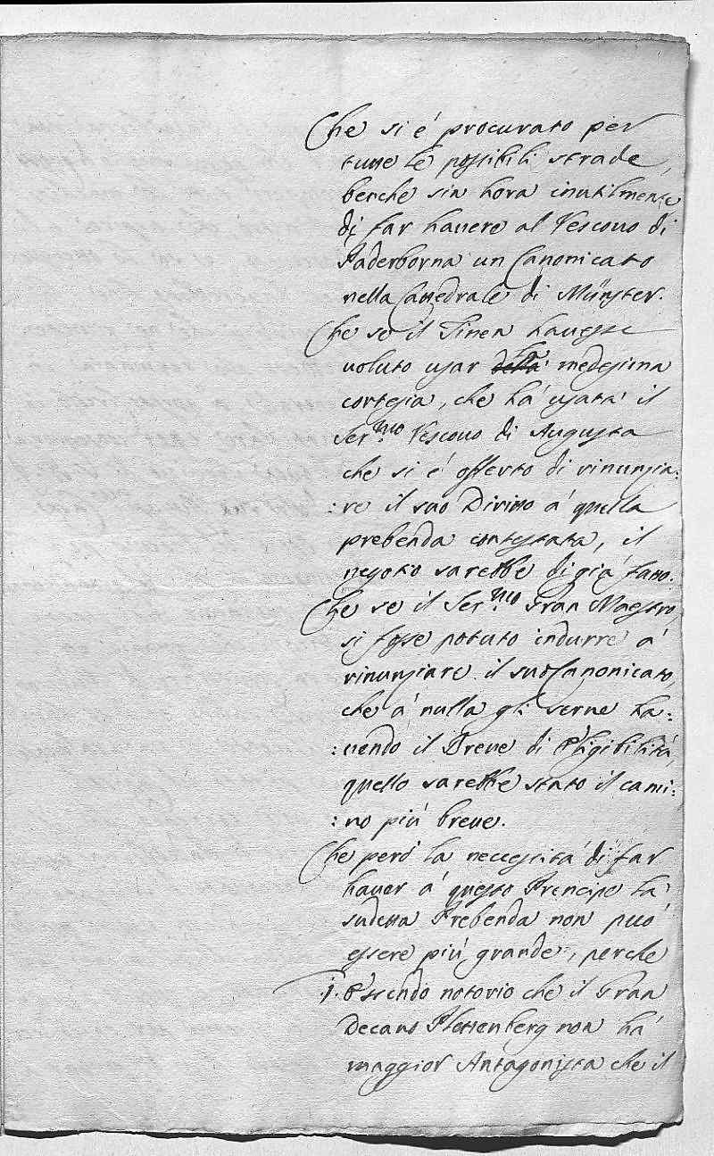 Schlägt vor, dass sein Bruder (Franz Ludwig), der Hoch- und Deutschmeister, sein Kanonikat in Münster zurücklegt , um im Interesse des Reichs und des Erzhauses zu verhindern, dass der Domdechant Plettenberg als französischer Parteigänger Bischof von Münster wird. Wenn der Bischof von Paderborn ein Kanonikat erhielte, würde das die Gerüchte fördern, er wolle sich in Münster bewerben, und damit zur Geheimhaltung des Plans beitragen, unter der Hand den Herzog von Lothringen zum Koadjutor in Münster zu machen. Sendet dem Kaiser (Joseph I.) beiliegend das Requisitionsschreiben für die primas preces zugunsten des Bischofs von Paderborn.