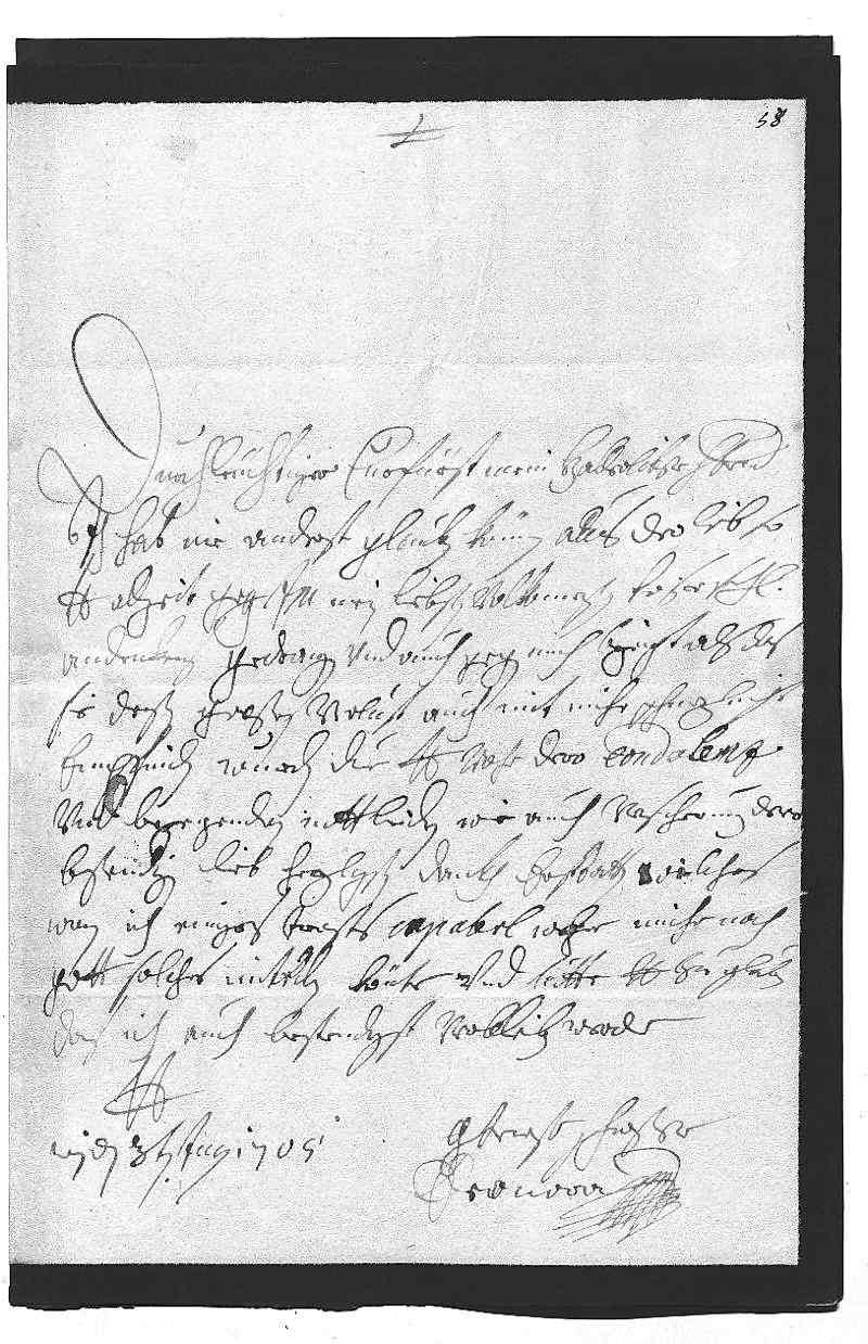 0001Durchleüchtiger Curfürst, mein herzallerlibster herr bruder 0002Ich hab nie anderst glauben können aus dero lieb, so 0003dero Liebden allzeit gegen ihr Mayestät, mein liebsten volkomesten Kaiser sehligen 0004andenkens, gedragen vnd auch gegen mich bezeigt, als das 0005sie deßen großen verlust auch mit mihr schmerzlichst 0006empfinden wurden. Due dero Liebden vohr dero condolenz 0007vnd bezeigenden mittleiden wie auch versicherung dero 0008bestendigen lieb herzligsten dankh erstatten, welches, 0009wan ich einiges trosts capabel wehre, mihr nach 0010gott solches miteilen könte, vnd bitte dero Liebden zu glauben, 0011das ich auch bestendigst verbleiben werde 0012dero Liebden 0013getrewste schwester 0014Eleonora 0015Wien den 3ten juni 1705