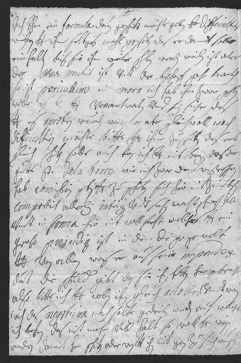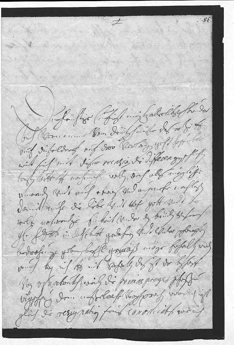 0001Durchleüchtiger Curfürst, mein herzallerlibster herr bruder 0002Ich vernemme vom Deütschmeister, das er zu dero Liebden 0003auf Düßeldorf auf dero verlangen geht, hoffentlich 0004wirt sich mit diser occasion die differenzen schlichten 0005laßen. Bitt dero Liebden nochmahlen, sie wollen doch alles möglige 0006anwenden vndt auch etwas vnd auch mehr nachlaßen, 0007damit nuhr die liebe vndt vohr gott vndt der 0008welt notwendige einikeit vnder den brüdern, vnsers 0009gnädigen herrn vater in dohtbett gedahnen vndt vnder scharfen 0010bedrohunge geben befehl gemäß, möge erhalten werden. 0011Auch kan ich dero Liebden nit verhalten, das izt der Bischoff 0012von Osnabrukh (weilen die primas prezes schon zu 0013Augschpurg dem Neßelraht verschprochen worden) izt 0014gleich die resignation seins canonicats, wie ich