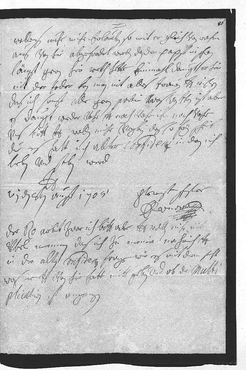 0035wollens nuhr mihr erlauben, so wirt er gleich von Rohm 0036aus von hir abgefordert werden, dan der Papst in schon 0037längst gern hier wekh hette, einmahl daugt er hier 0038nit. Der feder kan man nit alles trawen. Dero Liebden wißen, 0039das ich sonst alle gern portir, was von ihnen ist, aber 0040es daugt weder vohr dero Liebden, noch vohr ihn, noch vohr 0041vns. Bitt, dero Liebden wollen mihr vergeben, das so frey schreib, 0042due es halt inh allter confidenz, in deren ich 0043leben vnd sterben werd 0044dero Liebden 0045getrewst schwester 0046Eleonora 0047Wien den 8ten august 1705 0048Der Rogier arbeit zwar, ich bitt aber, dero Liebden wollen mihr nit 0049übel nemmen, das ich zu meiner nachrich dero Liebden 0050in der alten confidenz frage, wie es mit dem steht, 0051was er dero Liebden von hir hatt mitt geben, vnd ob die multi- 0052plication so angangen.