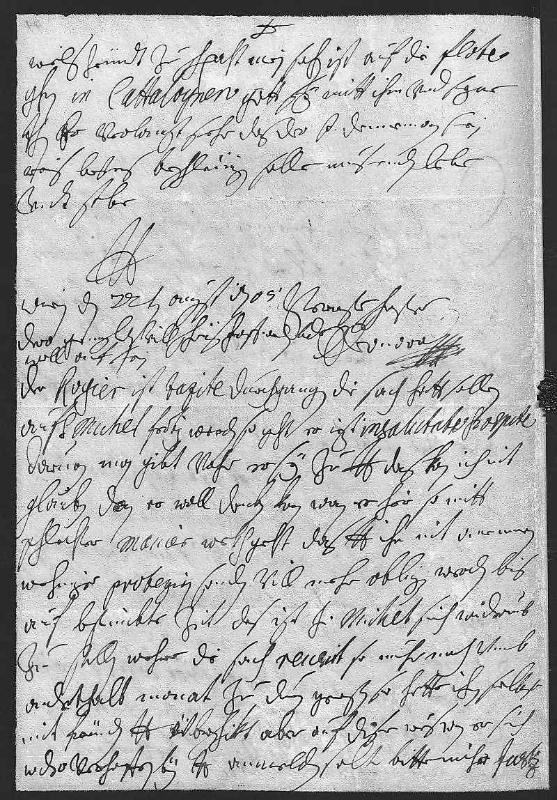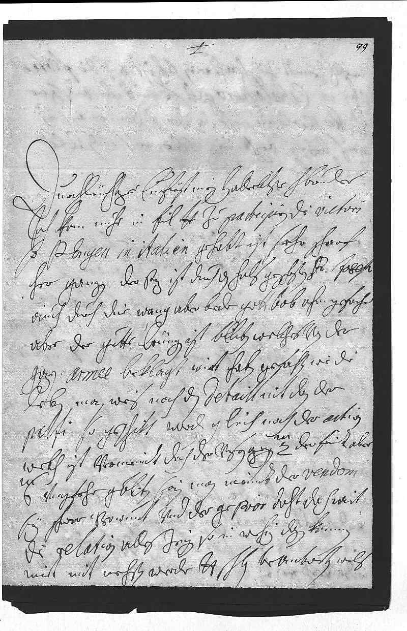 0001Durchleüchtiger Curfürst, mein herzallerlibster herr bruder 0002Ich kom nuhr in eil, dero Liebden zu participiren die victori, 0003so Prinz Eugen in Italien gehabt. Ist sehr scharf 0004her gangen, der Prinz ist durch den hals geschoßen, Prinz Joseph 0005auch durch die wang, aber bede gottlob ohn gefahr, 0006aber der gutte Leüningen ist bliben, welches von der 0007ganzen armee beklagt wirt. Haben gefochten wie die 0008leben, man weis noch den detaill nit, dan der 0009Palfi, so geschikt worden, gleich nach der action 0010wekh ist, vermeindt, das der vnsren gegen 2000, den feindt aber 00116000 vngefehr gbliben sein. Man meindt, der Vendom 0012sey schwer verwunt vnd der Groß Prior doht, das wirt 0013die relation alles zeigen, so in wehnig dagen kommen 0014wirt. Mit nechsten werde dero Lieben schreiben beantworten, weils