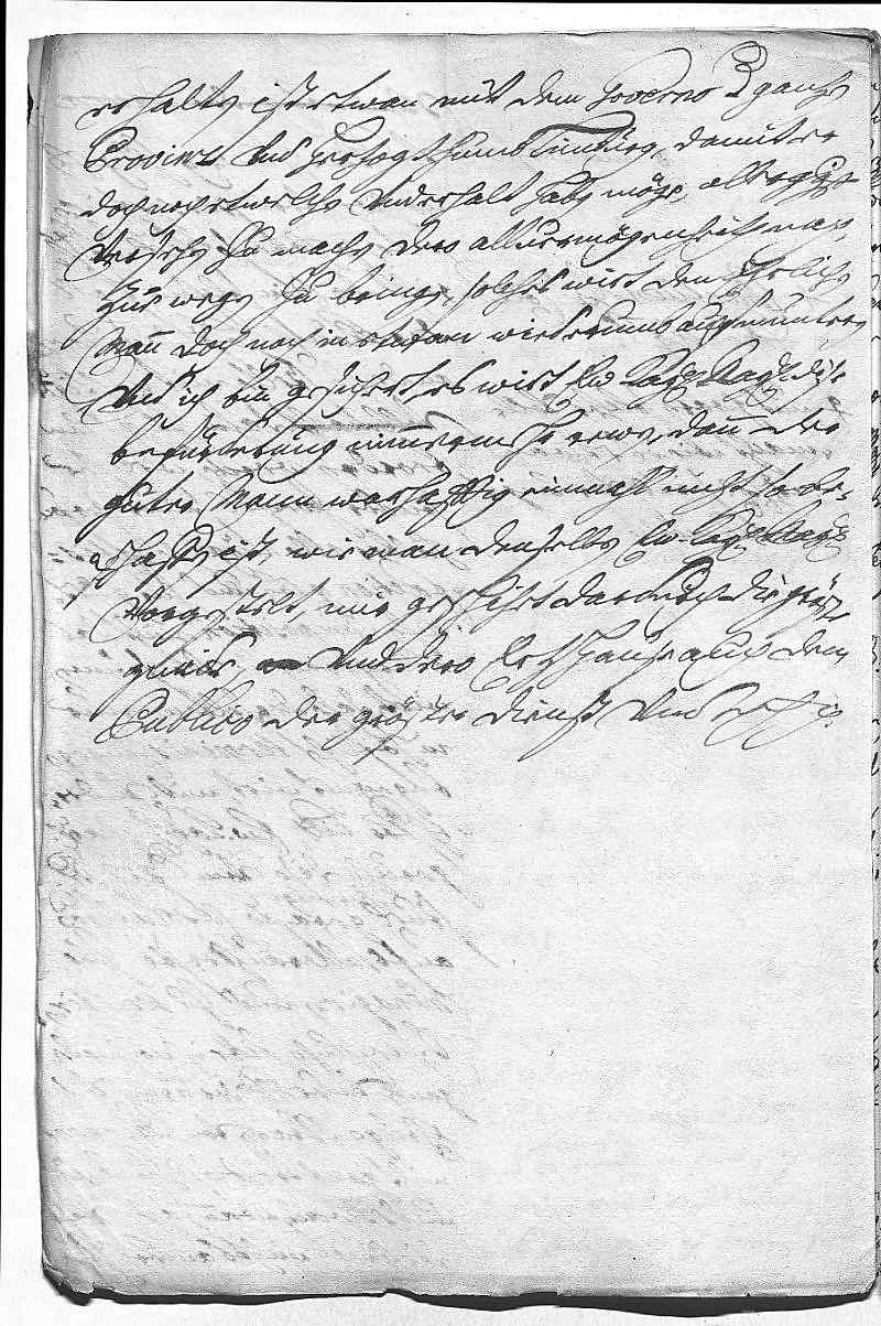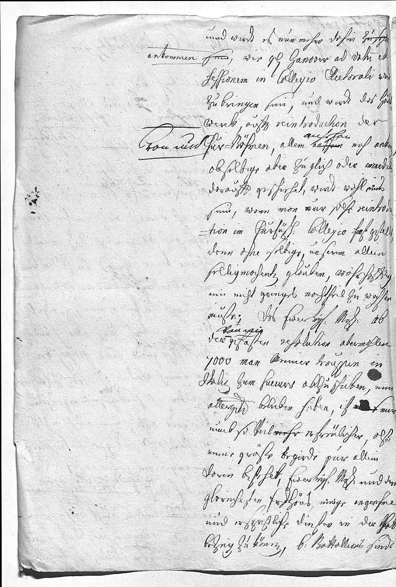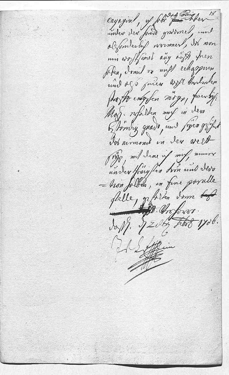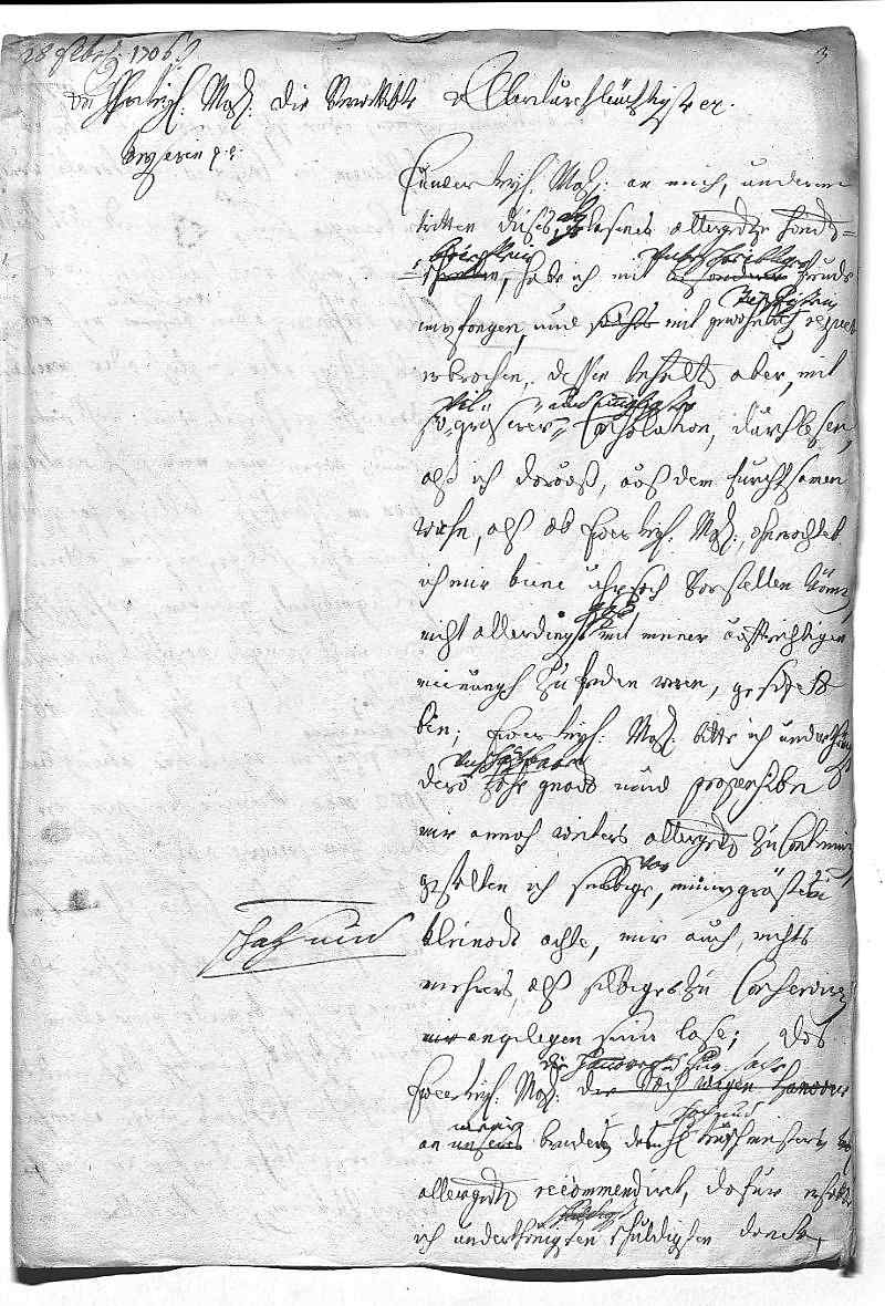 EMTs Brief vom 3. Februar 1706 hat ihn sehr getröstet, da er befürchtet hatte, sie sei mit seiner aufrichtigen Meinung unzufrieden. – Ob die Wiedereinsetzung Böhmens in das Kurkollegium gleichzeitig oder direkt nach der Einsetzung Hannovers erfolgt, ist nicht wichtig, nur, dass sie erfolgt, da sonst ein großer Nachteil für den katholischen Glauben entstünde. – Die weiteren 1.000 Mann, die JW nach Italien schickt, warten bereits in Neuburg auf einen kaiserlichen Kommissar, der sie weiterführt. Verlässt sich darauf, dass sie besser versorgt werden als seine anderen Truppen bisher, die Not und Hunger leiden; fast alle Pferde seiner beiden Regimenter sind verhungert. – Schlägt in der spanischen Heiratssache vor, vorerst abzuwarten, bis der Pater Tönnemann bei König Karl (III. von Spanien) angekommen ist, ihm das Porträt gezeigt und seinen Bericht erstattet hat. Den Douven an andere Höfe zu schicken, wäre zu auffällig, weil er zu bekannt ist; den Dr. Brunner braucht JW wegen einer derzeit hier grassierenden Seuche vorerst selbst. – Hält wegen vieler Beispiele nichts von Ehen zwischen zu nah blutsverwandten Paaren und schlägt daher nicht die Tochter von (Bruder) Pfalzgraf Karl (Philipp) vor, die außerdem zwei Jahre jünger als die Prinzessin von Wolfenbüttel ist. Die Tochter des verstorbenen Bruders Philipp ist weder gut erzogen noch schön. Weiß keine weiteren Prinzessinnen im Reich als die, von denen er schon geschrieben hat. – Was der Hoch- und Deutschmeister (Bruder Franz Ludwig) EMT gesagt hat, wird nicht sein Ernst sein; der Bischof von Osnabrück hat jedenfalls keine Aussichten in Münster. – Wird wegen der Reichsacht und Brandenburgs Vorschlag einer Erbvereinigung nichts ohne EMTs Vorwissen tun; wünschte, ihr mündlich erzählen zu können, was in dieser Sache vorgefallen ist, weil er es nicht der Feder anvertrauen kann. – Wird überlegen, was man für den Grafen Hohenfeld tun kann. – Die Angelegenheit der von Fränz ist so gut wie erledigt. – Die Vollmacht aus Rom wird inzwischen gekommen sein; JW wird gerne auf EMTs Befehl unter der Hand zur Beilegung der Differenzen (zwischen päpstlichem und kaiserlichem Hof) beitragen. – EMT wird es nicht bereuen, dem Kaiser den Kölner Nuntius empfohlen zu haben für den Fall, dass der Davia weiter auf seiner Abreise von Wien beharrt . Hat zuverlässige Nachricht, dass der Piazza in diesem Fall die nötige Vollmacht vom römischen Hof erhielte. – Entschuldigt sich für den Fall, dass EMT in seinem letzten Schreiben das eine oder andere Wort gekränkt hat, und dankt für ihre anhaltende Gnade. – Hat bereits dem Dr. Brunner befohlen, sich beim Arzt der Prinzessin von Wolfenbüttel zu erkundigen, ob man tatsächlich versuche, den Gang der Natur bei ihr mit Medikamenten zu beschleunigen. – EMT hat richtig erraten, dass der Ruggiero ein Betrüger ist. Er hat sich nun beim König in Preußen engagiert, den JW aber unter der Hand gewarnt hat.