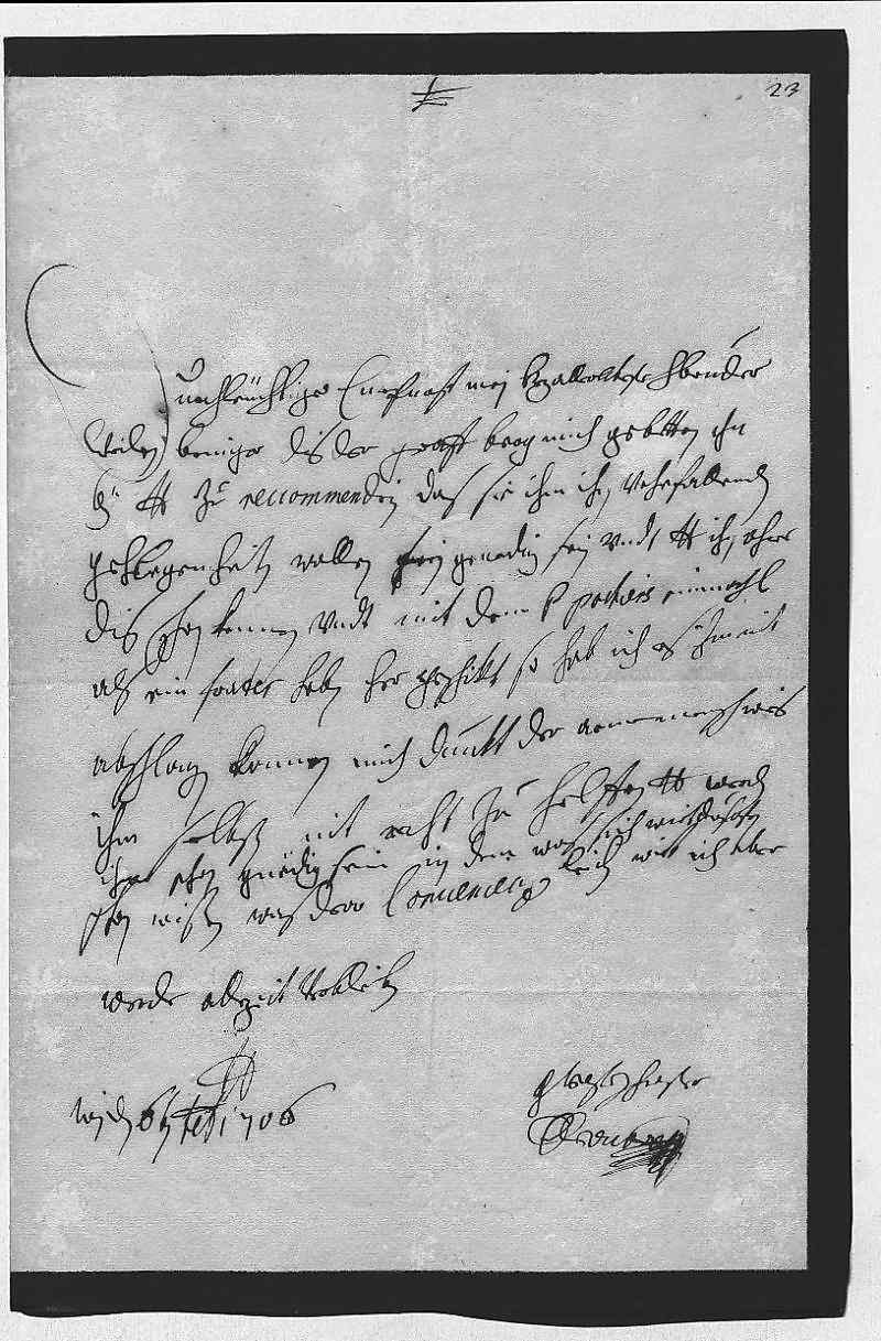 0001Durchleüchtiger Curfürst, mein herzallerlibester herr bruder 0002Weilen bringer dis, der Graff Berg, mich gebetten, ihn 0003bey dero Liebden zu reccommendiren, das sie ihm ihn vohrfallenden 0004gehlegenheiten wollen sein genedig sein, vndt dero Liebden ihn ohne 0005dis schon kennen vndt mit dem Pater Poitiers einmahl 0006als ein frater haben her geschikt, so hab ich es ihm nit 0007abschlagen konnen. Mich dunkt, der arme mensch weis 0008ihm selbsten nit recht zu helffen, dero Liebden werden 0009ihme schon gnädig sein in dem, was sich wirt dun laßen und0010schon wißen, was dero conuenienz leiden wirt. Ich aber 0011werde allzeit verbleiben 0012dero Liebden 0013getrewste schwester 0014Eleonora 0015Wien den 6ten februarij 1706