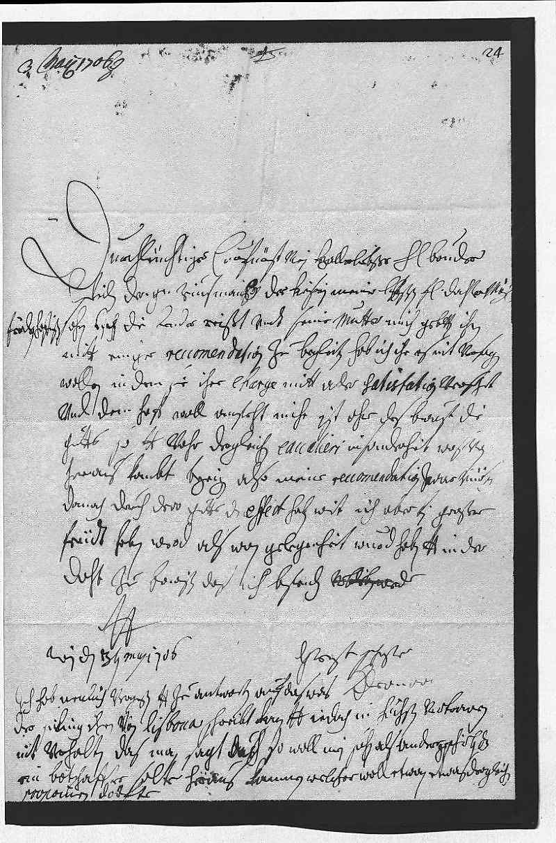 00013 maij 17060002Durchleüchtiger Curfürst, mein herzallerliebster herr bruder 0003Weilen der Grav Rinsmaul, der Keiserin, meiner libsten fraw dochter Mayestät, 0004Freilen Hofmeisterin sohn, in die lender reißt vndt seine mutter mich gebetten, ihn 0005mitt einiger reccomendation zu begleiten, hab ich ihr es nit versagen 0006wollen, in dem sie ihre charge mitt aller satisfaction versihet 0007vnd dem hoff woll ansteht. Mihr ist ohne des bewust die 0008gutte, so dero Liebden vohr dergleichen caualieri, insonderheit was von 0009heraus kombt, bezeigen, also meine reccomendation zwar vnötig, aber0010danoch durch dero gütte den effect haben wirt, ich aber kein großer 0011freüdt haben werd, als wan gelegenheit wurd haben, dero Liebden in der 0012daht zu erweißen, das ich bestendig verbleiben werde 0013dero Liebden 0014getrewste schwester 0015Eleonora 0016Wien den 3ten maij 1706 0017Ich hab neulich vergeßen, dero Liebden zu antworten auf das, was 0018der Piling ihnen von Lisbona schreibt, kann dero Liebden iedoch in höchsten vertrawen 0019nit verhalten, das man sagt, auch so woll mein sohn als andere geschriben, das 0020ein botschaffter solte heraus kommen, welcher woll etwan etwas dergleichen 0021proponiren dahte.
