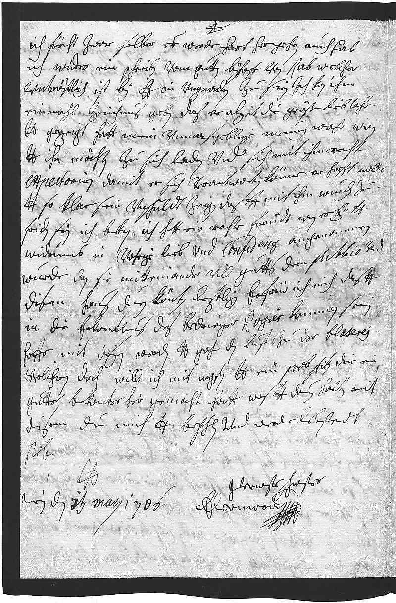 0111ich förcht zwar selber, es werde hart her gehen. Auch hab 0112ich wider ein schreiben vom gutten Bischoff von Rab, welcher 0113vntröstlich ist, bey dero Liebden in vngnaden zu sein. Ich kan ihm 0114einmahl zeichnus geben, das er alzeit die gröste lieb vohr 0115dero Liebden gezeigt hatt. Mein vnmasgeblige meinung wahr, wan 0116dero Liebden ihn möchten zu sich laden vnd sich mit ihm recht 0117expectoriren, damit er sich verantworten könne, er hofft, wolle 0118dero Liebden so klar sein vnschuldt zeigen, das dero Liebden mit ihm wurden zu- 0119friden sein. Ich bekenn, ich hett ein rechte freüdt, wan er bey dero Liebden 0120widerumb in vohrige lieb vnd confidenz angenommen 0121wurde, dan sie mitteinander vill gutts dem publico vnd 0122disem haus duen könten. Leztligen erfrew ich mich, das dero Liebden 0123in die erkantnus des bedrieger Rogier kommen sein, 0124hoffe, mit disen werden dero Liebden gahr den lust zu der blaserei 0125verlihren, doch will ich mit negsten dero Liebden ein prob schiken, die ein 0126gutter bekanter hier gemacht hatt, was dero Liebden dauon halten. Mit 0127disem due mich dero Liebden befehlen vnd werde leben vndt 0128sterben 0129dero Liebden 0130getrewste schwester 0131Eleonora 0132Wien den 1ten maij 1706