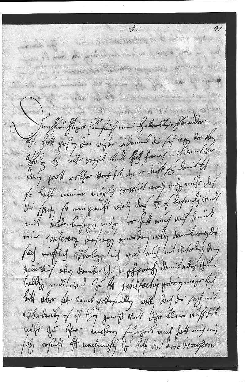 0001Durchleüchtiger Curfürst, mein herzallerlibster herr bruder 0002Es hatt gestren der Wißer widrumb die sach wegen der Obren 0003Pfalz bey mihr vrgirt vndt ich hernach mit dem Keiser 0004dauon gerett, welcher versichert, das er darob sey, damit dero Liebden 0005so balt immer möglich consolirt werden mögen, nuhr das 0006die sachen so eingericht werden, das dero Liebden es bestendig vndt 0007mit ruhe besizen mög. Er hatt auch auf heündt 0008eine conferenz deswegen anorden wollen, damit man die 0009sach reifflich überlege. Ich werd auch nit vnterlaßen, denen 0010ministris allen dorüber zu zu schprechen, damit alles zum 0011baldigen endt vnd zu dero Liebden satisfaction gedeien möge. Ich 0012bitt aber, dero Liebden vmb gotteswillen wollen doch die sach nit 0013vberdreiben, es ist ihnen gewiß, vndt diser kleiner aufschub 0014nuhr zu ihrer mehren sicherheit. Auch hatt mich mein 0015sohn ersucht, dero Liebden nachmahlen zu bitten, das dero troupen,
