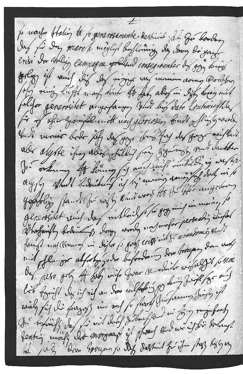 0016so nacher Italien dero Liebden so generosamente destinirt haben, zu beordren, 0017das sie den march möglist beschleünigen, dan daran die ganze 0018crisi der volligen campagne geb vnd conseqwenter des ganzen kriegs 0019gelegen ist, auch dis das einzige, was meinem armen verlaßnen 0020sohn einigen lufft machen könte. Dero Liebden haben alles in disen krieg mit 0021solcher generositet angefangen vndt bis dato continuirt, das 0022sie es ohne zweifel mitt noch gloriosern endt schließen werden 0023vndt meine bede söhn, das ganze haus, iah das ganze Reich vndt 0024alle alijrte ihnen alles schuldich sein beyzumeßen vndt dankbar 0025zu erkennen. Dero Liebden können sich auch leicht einbilden, in was vohr 0026angsten vndt bedrübnus ich bin, meinen armen sohn dorten in so 0027gefahrligen standt zu wißen, vndt werden dero Liebden zu ihrer angebornen 0028generositet auch das mitleiden, so sie gegen mich in meinen so 0029überhauften bedrübnußen dragen werden, noch mehre persuadiren, dießes 0030hauß noch verners in dißer so grosen crisi nit zu abandoniren vndt 0031mit schleuniger abfertigung oder beforderung dero troupen dem werkh 0032das peso geben. Dero Liebden haben mihr, zwar vnuerdinter weis, alzeit so vill 0033lieb erzeicht, das ich ich an dero wilfahrung ganz keinen zweifl seze. Auch 0034weilen sich die franzoßen im Reich so starkh zuesammen ziehen, ist 0035zu beförchten, das sie nit durch zuebrechen vnd in Beyren einzubrechen 0036tentirn möchten, der Morgraff ist schwach, vnd wie ich hör, verlangt er, 0037dero Liebden sollen dero troupen, so dahin destinirt, zue ihm stoßen laßen, an