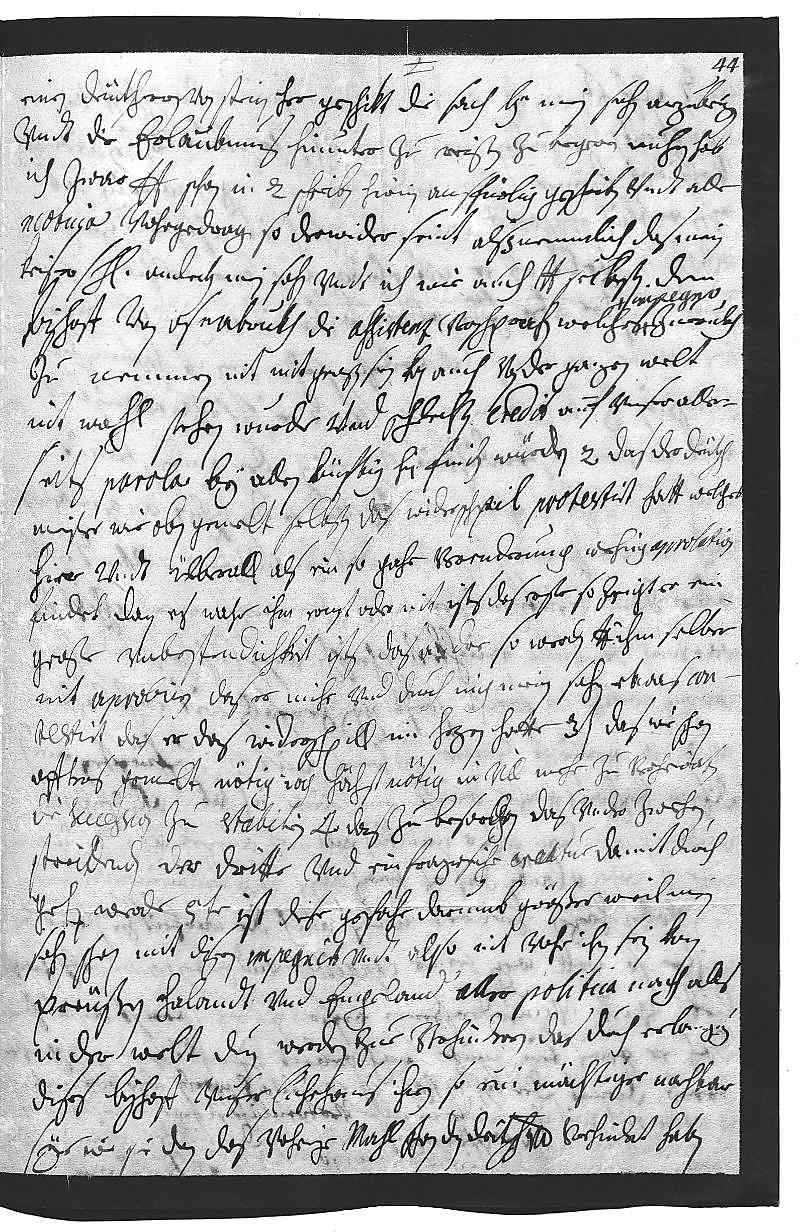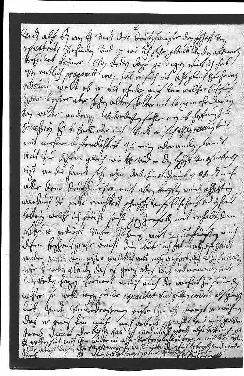 0042einen Deütschern von Stein her geschikt, die sach bey mein sohn anzubringen 0043vndt die erlaubnus hinunter zu reißen zu begeren. Nuhn hab 0044ich zwar dero Liebden schon in 2 schreiben hirin ausfürlig geschriben vndt alle 0045motiua vohrgedragen, so derwider seint, alß nemmlich, das mein 0046Keiser sehliger, anderten mein sohn vndt ich wie auch dero Liebden selbesten dem 0047Bischoff von Osnabrukh die assistenz verschprochen, welches impegno zuerukh 0048zu nemmen nit mit gewißen sein kan, auch vor der ganzen welt 0049nit wohl stehen wurde vnd schlechten credit auf vnser aller- 0050seits parola bey allen könftig hin finden würden. 2 das der Deütsch- 0051meister wie oben gemelt selbsten das widerschpil protestirt hatt, welches 0052hier vndt überall als ein so gahe verenderung wehnig aprobation 0053findet, dan es wahr ihm ernst oder nit. Ists das erste, so zeigt er ein 0054große vnbestendichkeit, ists das andre, so werden dero Liebden ihm selber 0055nit aprobiren, das er mihr vnd durch mich mein sohn etwas con- 0056testirt, das er das widerschpill im herzen hatte. 3ten das, wie schon 0057offters gemelt, nötig iah höchst nötig, in vill mehr zu verheiraten um0058die succession zu stabiliren. 4 das zu besorchen, das vnder zwehen 0059streidenden der dritte vnd ein franzosiche creatur damit durch 0060gehen werde. 5te ist diese gefahr darumb größer, weil mein 0061sohn schon mit disen impegnirt vndt also nit vohr ihn sein kan, 0062Preüßen, Halandt vnd Engeland aller politica nach alls 0063in der welt duen werden zue verhinderen, das durch erlangung 0064dises bischoff vnser cuhrhaus ihnen so ein mächtiger nachbar 0065seye, wie sie dan das vohrige mahl schon den Deutschmeister verhindert haben.