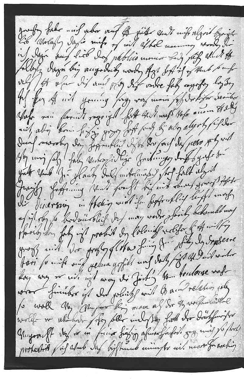 0019geweßen, habe mich aber auf dero Liebden gütte vndt mihr alzeit erzeigte 0020lieb verlaßen, dasie mihr es nit übel nemmen werden, die 0021ich dazu aus lieb des publico, meiner beden söhn vndt dero Liebden 0022selbsten dazu bin angedriben worden. Jezt hoff ich es vmb so mehr, 0023als dero Liebden ohne dis auch schon dise ordre haben ergehen laßen. 0024Ich kan dero Liebden nit genung sagen, was mein sohn, der Keiser, darüber 0025vohr ein freüdt erzeiget hatt, vndt waß vohr ruem dero Liebden dadurch 0026nit allein beim hisigen ganzen hoff, sondern bey allen alijrten sich dar- 0027durch erwerben, dan hoffentlich dißes der sach das peso geben wirt. 0028Von mein sohn haben vnterschidlige zeitungen, deils gahr zu 0029gutt vmb zu glauben, deils mitelmäßich, steh halt alzeit 0030zwischen hoffnung vndt forcht, bis nitt etwas gewiß erfahre. 0031Die diuersion in Italien wirt ihm hoffentlich luft machen, 0032es ist eben so bedrüeblich, das man weder schreiben bekombt noch 0033schreiben kan. Haben izt probirt, den Colonitsch, welcher bey dero Liebden wirt sein 0034geweßen, mit der großen flota hinein zue schiken, dan der secre- 0035tari, so mihr auf Genua geschikt, noch dorten sizt vnd nit weiter 0036kan, wan er nit izt, wan die zeitung vom Toulouse wahr 0037were, hinüber ist. Der Golnitsch wirt dero Liebden auch relation geben 0038so woll von vnsrer kleinen mam als der von Wolfenbüttel, 0039welche er allebede sehen solle. Indeßden hatt der Deütschmeister, 0040vngeacht, das er in seiner hiesigen ahnwehsenheit gegen mich so starkh 0041protestirt, sich vmb das Bischtumb Münster nit mer zu arbiren,