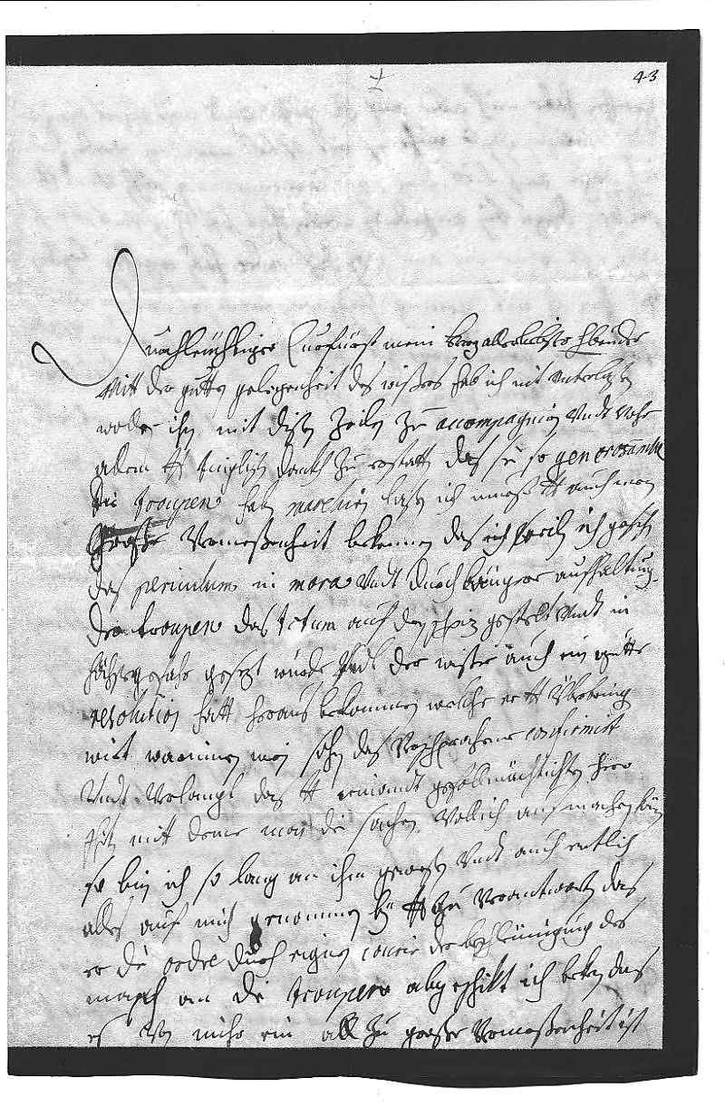 0001Durchleüchtiger Curfürst, mein herzallerliebster herr bruder 0002Mitt der gutten gelegenheit des Wißers hab ich nit vnterlaßen 0003wollen, ihn mit dißen zeilen zu accompagniren vndt vohr 0004allem dero Liebden iniglisten dankh zu erstatten, das sie so generosamente 0005die troupen haben marchiren laßen. Ich mueß dero Liebden auch mein 0006große vermeßenheit bekennen, das ich, weilen ich gesehn, 0007das periculum in mora vndt durch längere aufhaltung 0008der troupen das totum auf den schpiz gestelt vndt in 0009höchste gefahr gesezt würde, vndt der Wißer auch ein gutte 0010resolution hatt heraus bekommen, welche er dero Liebden überbringen 0011wirt, warinnen mein sohn das verschprochene confirmirt 0012vndt verlangt, das dero Liebden iemandt gefollmächtichten hier 0013schiken, mit deme man die sachen vollich ausmachen könne, 0014so bin ich so lang an ihm geweßen vndt habe auch entlich 0015alles auf mich genommen, bey dero Liebden zu verantworten, das 0016er die ordre durch eignen courir der beschleünigung des 0017marsch an die troupen abgeschikt. Ich beken, das 0018es von mihr ein all zu großer vermeßenheit ist