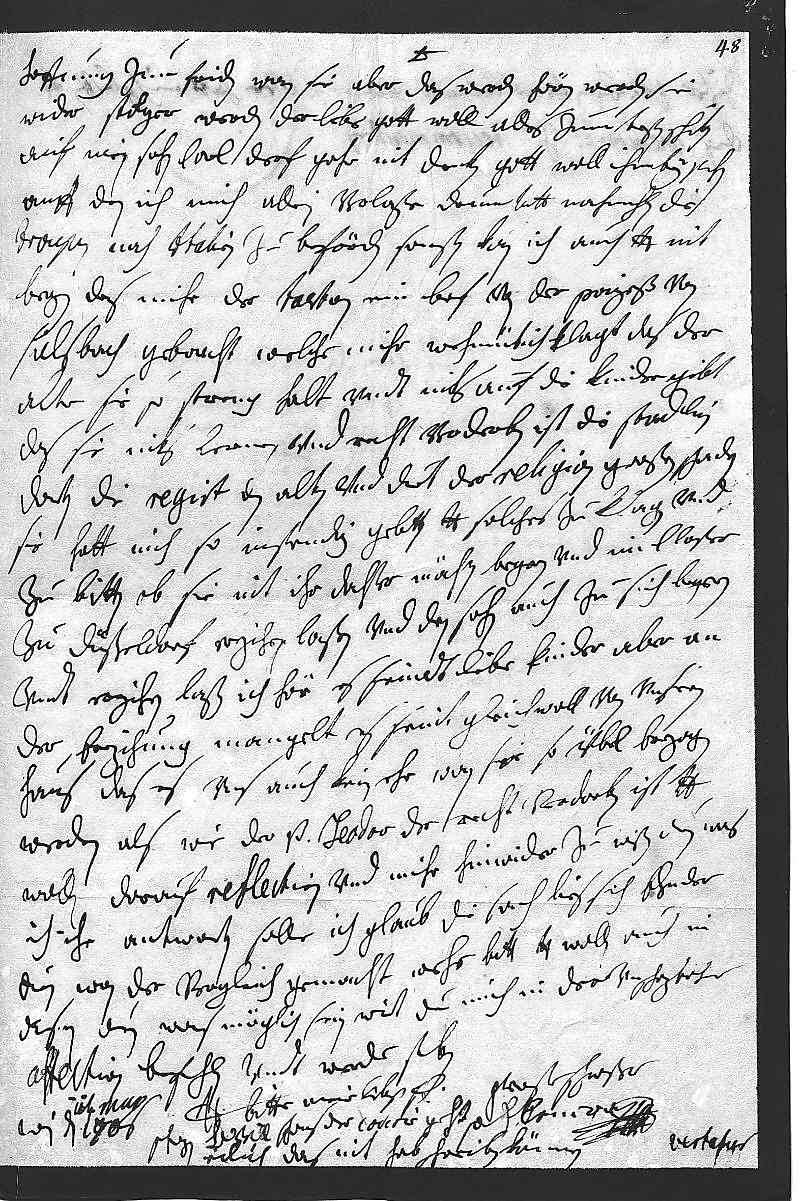 0042hoffnung zum friden, wan sie aber das werden hören, werden sie 0043wider stolzer werden, der liebe gott woll alles zum besten schiken. 0044Auf mein sohn Carl derf gahr nit denken, gott woll ihm bey stehn, 0045auff den ich mich allein verlaße, drum bitt nachmahlen, die 0046troupen nach Italien zu befördern. Sonsten kan ich auch dero Liebden nit 0047bergen, das mihr der Taston ein brif von der Prinzeß von 0048Sulsbach gebracht, welche mihr wehmütich klagt, das der 0049alte sie so streng halt vndt niks auf die kinder gibt, 0050das sie niks lernen vnd recht verderben, ist die Stadlin 0051dorten, die regirt den alten vnd duet der religion großen schaden. 0052Sie hatt mich so instendig gebetten, dero Liebden solches zu klagen vnd 0053zu bitten, ob sie nit ihr dochter möchten begern vnd im closter 0054zu Düßeldorf erzihen laßen, vnd den sohn auch zu sich begern 0055vndt erzihen laßen. Ich hör, es seindt libe kinder, aber an 0056der erzihung mangelt es, seint gleichwoll von vnsern 0057haus, das es vns auch kein ehr, wan sie so übel erzogen 0058werden als wie der Prinz Teodor, der recht verdorben ist. Dero Liebden 0059wollen darauf reflectiren vnd mihr hinwider zu wißen dun, was 0060ich ihr antworten solle, ich glaub die sach lies sich ehnder 0061duen, wan der vergleich gemacht wehr, bitt, dero Liebden wollen auch in 0062disen dun, was möglich sein wirt. Du mich in der vnschezbahr 0063affection befehlen vndt werde sterben 0064dero Liebden 0065getrewste schwester 0066Eleonora 0067Wien den 11ten maij 1706 0068Bitte meiner libste fraw 0069schwegrin vill schons, der courir geht 0070gleich, das nit hab schreiben können. 0071vertatur