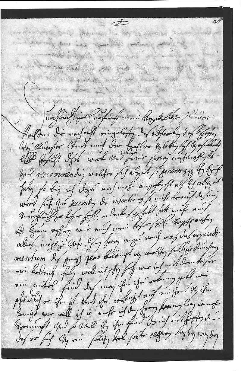 0001Durchleüchtiger Curfürst, mein herzallerlibster herr bruder 0002Nachdem die nachricht eingeloffen des absterben des Bischoffen 0003von Münster vndt mich der Herzoch Carl von Lottring, Bischof von Osnabrukh 0004Liebden, ersucht, dises werk vnd seine person nochmahlen dero Liebden 0005zue reccommendiren, welche sich alzeit so generos gegen ihn erzeicht 0006haben, so bin ich dazu noch mehr angefrischt, als ich allzeit 0007werd suchen zu seccondirn die intentiones, so mihr bewust, das mein 0008vnuergleichliger Keiser sehligen andenkens gehabt hatt, mihr auch 0009dero Liebden zum offtern, wie auch mein Keiser sehlig, verschprochen, 0010alles möglige vohr disen herrn anzu wenden. Was das impendi- 0011mentum des gewißen Zeno belangt, an welchen selbige dumheren 0012ein bedenken haben, will ich schon sehn, wie ich mit dem Keiser 0013ein mitel find, das man ihm zu erkennen gibt, wie 0014schädlich er ihm ist vndt ihn wehnigst auf ein zeit von ihm 0015bringt, wie woll ich, ie mehr ich den herrn kennen lern, ie mehr 0016vernunft vnd so vill ihn ihm find, das ich nit hoffen due, 0017das er sich von ein solchen kerl solte regiren laßen. Wan den