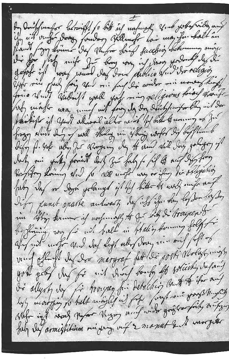 0018den Deütschmeister betrifft, so bitt ich nachmahlen, vmb gotteswillen auf 0019ihn nit anzu dragen, sondren villmehr, wie man ihm balt in 0020standt sezen könne, das vnser hauß sucession bekommen möge. 0021Die har stehn mihr zu berg, wan ich daran gedenkh, das die 0022gefahr ist, was wurd das dem publico vnd der religion 0023vohr ein schaden sein vnd ein sach, die wider ein newes kriegs 0024feür vndt villeicht woll gahr einen religions kriech veruhr- 0025sachen möchte. Man mues nit feiren, dan der Deütschmeister eben nit der 0026stärkiste ist vndt alleweil älter wirt, ich bitte, dero Liebden nemmen es zu 0027herzen vndt duen es woll überlegen. Im übrigen wehrs dis bischtumb 0028disen Prinzen vohr allen zue vergunnen, dan dero Liebden auch vill dran gelegen ist, 0029dorten ein gutten freündt dorten zu haben, so sich dero Liebden auf disen heren 0030versichern können vnd so vill mehr, wan er ihnen die obligation 0031habe, das er dazu gelangt ist. Ich bitte, dero Liebden wollen mihr auf 0032disen punct aparte antworten, das ichs ihm kann leßen laßen. 0033Im übrigen komme ich nochmahlen, dero Liebden zu bitten, die troupen zu 0034beschleünigen, wan sie nit balt in Italien kommen, helfen sie 0035vns nit mehr, vnd doch ligt alles dran. Im Reich steht es 0036auch schlecht, so das der Margraf hatt die posti verlaßen müeßen, 0037gott gebs, das sie nit durch brechen. Dero Liebden solicitirn doch auch 0038die allijrten, das sie troupen hin detachiren vndt dero Liebden ihre auch 0039laßen marschiren so balt möglich, ich sehe sonst ein groß vnglükh 0040vohr. Izt werden vnsere vngren auch wider größere seiten aufezien, 0041haben das armistitium eingangen auf 2 monat vndt ware gutte