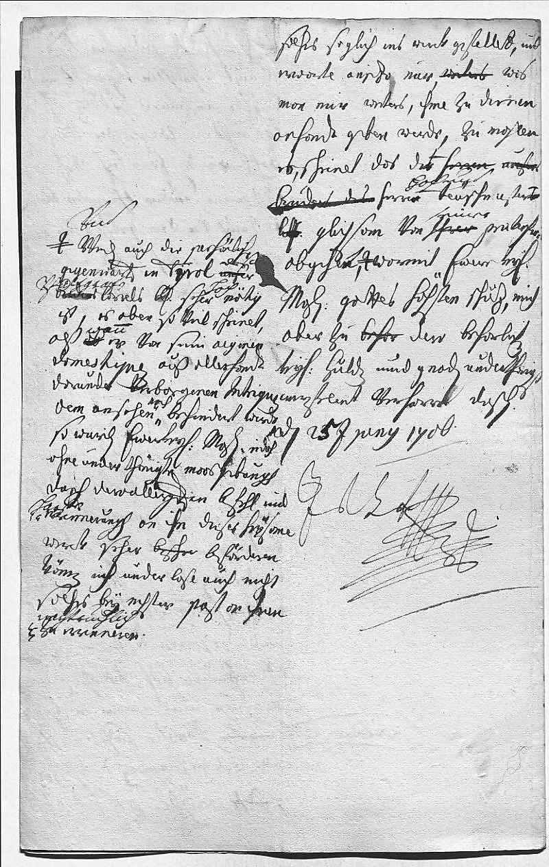 Graf Kollonitsch hat EMTs Brief vom 20. Mai überbracht und von seinem Besuch bei der Tochter seines Bruders Karl (Philipp) und bei der Prinzessin von Wolfenbüttel berichtet. JW denkt, dass es keine bessere Partie als die Prinzessin von Wolfenbüttel gibt. Herzog Anton Ulrich von Wolfenbüttel hat JW gebeten, dass im Fall einer positiven Entscheidung ein gelehrter, moderater und diskreter Mann mit ihrer Information (im katholischen Glauben) beauftragt wird. – Hat das vom Herzog von Lothringen gewünschte Empfehlungsschreiben für den Bischof von Osnabrück an die Generalstaaten der Vereinigten Niederlande, das Domkapitel von Münster und verschiedene Domherren geschrieben. – Wird seinen Bruder, den Pfalzgrafen Karl (Philipp) nachdrücklich erinnern, dass seine Gegenwart in Tirol nötig ist.