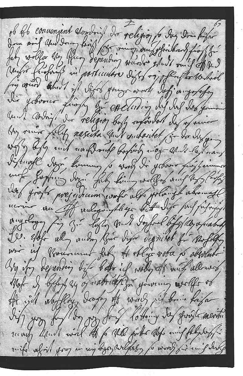 0041ob es conuenient, vordrist der religion, so dan dem Keiser, 0042dem Reich vnd denen kreißen seye, einen ausschreibenden Fürsten zu 0043haben, welcher von ihnen dependiren wurde, vndt auch für dero Liebden vnd 0044vnser curhauß in particulare dißes ein schlechter vorteil 0045sein wurd. Vndt ist dises ganze werkh dahin angesehen, 0046die geborne fürsten zu excludiren, dah doch das gemeine 0047vndt vodrist der religion besten erfördert, das es einer 0048von einer solchen nascita vndt autoritet seye, der das gemein 0049weßen besten mit nachdrukh befördern möge, vndt last mans 0050dismahl dazu kommen, so werden die geborne fürsten nimer 0051mehr hoffnung dazu haben können, welches auch vnsern curhaus 0052das gröste prejudicium wehr. Also gelanget abermahl 0053meine an dero Liebden anlegenstlige bitt, dise sach sich eifrigt 0054angelegen sein zu laßen vndt den herrn Bischoff von Osnabrukh 0055Liebden vohr allen andren zue diser diginitet zu verhelfen. 0056Wie ich vernemme, haben dero Liebden etlige vota, so absolute 0057von ihnen dependiren, dise, bitte ich, wollen dero Liebden auf alleweis 0058vohr den Bischoffen von Osnabrukh zu gewinnen suchen, welche es 0059dero Liebden nit abschlagen derfen. Dero Liebden werden sich beim Keiser, 0060disen ganzen haus und den ganzen haus Lottring das gröste meritum 0061machen, vndt weil dero Liebden so vill gütte vohr mich haben, das sie 0062mihr alzeit gern in mein begern wilfahren, so werden sie mich dardurch
