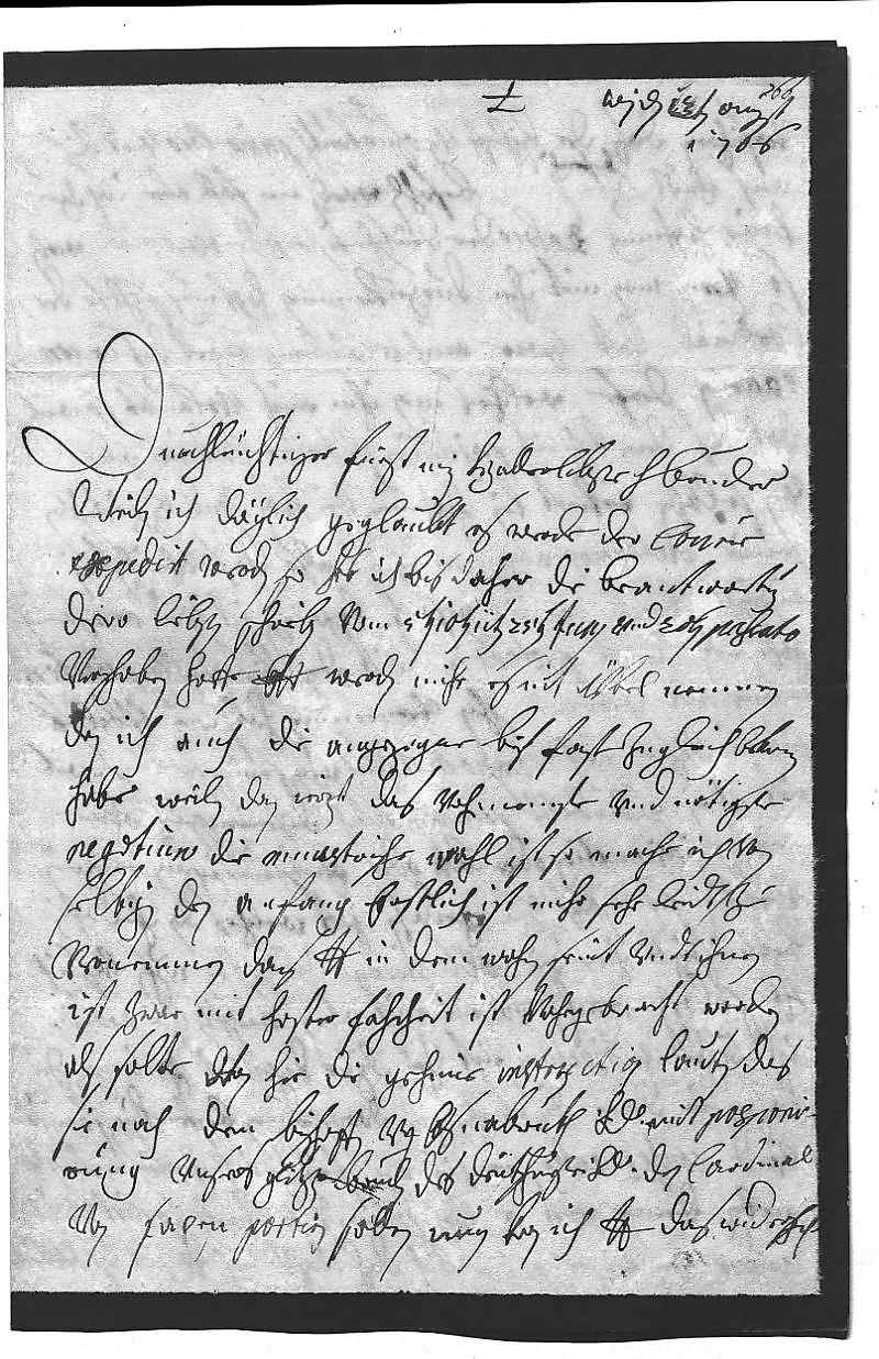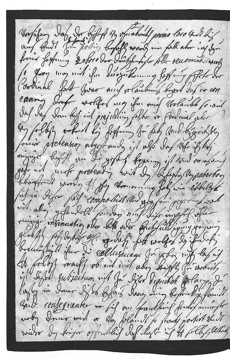 0018versichern, das der Bischoff von Osnabrukh primo loco vndt bis 0019ans endt bestendig zu portiren befohlen worden, im fall aber iah dazu 0020keine hoffnung, 2o loco der Deütschmeister solle reccomendirt werden, 0021so vern man mit ihm durchzukommen hoffnung sehete. Der 0022Cardinal hatt zwar auch erlaubnus begert, das er con- 0023couriren derfe, welches man ihm auch verlaubt, so weit 0024doch, das dem Bischof nit prejudiciren solte, er, Cardinal, aber 0025von selbsten erkent hat, kein hoffnung zu haben vnd beyzeiten von 0026seiner pretension abgestanden ist, also das vohr ihn kein 0027einziger befehl an die gesanten ergangen ist vnd er es auch 0028gahr nit mehr pretendirn wirt. Den Bischoffen von Paterborn 0029betreffendt werden dero Liebden schon vernommen haben, wie übel er 0030sich in diser sach comportirt vnd gegen sein gegebnes wort 0031nit allein gehandelt, sondren auch dise impfel ohne 0032einzige insinuation oder bitt oder entschuldigung gegen mein 0033gliebsten sohn, den Keiser Mayestät, gedahn hatt, welches dan ihndahin 0034bemüeßiget, ihne die exclusiuam zu geben. Nuhn las ich 0035dero Liebden selbsten erachten, ob nit mit allen krefften zu arbeiten 0036ist, dißes subjectum nit zu dißer dignitet gelangen zu 0037laßen, in deme dißes erzhaus daran einen bestendigen feindt hätte0038vnd consequenter er sich an Frankhreich henken müeste. 0039Neben deme wirt er von Holandt so starkh portirt vndt 0040wider den Keiser offentlich, dah laße ich dero Liebden selbsten vrteilen,
