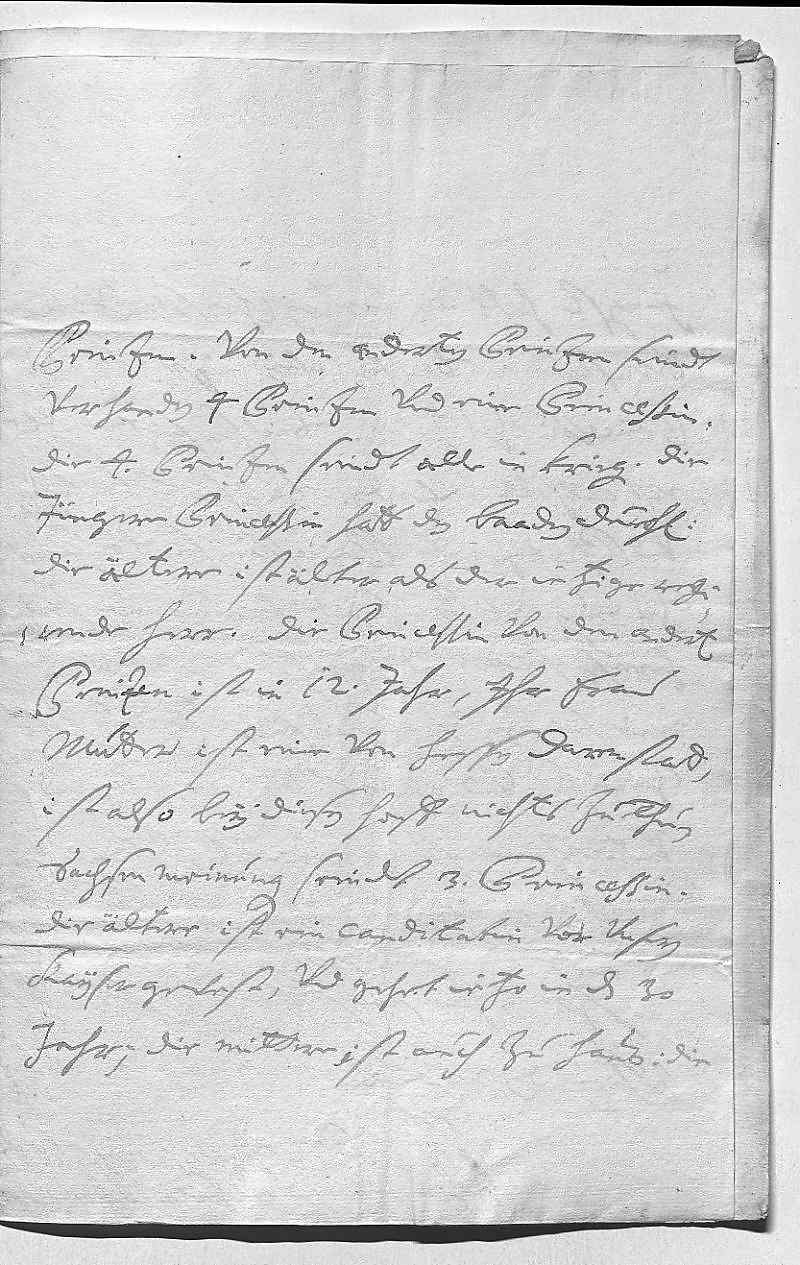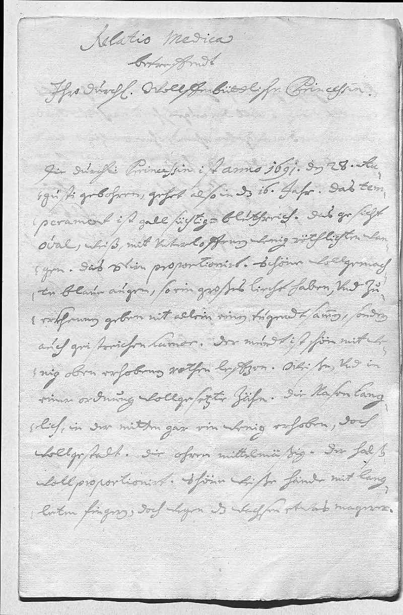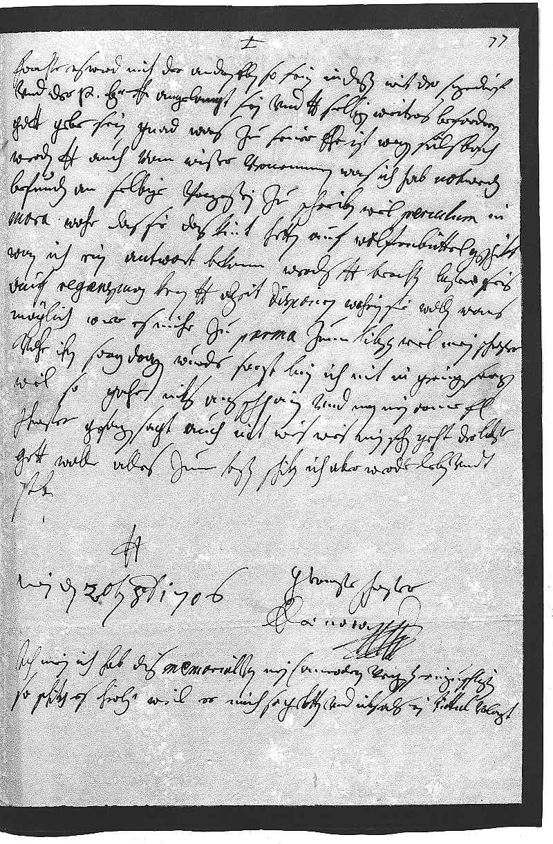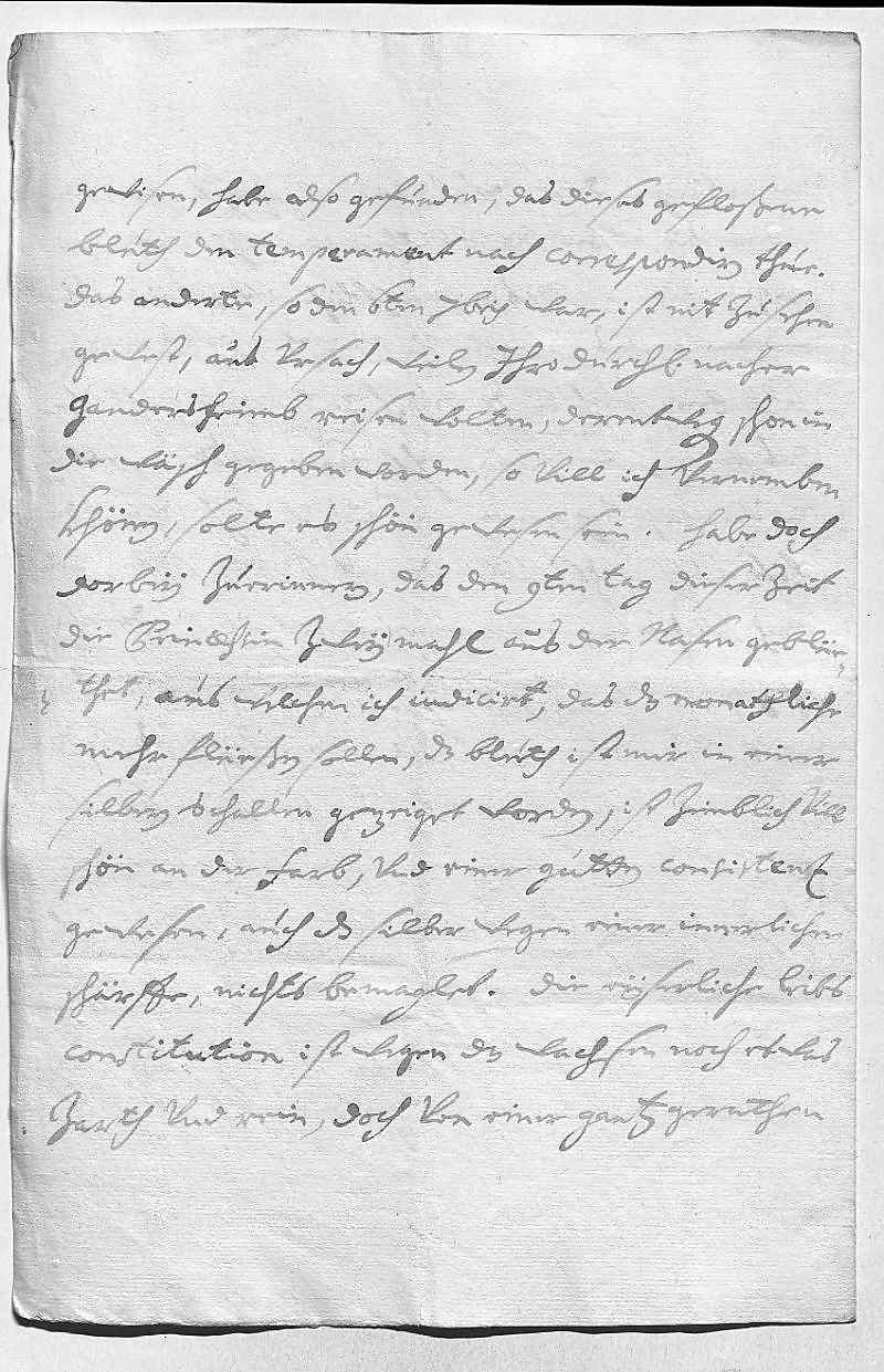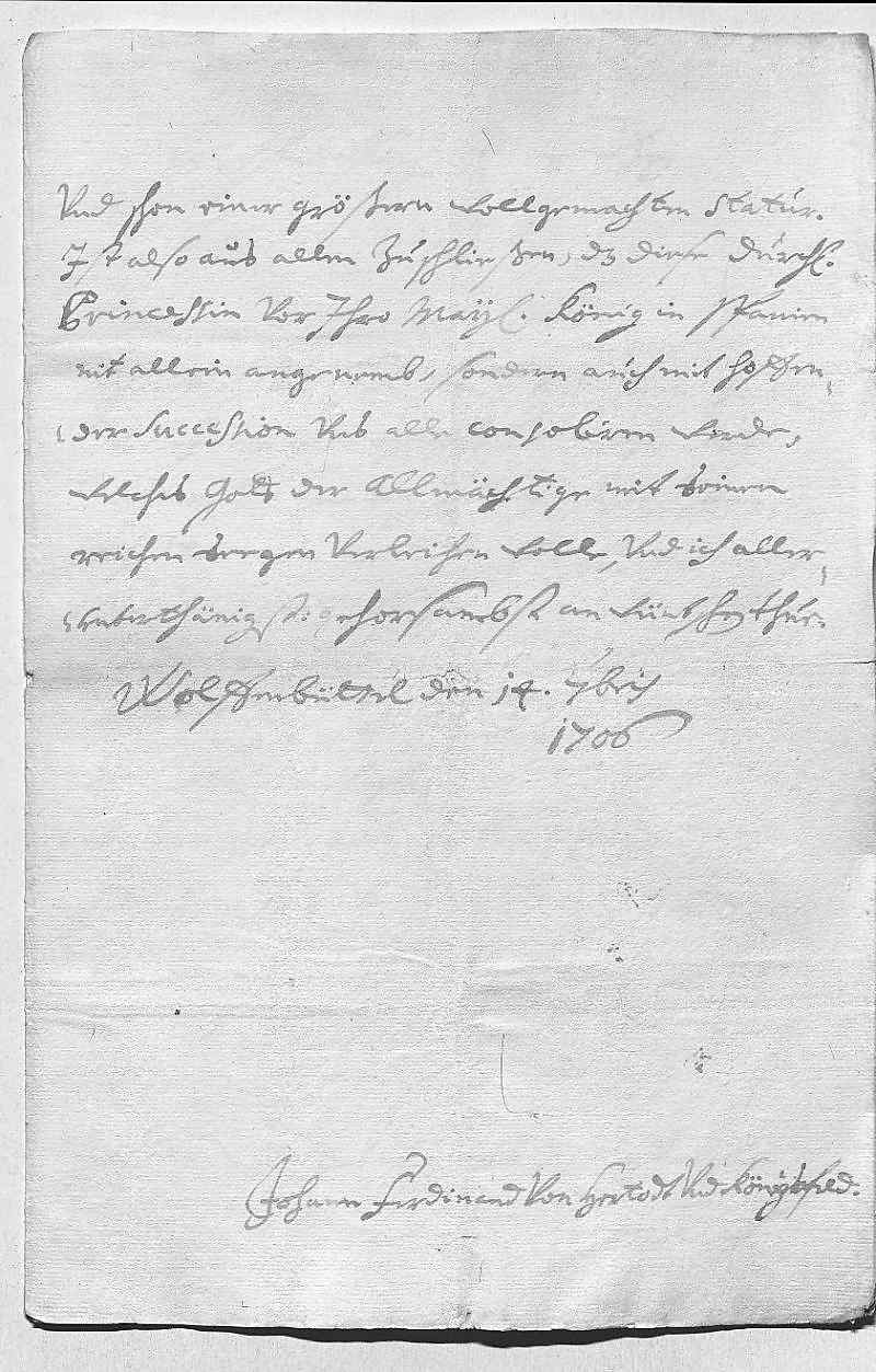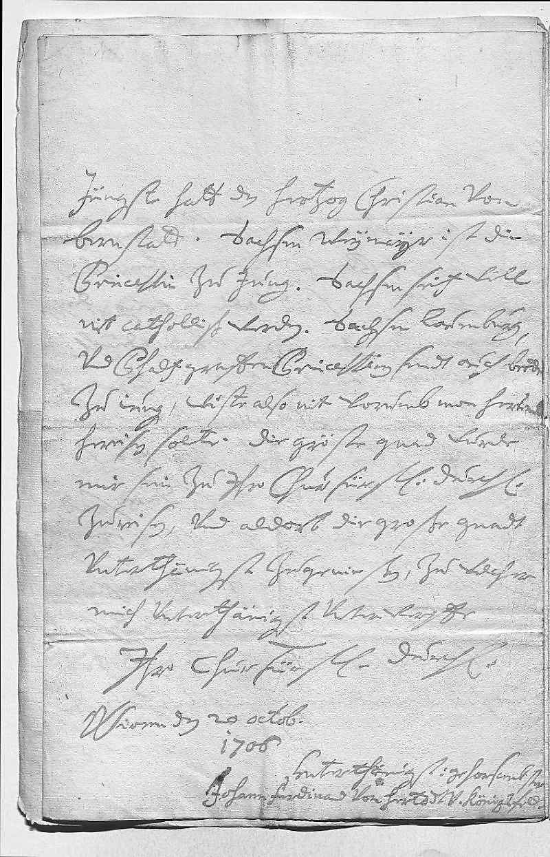 0041Forchte, es werd mit der andren eben so sein. In deßen wirt der Sinzendorf 0042vnd der Pater bey dero Liebden angelangt sein vnd dero Liebden selbigen weiters beforderen, 0043gott gebe sein gnad und was zu seiner ehr ist. Wegen Sulsbach 0044werden dero Liebden auch vom Wißer vernemmen, was ich hab notwendig 0045befunden an selbige Prinzeßin zu schreiben, weil periculum in 0046mora wahr, das sie das kint hetten auf Wolfenbüttel geschikt, 0047wan ich ein antwort bekomm, werds dero Liebden berichten. Laßen sies 0048auf Regenspurg, kenen dero Liebden alzeit disponiren, wohin sie wollen, wans 0049möglich, wier es mihr zu Parma zum libsten, weil mein schwester 0050vohr ihn sorg dragen wurde. Sonst bin ich nit in geringen sorgen, 0051weil so gahr niks aus Schpanien vnd man mein arme fraw 0052schwester gefangen sagt, auch nit weis, wies mein sohn geht, der liebste 0053gott wolle alles zum besten schiken. Ich aber werde leben vndt 0054sterben 0055dero Liebden 0056getrewste schwester 0057Eleonora 0058Wien den 20ten octobris 1706 0059Ich mein, ich hab dis memorial von mein camerdiener vergeßen einzuschlißen, 0060so schikh es hirbey, weil er mich so gebetten vnd niks als ein tittul verlangt.