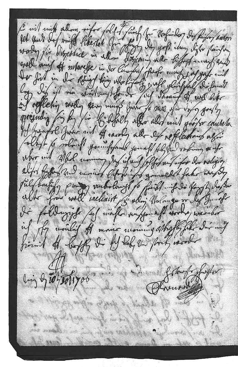 0059sie nit mitt allem eifer solches suechen zu verhindern, des Keisers autori- 0060tet vndt des Reichs libertet zu schuzen, dann geht innen diser streich an, 0061werden sie dispotice in allem disponiren, alle bischoff machen vndt 0062woll auch dero Liebden interesse in der cursach schwehr machen, jah gahr mit 0063der zeit in die römisch könig oder keiserlige wahl gleichfals die handt 0064legen. Dis ist ein weitaußehende sach, darauf dero Liebden woll, bitte 0065ich, refflectiren wollen, man mueß zwar, so vill ohne disen großen 0066prejudiz sein kan, sie beybehalten, aber alles mit größer cautela. 0067Ich zweifel zwar nit, dero Liebden werden alle dise refflectiones, alsie 0068selbst so erleücht, genuchsamb gemacht haben vnd erkennen, mihr 0069aber nit übel nemmen, das ich auch solches aus eifer der religion, 0070dises erzhaus vnd meines cuhrhauses gemeldet habe. Was den 0071sulsbachischen Prinzen anbelangt, so schreibt mihr die Prinzessin, das der 0072alte herr woll inclinirt sey, allein verlange er, das zuuohr 0073die feldenzische sach möchte ausgemacht werden, warüber 0074ich schon neülich dero Liebden meine meinung überschrieben habe. Due mich 0075hirmit dero Liebden befehlen, die ich leben vnd sterben werde 0076dero Liebden 0077getrewste schwester 0078Eleonora 0079Wien den 10ten decembris 1706