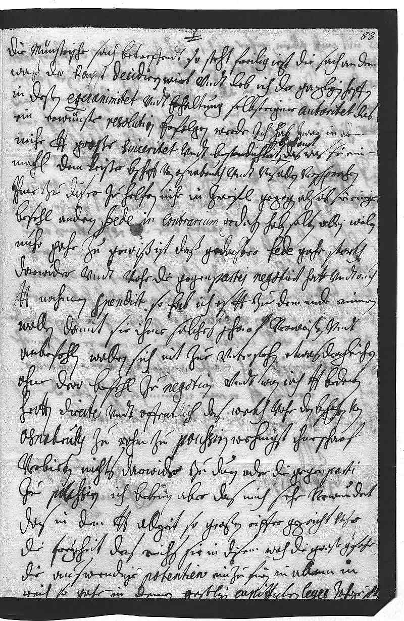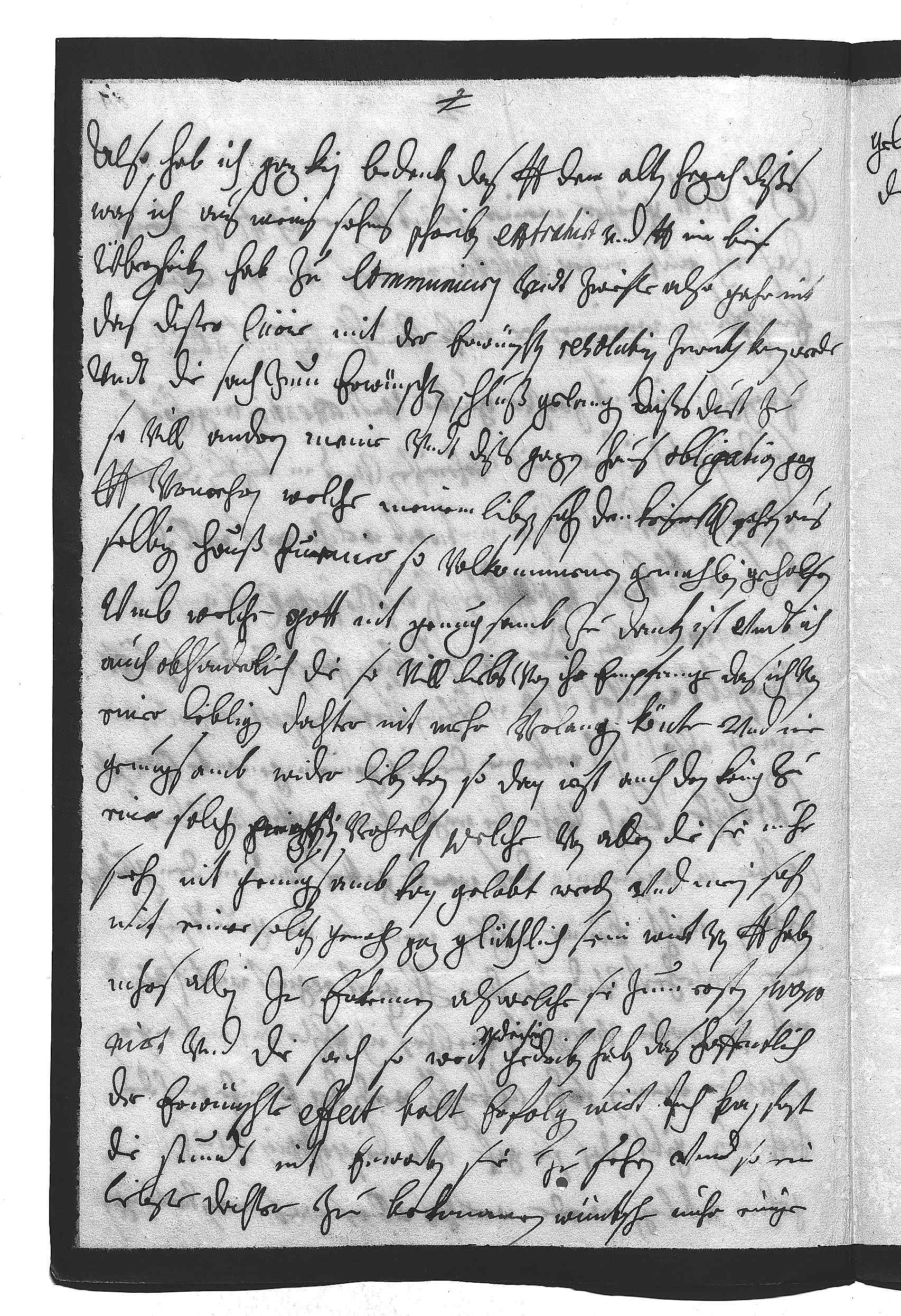 0001Durchleüchtiger Curfürst, mein herzallerlibster herr bruder 0002Dero libs schreiben mitt dem courir hab ich woll empfangen, 0003woraus ich mit freüden ersehe den continuirenden eifer, so 0004dero Liebden dragen in der wolfenbuttelischen sach. Ich bin überaus conso- 0005liert, das die Prinzessin mit solcher atention die information vnsers 0006glauben annemen duet, bitte gott vndt hoffe, dauon den 0007erwüntschen effect vndt das die propositions, so mihr 0008dero Liebden berichten, das von Schweden geschen könten oder wurden, solche gutte 0009intention nit verhindern möchte, zuuodrist diße so edle 0010vndt liebste dugentlige sehl, welche der rat vndt alle, 0011die sie nuhr gesehen, nit genuechsam loben können, 0012zu gewinnen. So dann auch, weil ich gutte dispositiones 0013in mein sohn sehe vndt hoffe, wan die relationes werden 0014hinein kommen, insonderheit wan die sach dahin könte 0015eingericht werden, das sie heimlich vnser religion
