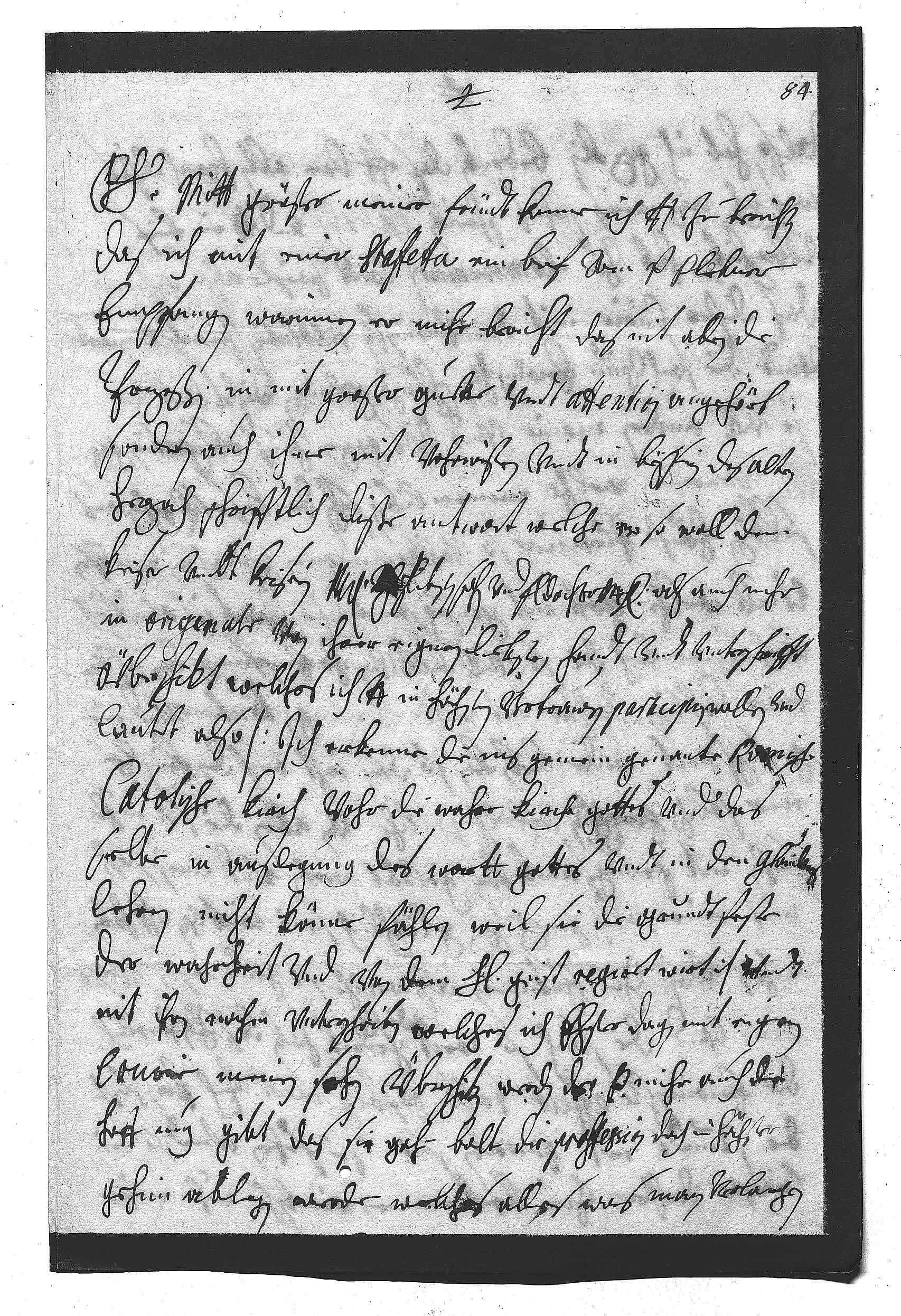 0080Postscriptum Mitt gröster meiner freüdt komme ich, dero Liebden zu berichten, 0081das ich mit einer staffetta ein brif vom Pater Plekner 0082empfangen, warinnen er mihr bericht, das nit allein die 0083Prinzeßin in mit großer guette vndt attention angehört, 0084sondren auch ihme mit vohrwißen vndt in beysein des alten 0085Herzoch schrifftlich diße antwort, welche er so woll dem 0086Keiser vndt Keiserin, mein gelibsten sohn vnd fraw dochter Mayestät, als auch mihr 0087in originale von ihrer eignen liebsten handt vndt vnterschrifft 0088überschikt, welches ich dero Liebden in höchsten vertrawen particpirn wollen. Vnd 0089lautet also (Ich erkenne die ins gemein genante romisch 0090catolische kirch vohr die wahre kirch gottes vnd das 0091selbe in auslegung des wortt gottes vndt in den glaubens- 0092lehren nicht könne fählen, weil sie die grundt feste 0093der wahrheit vnd von dem heiligen geist regiret wirt), vndt 0094mit ihren nahm vnterschriben, welches ich ehster dagen mit eingen 0095courir meinen sohn überschiken werde, der Pater mihr auch die 0096hoffnung gibt, das sie gahr balte die profession, doch in höchster 0097geheim, ablegen werde, welches alles, was man verlangen kann.