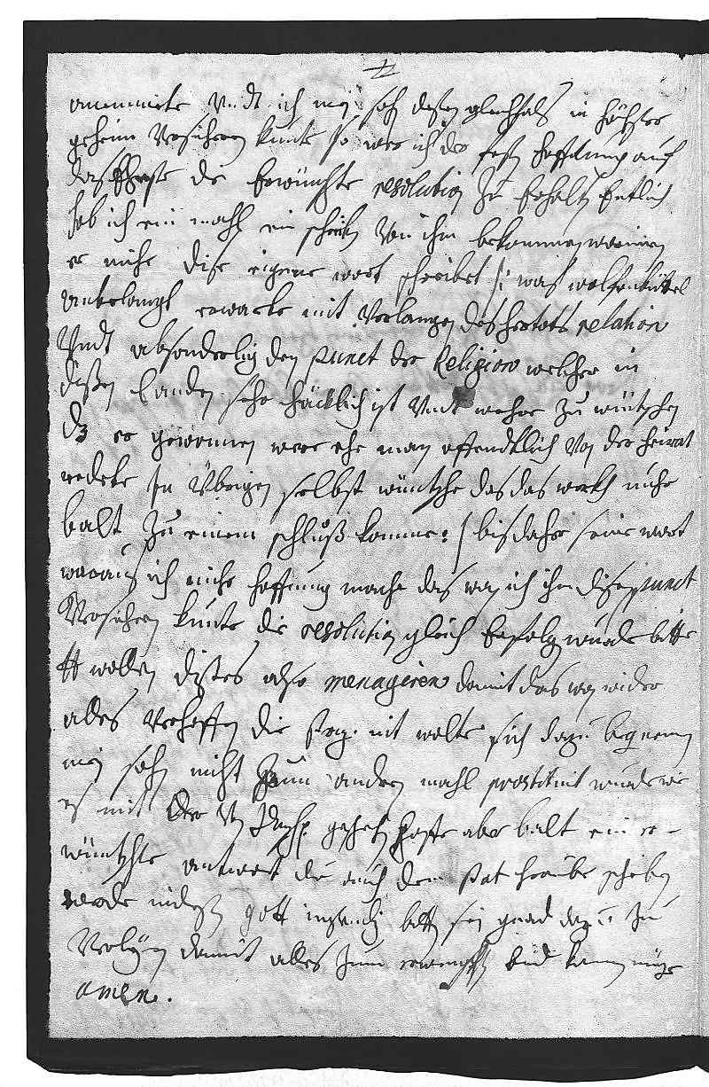 0016anemmete vndt ich mein sohn deßen gleichfals in höchster 0017geheim versicheren kunte, so wer ich der festen hoffnung, auf 0018das eheste die erwünschte resolution zu erhalten. Entlich 0019hab ich ein mahl ein schreiben von ihm bekommen, worinnen 0020er mihr dise eigene wort schreibet (Was Wolfenbüttel 0021anbelangt, erwarte mit verlangen des Hertots relation 0022vndt absonderlig den punct der religion, welcher in 0023dißen landen sehr häcklich ist, vndt wehre zu wüntschen, 0024das er gewonnen were, ehe man offendtlich von der heirat 0025redete, in übrigen selbst wüntsche, das das werkh nuhr 0026balt zu einem schluß komme). Bis daher seine wort, 0027waraus ich mihr hoffnung mache, das, wan ich ihm disen punct 0028versichern kunte, die resolution gleich erfolgen wurde. Bitte, 0029dero Liebden wollen dißes also menagiren, damit das, wan wider 0030alles verhoffen die Prinzessin nit wolte sich dazu bequemen, 0031mein sohn nicht zum andren mahl prostituirt wurde, wie 0032es mit der von Anschpach geschehen. Hoffe aber balt ein er- 0033wüntschte antwort, due auch dem Pater heruber schreiben, 0034werde indeßen gott instendig bitten, sein gnad dazue zu 0035verleyen, dammit alles zum erwunschten end kommen möge, 0036amen.