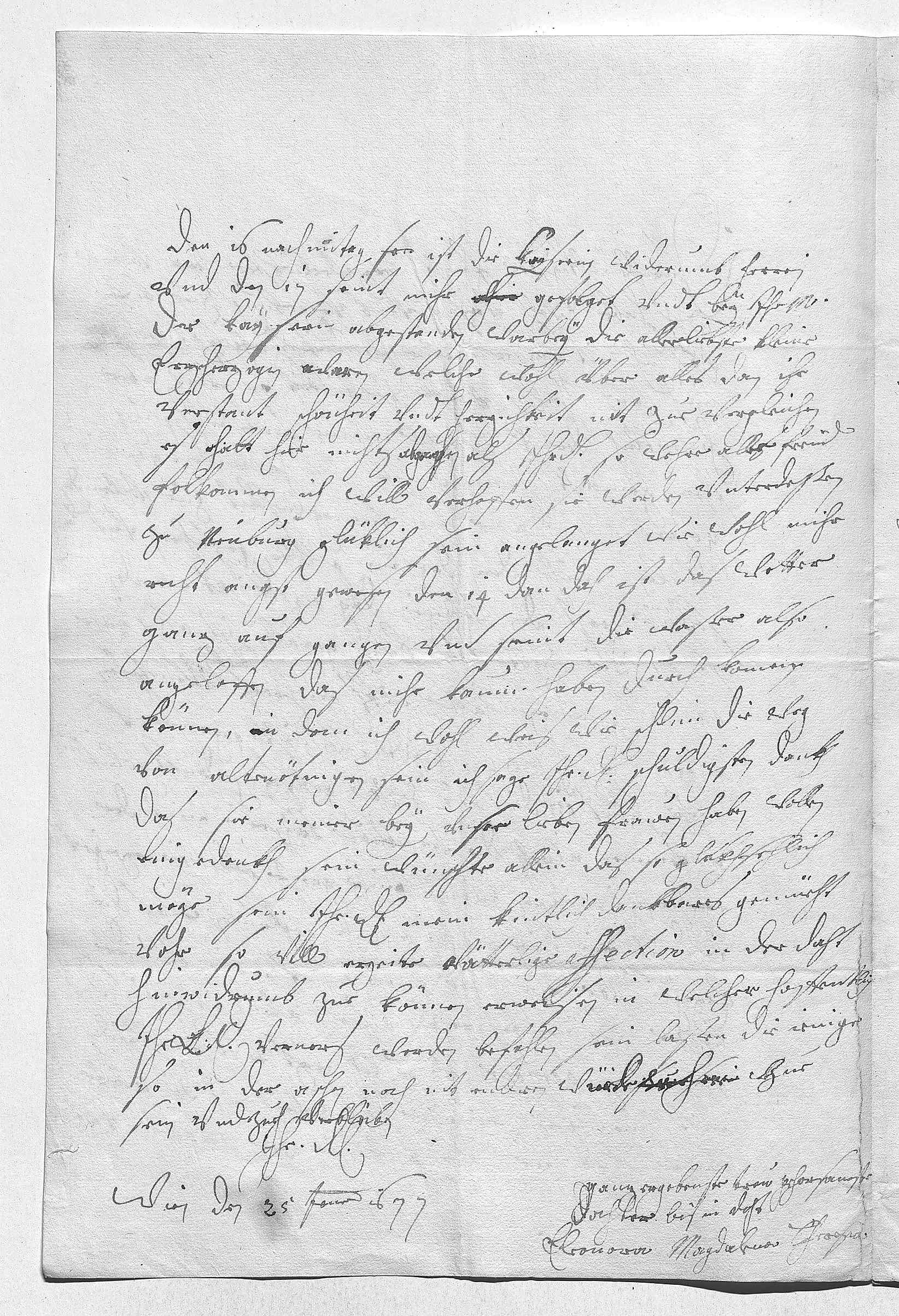 0022Den 16 nachmitag so ist die Kayserin widerumb herrein, 0023vnd den 17 seint mihr alhier gefolget vndt bey ihr Mayestät 0024der Kayserin abgestanden, warbey die allerliebste kleine 0025Erzherzogin ware, welche wohl über alles, dan ihr 0026verstant, schönheit vndt herzichkeit nit zue vergleichen. 0027Es hatt hier nichts abgangen als ihr Durchlaucht, so wehre aller freüd 0028folkommen. Ich will verhoffen, sie werden vnterdeßen 0029zu Neuburg glüklich sein angelanget, wie wohl mihr 0030recht angst gewesen den 14, dan dah ist das wetter 0031ganz auf gangen vnd seint die waßer also 0032angeloffen, das mihr kaum haben durch komen 0033können, in dem ich wohl weis, wie schlim die weg 0034von Altenötingen sein. Ich sage ihr Durchlaucht schuldigsten dankh, 0035das sie meiner bey vnser lieben frawen haben wollen 0036eingedenkh sein, wünschte allein das so glukhsehlich 0037möge sein, ihr Durchlaucht mein kintlich dankbares gemüeht 0038vohr so vill erzeigte vätterlige affection in der daht 0039hinwidrumb zue können erweisen, in welcher hoffentlich 0040ihr Liebden verners werden befohlen sein laßen die ienige, 0041so in der aschen noch nit andres würde suechen zue 0042sein vnd zuh verbleiben 0043ihr Durchlaucht 0044ganz ergebenste trew gehorsamste 0045dochter bis in doht 0046Eleonora Magdalena Theresia 0047Wien den 25 jener 1677