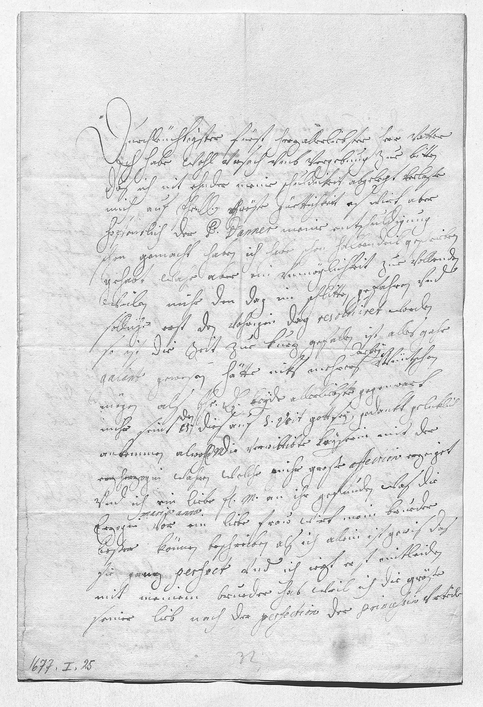 0001Durchleüchtigster Fürst, herz allerliebster herr vatter 0002Ich habe wohl vrsach vmb vergebung zue bitten, 0003das ich nit ehnder meine schuldickeit abgelegt, verlaße 0004mich auf ihr Durchlaucht gröste güettichkeit. Es wirt aber 0005hoffentlich der Pater Danner meine entschuldigung 0006schon gemacht haben. Ich habe schon den halben deil geschrieben 0007gehabt, wahr aber ein vnmöglichkeit zue vollenden, 0008weilen mihr den dag im schlitten gefahren vnd 0009solliches erst den vohrigen dag resoluiret worden, 0010so ist die zeit zue kurz gefallen. Ist alles gahr 0011galant gewesen, hätte niks mehrers darbey wüntschen 0012mögen, als ihr Durchlaucht beyde allerliebste gegenwart. 0013Mihr seint den 15 dies auf Sankt Veit gott sey gedankt geluklich 0014ankommen, alwoh die verwittibte Kayserin mit der 0015Erzherzogin wahren, welche mihr große affection erzeiget 0016vnd ich ein liebe frau mutter an ihr gefunden. Was die 0017Erzherzogin Maria Anna vor ein liebe fraw, wirt mein brueder 0018beßer können beschreiben als ich. Allein ist gewis, das 0019sie ganz perfect vnd ich iezt erst mitleiden 0020mit meinem brueder hab, weil ich die größe 0021seiner lieb nach der perfection der princessin vrteile.