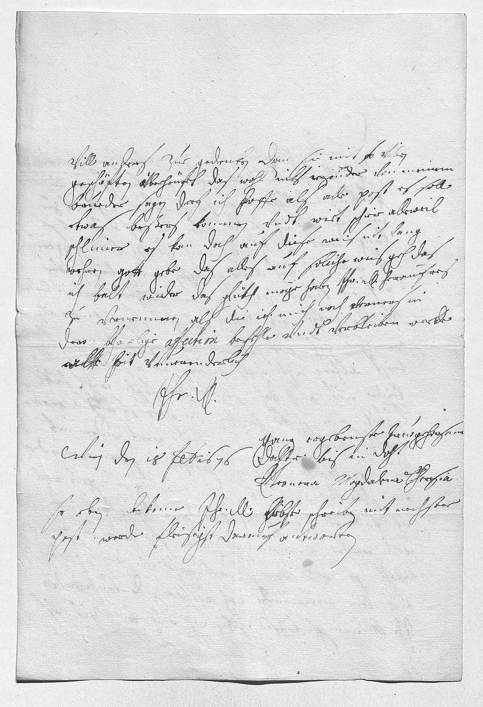 0021vill anders zue gedenken, dan sie mit so villen 0022geschäften überheüfet, das wohl niks iezonder von meinem 0023brueder sagen derf. Ich hoffe als alle post, es solle 0024etwas beßers kommen vndt wirt schier alleweil 0025schlimer. Es kan doch auf diese weis nit lang 0026wehren, gott gebe, das alles auf soliche weis geh, das 0027ich balt wieder das glükh möge haben, ihr Durchlaucht heraufreis 0028zu vernemmen, als die ich mich noch verners in 0029dero beharlige affection befehle vndt verbleiben werde 0030alle zeit vnuerenderlich 0031ihr Durchlaucht 0032ganz ergebenste trewgehorsame 0033dochter bis in doht 0034Eleonora Magdalena Theresia 0035Wien den 18 februarij 16760036So eben bekome ihr Durchlaucht liebste schreiben, mit nechster 0037post werde fleisigst darauf antworten.