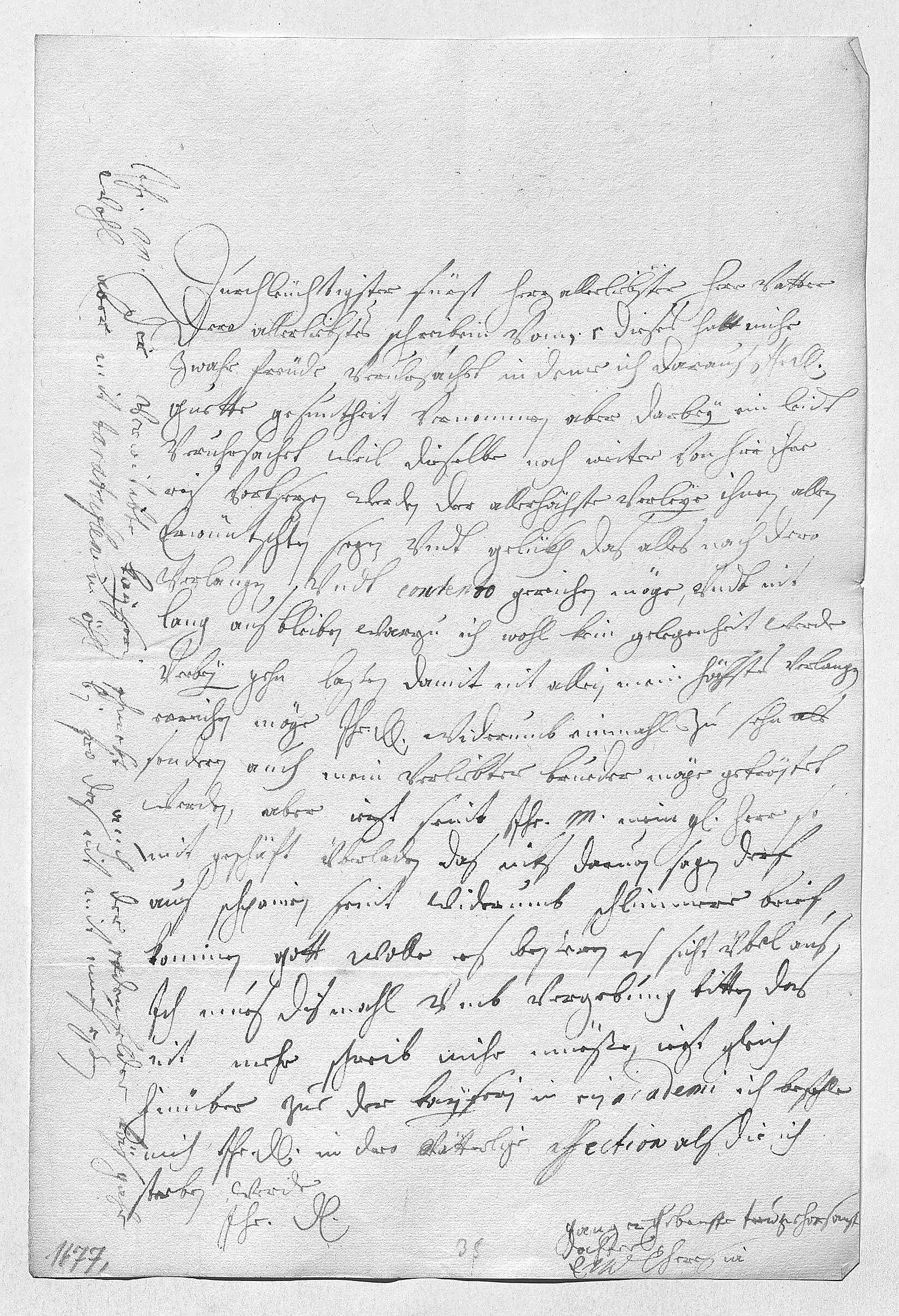 0001Durchleüchtigster Fürst, herz allerliebster herr vatter 0002Dero allerliebstes schreiben vom 5 dieses hatt mihr 0003zwahr freüde veruhrsachet, in deme ich daraus ihr Durchlaucht 0004guette gesuntheit vernommen, aber darbey ein leidt 0005veruhrsachet, weil dieselbe noch weiter von hier ihre 0006reis vortsezen werden. Der allerhöchste verleye ihnen allen 0007erwüntschten segen vndt gelükh, das alles nach dero 0008verlangen vndt contento gereichen möge, vndt nit 0009lang aus bleiben, warzu ich wohl kein gelegenheit werde 0010vorbey gehn laßen, damit nit allein mein höchstes verlangen 0011erreichen möge, ihr Durchlaucht widerumb einmahl zu sehn, als 0012sondern auch mein verliebter brueder möge getröstet 0013werden. Aber iezt seint ihr Mayestät, mein gnädigster herr, so 0014mit geschäft überladen, das niks daruon sagen derf. 0015Aus Schpanien seint widerumb schlimmere brief 0016kommen, gott wolle es beßeren, es sicht übel aus. 0017Ich mues dis mahl vmb vergebung bitten, das 0018nit mehr schreib. Mihr müeßen iezt gleich 0019hinüber zue der Kayserin in ein academi. Ich befehle 0020mich ihr Durchlaucht in dero vätterlige affection, als die ich 0021sterben werde 0022ihr Durchlaucht 0023ganz ergebenste trewgehorsamste 0024dochter 0025Eleonora Magdalena Theresia