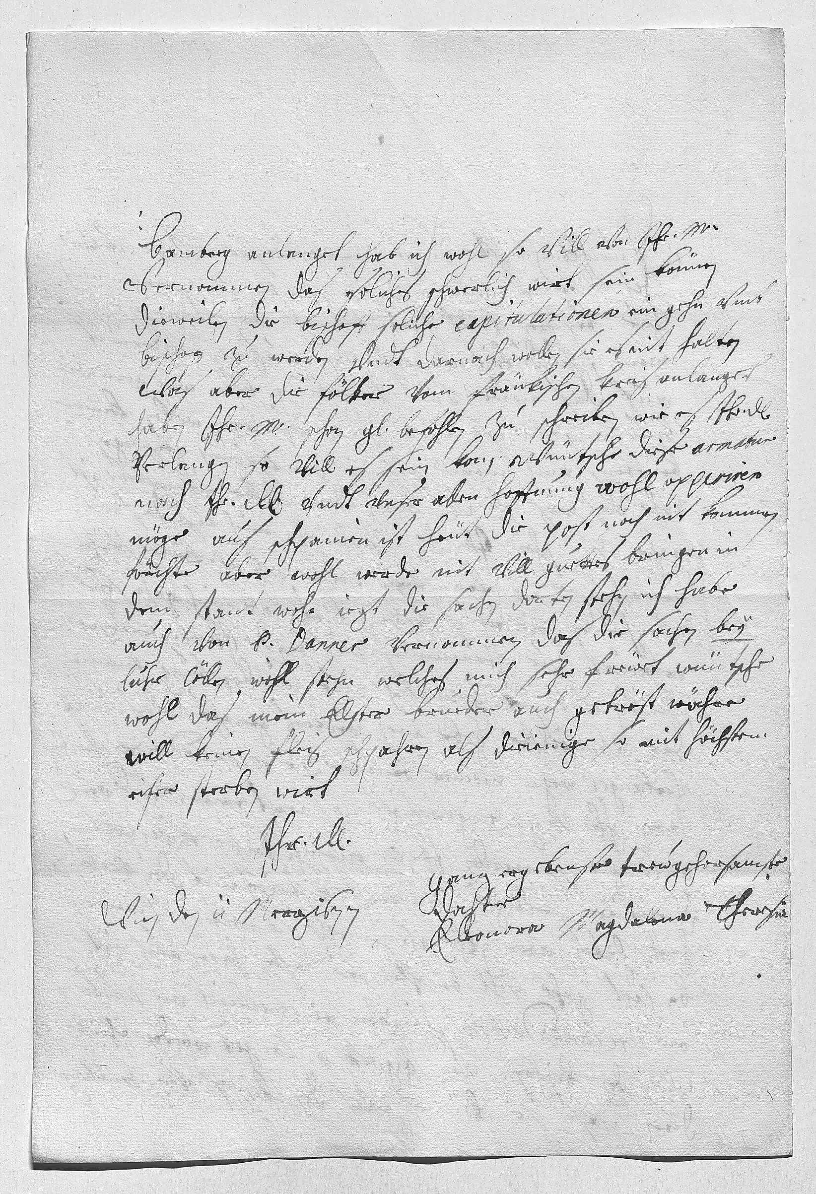 0024Bamberg anlanget, hab ich wohl so vill von ihr Mayestät 0025vernommen, das soliches schwerlich wirt sein können, 0026dieweilen die bischoff soliche capitulationen ein gehn, vmb 0027bischoff zu werden, vndt darnach wollen sie es nit halten. 0028Was aber die fölker vom fränkischen kreis anlanget, 0029haben ihr Mayestät schon gnädigst befohlen zu schreiben, wie es ihr Durchlaucht 0030verlangen, so vill es sein kan. Wüntsche das diese armatur 0031nach ihr Durchlaucht vndt vnser allen hoffnung wohl opperiren 0032möge. Aus Schpanien ist heüt die post noch nit kommen, 0033förchte aber wohl, werde nit vill guettes bringen in 0034dem stant, wohe iezt die sachen dorten stehn. Ich habe 0035auch von Pater Danner vernommen, das die sachen bey 0036Cuhr Cöllen wohl stehn, welches mich sehr frewet. Wüntsche 0037wohl, das mein elster brueder auch getröst währe, 0038will keinen fleis schpahren, als dieienige, so mit höchstem 0039eifer sterben wirt 0040ihr Durchlaucht 0041ganz ergebenste trewgehorsamste 0042dochter 0043Eleonora Magdalena Theresia 0044Wien den 11 merz 1677