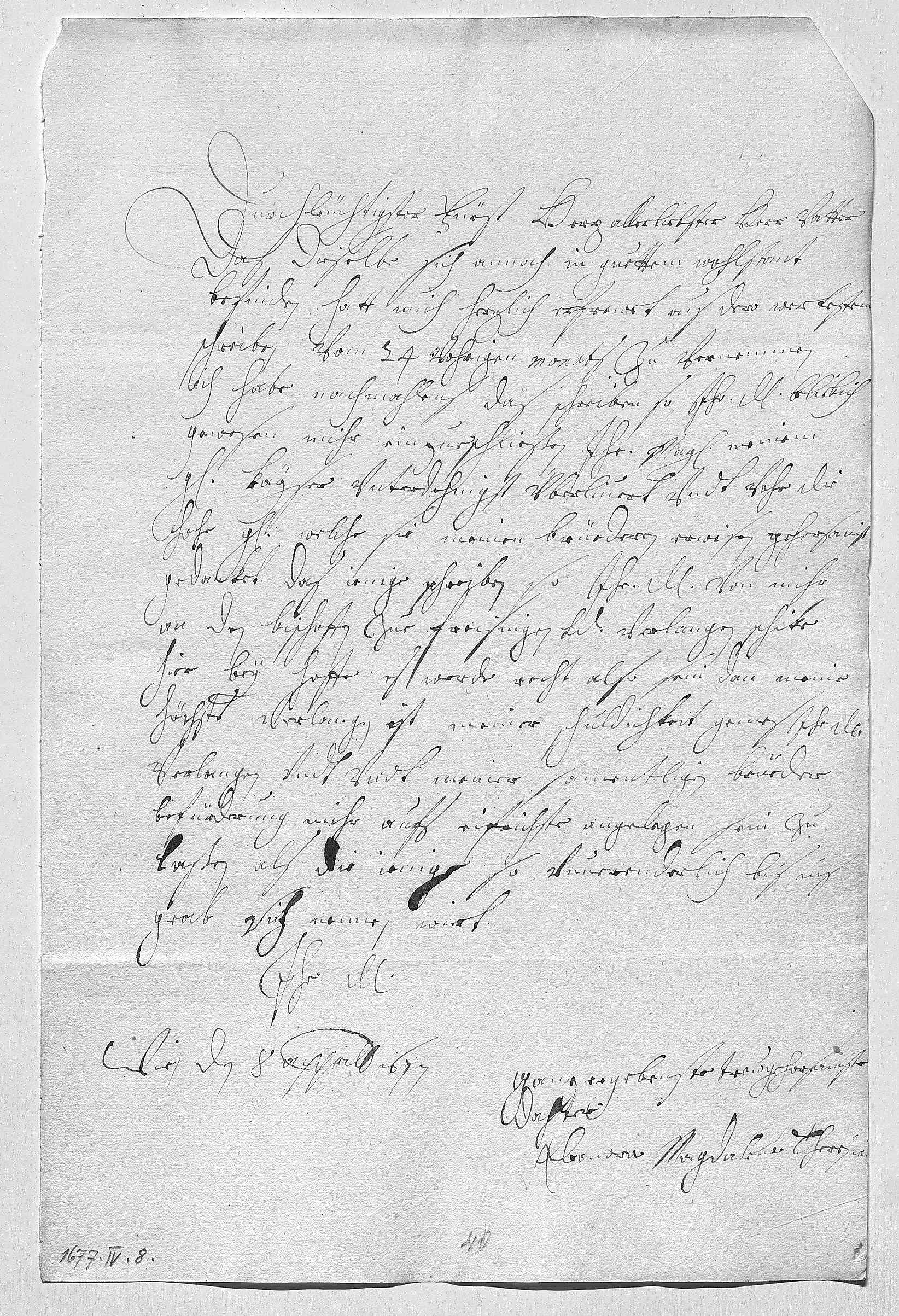 0001Durchleüchtigster Fürst, herz allerliebster herr vatter 0002Das dieselbe sich annoch in guettem wohlstant 0003befinden, hatt mich herzlich erfrewet aus dero wertesten 0004schreiben vom 24 vohrigen monats zu vernemmen. 0005Ich habe nachmahlens das schreiben, so ihr Durchlaucht bliebich 0006gewesen mihr einzueschließen, ihr Mayestät, meinem 0007gnädigsten Kayser, vnterdehnigst überliuert vndt vohr die 0008hohe gnade, welche sie meinen brüderen erwisen, gehorsamist 0009gedanket. Das ienige schreiben, so ihr Durchlaucht von mihr 0010an den Bischoffen zue Freisingen Liebden verlangen, schike 0011hier bey. Hoffe es werde recht also sein, dan meine 0012höchts verlangen ist, meiner schuldichkeit gemes ihr Durchlaucht 0013verlangen vndt vndt meiner samentligen brüeder 0014befürderung mihr aufs eifrichste angelegen sein zu 0015laßen als die ienige, so vnuerenderlich bis ins 0016grab sich nennen wirt 0017ihr Durchlaucht 0018ganz ergebenste trewgehorsamste 0019dochter 0020Eleonora Magdalena Theresia 0021Wien den 8 apprill 1677