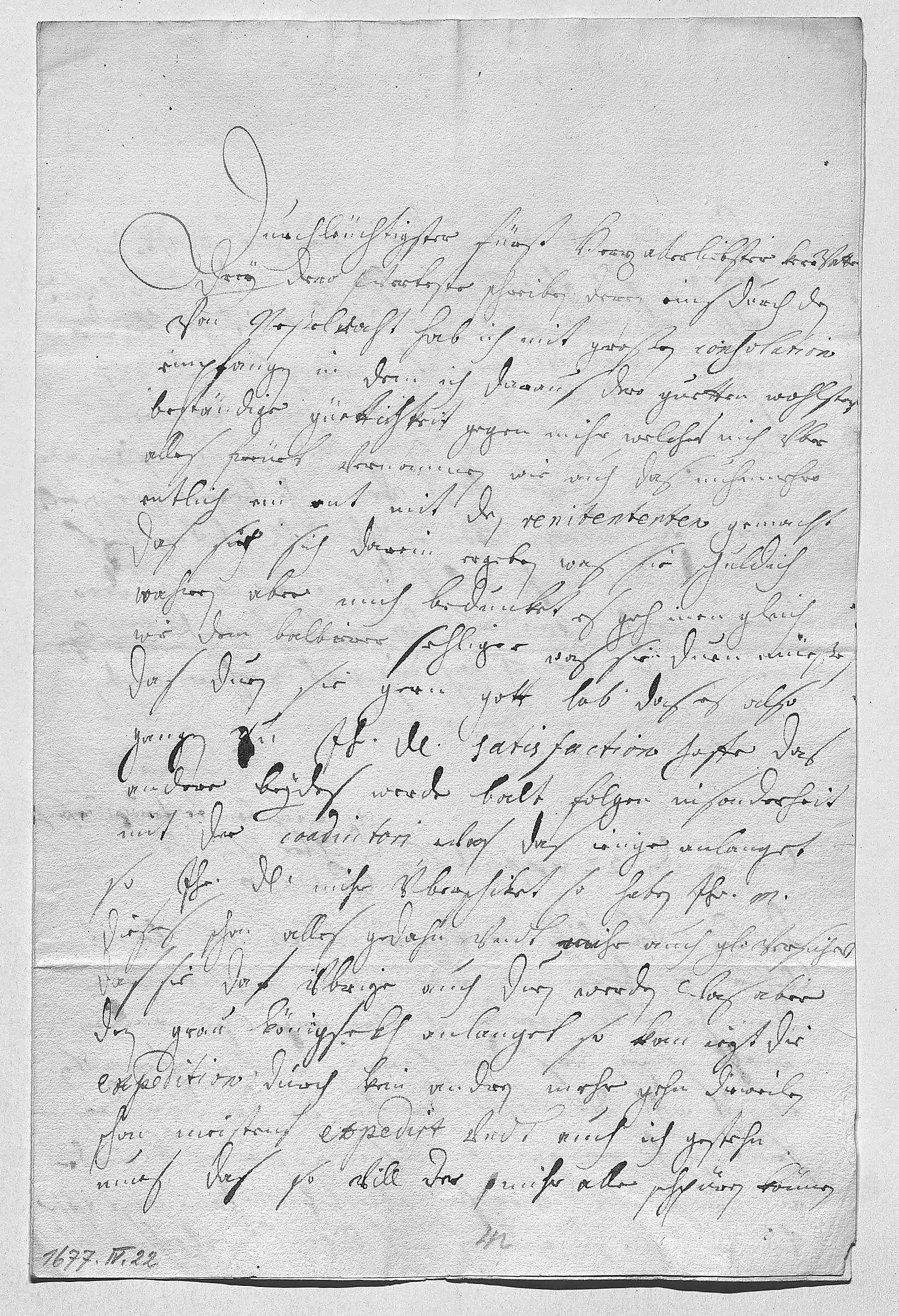 0001Durchleüchtigster Fürst, herzallerliebster herr vatter 0002Drey dero werteste schreiben , deren eins durch den 0003von Neßelraht, hab ich mit großen consolation 0004empfangen, in dem ich daraus dero guetten wohlstant und0005beständige güettichkeit gegen mihr, welches mich vber 0006alles freüet, vernommen wie auch, das nuhnmehro 0007entlich ein ent mit den renitententen gemacht, 0008das sie sich darein ergeben, was sie schuldich 0009wahren. Aber mich bedunket, es geh inen gleich 0010wie dem balbierer sehliger, was sie duen müeßen, 0011das duen sie gern. Gott lob, das es also 0012gangen zu ihr Durchlaucht satisfaction, hoffe, das 0013andere beydes werde balt folgen, insonderheit 0014mit der coadiutori. Was das ienige anlanget, 0015so ihr Durchlaucht mihr überschiket, so haben ihr Mayestät 0016dieses schon alles gedahn vndt mihr auch gnädigst versichert, 0017das sie das übrige auch duen werden. Was aber 0018den Grau Königsekh anlanget, so kan iezt die 0019expedition durch kein andren mehr gehn, dieweilen 0020schon meistens expedirt vndt auch ich gestehn 0021mues, das so vill der mihr alle schpüren können,