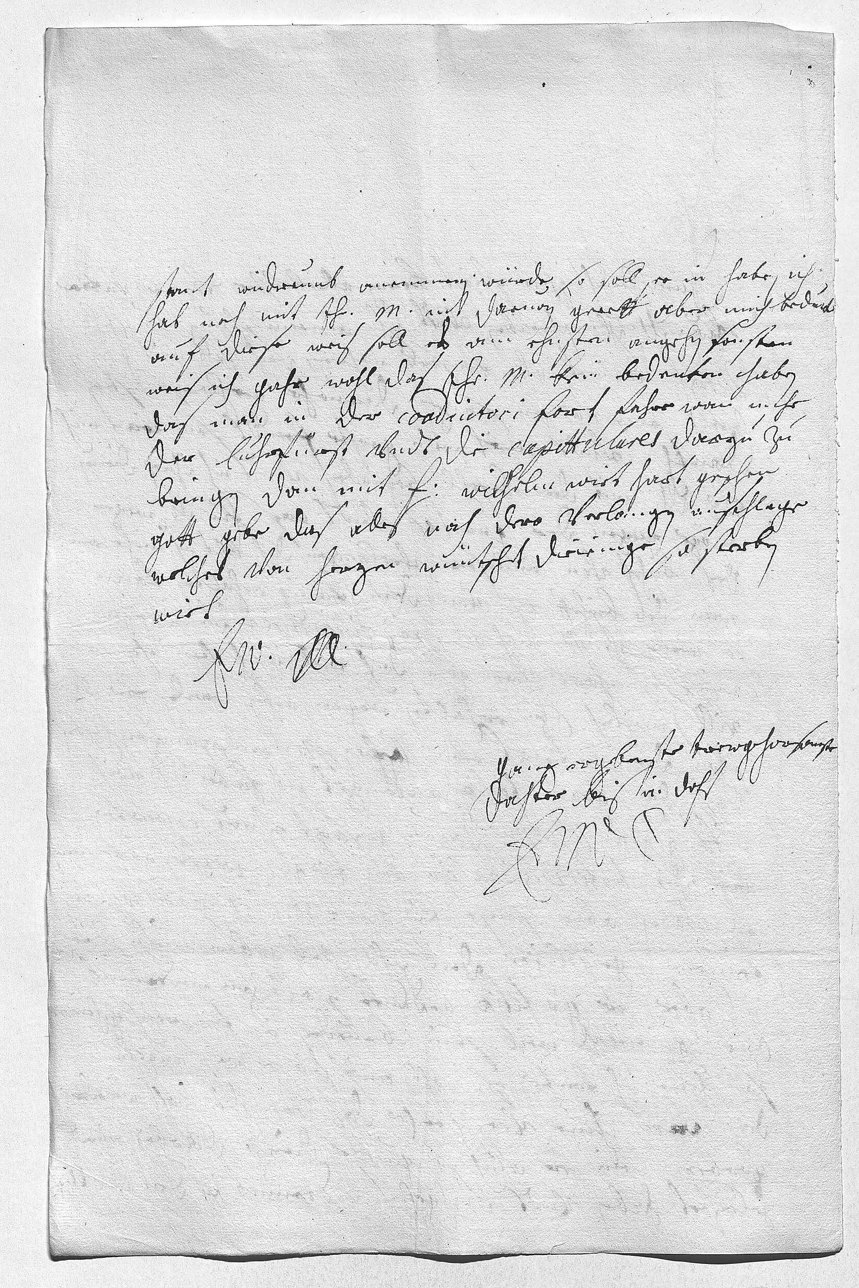 0025stant widrumb anemmen würde, so soll er in haben. Ich 0026hab noch mit ihr Mayestät nit daruon gerett, aber mich bedunkt, 0027auf diese weis soll es am ehnsten angehn. Sonsten 0028weis ich gahr wohl, das ihr Mayestät kein bedenken haben, 0029das man in der coadiutori fort fahre, wan nuhr 0030der Cuhrfürst vndt die capittulares darzu zu 0031bringen, dan mit Fürst Wilhelm wirt hart geschen. 0032Gott gebe, das alles nach dero verlangen auschlage, 0033welches von herzen wüntschet dieienige, so sterben 0034wirt 0035ewer Durchlaucht 0036ganz ergebenste trewgehorsamste 0037dochter bis in doht 0038EMT