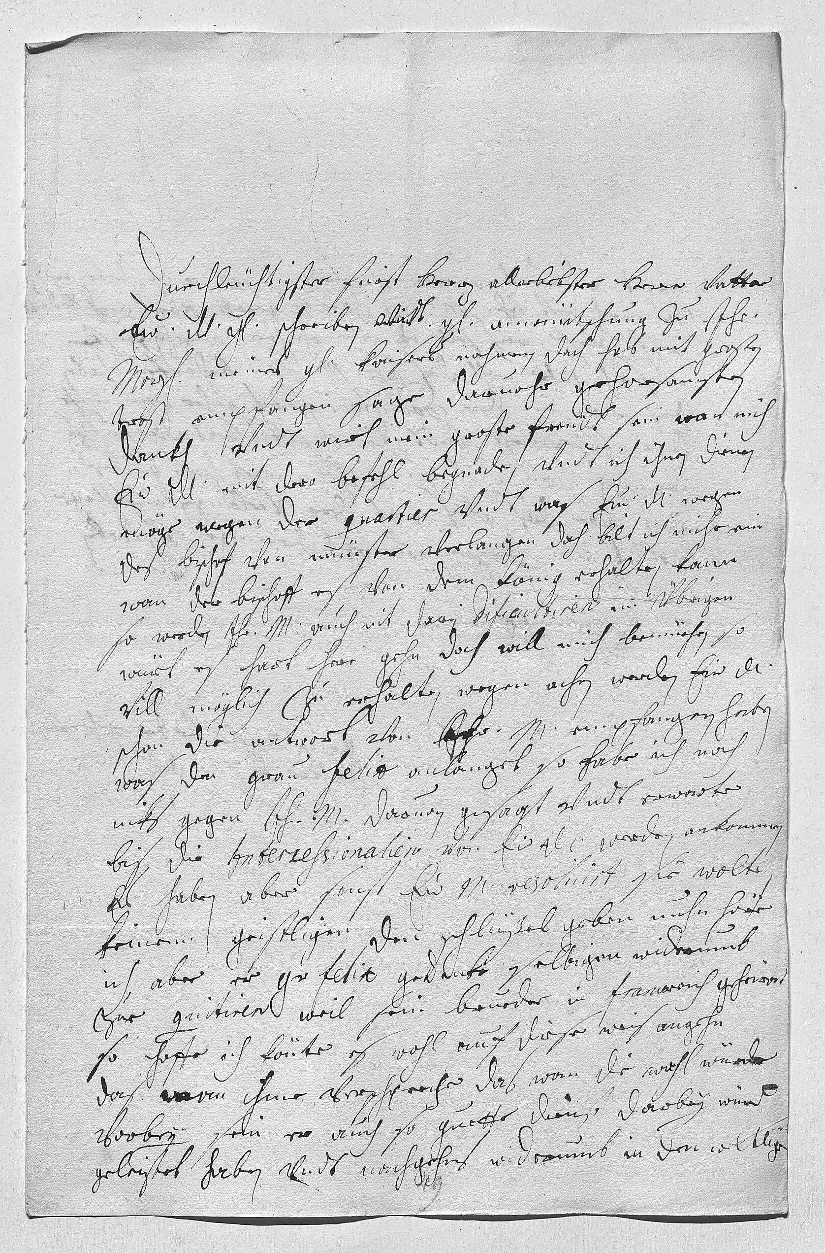 0001Durchleüchtigster Fürst, herz allerliebster herr vatter 0002Ewer Durchlaucht gnädiges schreiben vndt gnädige anwüntschung zu ihr 0003Mayestät, meines gnädigsten Kaisers, nahmen dach hab mit grosen 0004trost empfangen. Sage daruohr gehorsamsten 0005dankh, vndt wirt mein groste freüdt sein, wan mich 0006ewer Durchlaucht mit dero befehl begnaden vndt ich ihnen dienen 0007möge. Wegen der quartier vndt was ewer Durchlaucht wegen 0008des Bischof von Münster verlangen, dah bilt ich mihr ein, 0009wan der Bischoff es von dem König erhalten kann, 0010so werden ihr Mayestät auch nit darin dificultiren. Im übrigen 0011würt es hart here gehn, doch will mich bemüehen, so 0012vill möglich zu erhalten. Wegen Achen werden ewer Durchlaucht 0013schon die antwort von ihr Mayestät empfangen haben. 0014Was den Grau Felix anlanget, so habe ich noch 0015niks gegen ihr Mayestät daruon gesagt vndt erwarte, 0016bis die intercessionalien von ewer Durchlaucht werden ankommen. 0017Es haben aber sonst ewer Mayestät resoluirt, sie wolten 0018keinem geistligen den schlüßel geben. Nuhn höre 0019ich aber, er Grav Felix gedenke, selbigen widerumb 0020zue quitiren, weil sein brueder in Francreich geheirat. 0021So hoffe ich, könte es wohl auf diese weis angehn, 0022das man ihme verschpreche, das wan die wahl würde 0023vorbey sein, er auch so guette dienst darbey würd 0024geleistet haben vndt nachgehns widerumb in den weltligen