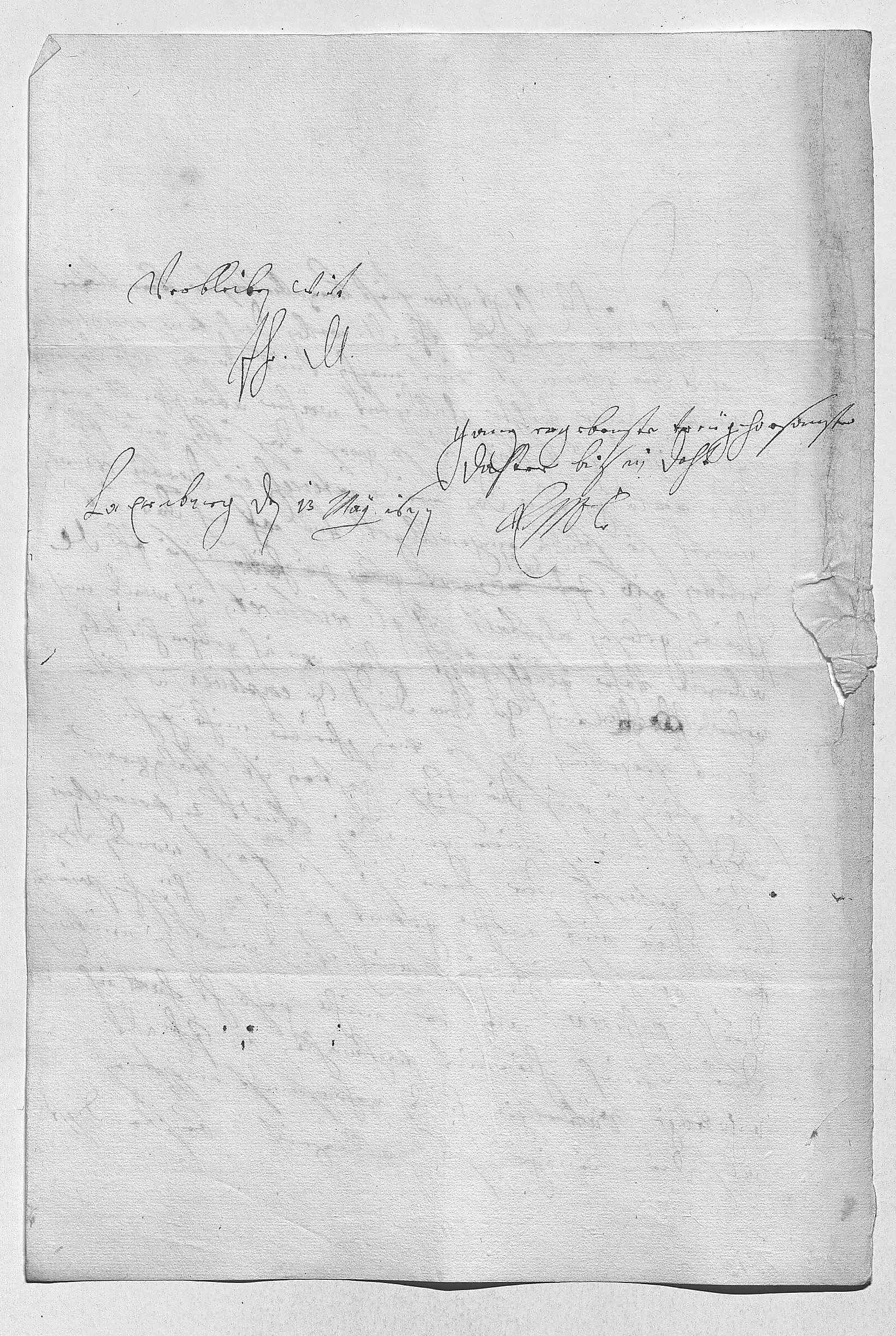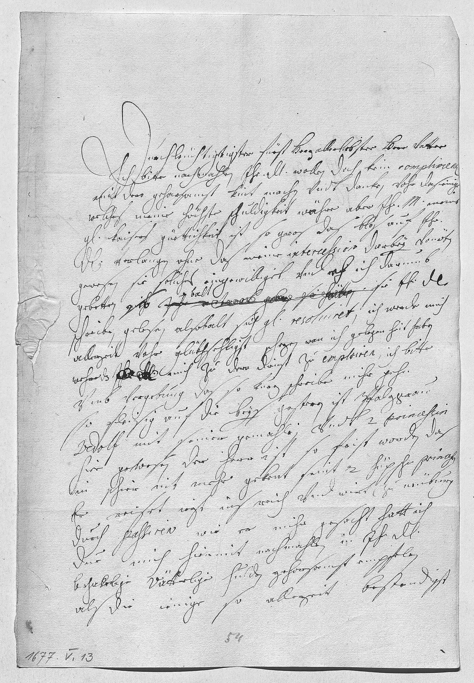 0001Durchleüchtigtigster Fürst, herzallerliebster herr vatter 0002Ich bitte nachmahlen, ihr Durchlaucht wollen doch kein compliment 0003mitt dero geharsamst kint machen vndt danken vohr dasienige, 0004welches meine höchste schuldigkeit währe. Aber ihr Mayestät, meines 0005gnädigsten Kaisers, güettichkeit ist so gros, das blos auf ihr 0006Durchlaucht verlangen, ohne das meine intercession darbey vonöten 0007gewesen, sie soliches eingewilliget vnd eh ich darumb 0008gebetten, so balt zur antwort geben sie hätten sie ihr Durchlaucht 0009schreiben gelesen, alsobalt sich gnädigst resoluiret. Ich werde mich 0010allezeit vohr glükhsehligst schezen, wan ich gelegenheit haben 0011wehre, das ihr Durchlaucht mich zu dero dienst zu emploiren. Ich bitte 0012vmb vergebung, das so kurz schreibe, mihr gehn 0013so fleisig auf die beys. Gesteren ist Pfalzgrau 0014Adolf mit seiner gemahlin vndt 2 princessin 0015hier gewesen. Der herr ist so feist worden, das 0016in schier nit mehr gekent. Seint 2 hüpsche princesin. 0017Er reiset iezt ins Reich vnd wirt zu Neüburg 0018durch passiren, wie er mihr gesacht hatt. Ich 0019due mich hiermit nachmahlen in ihr Durchlaucht 0020beharlige vätterlige hulden gehorsamst empfelen 0021als die ienige, so allezeit bestendigst