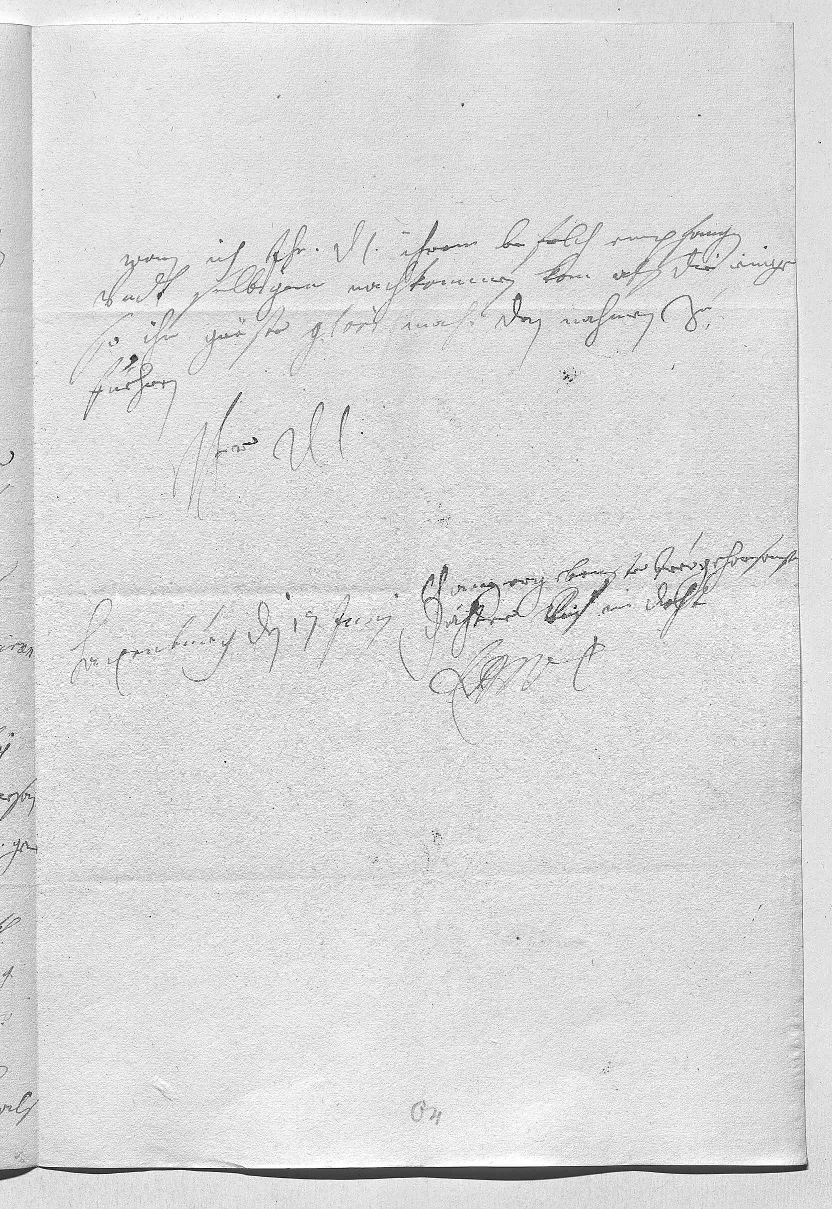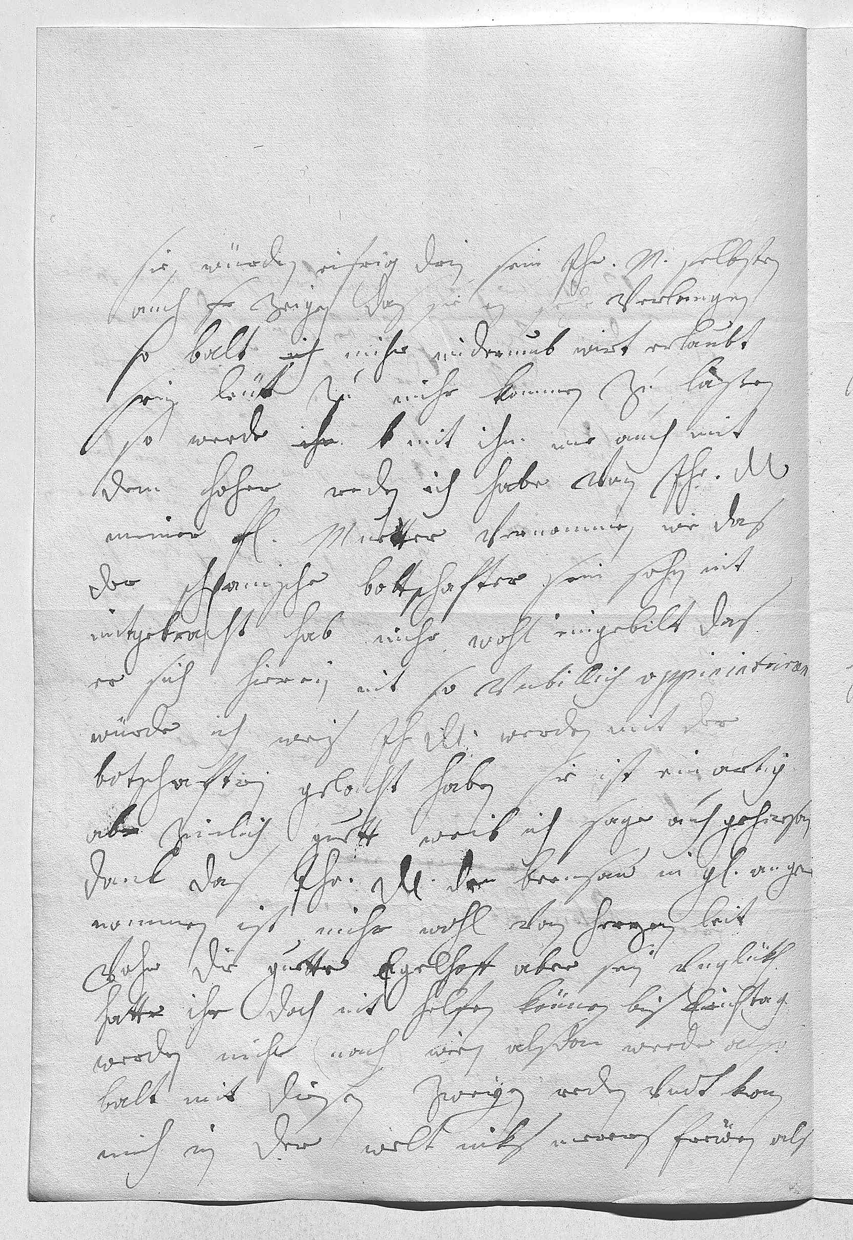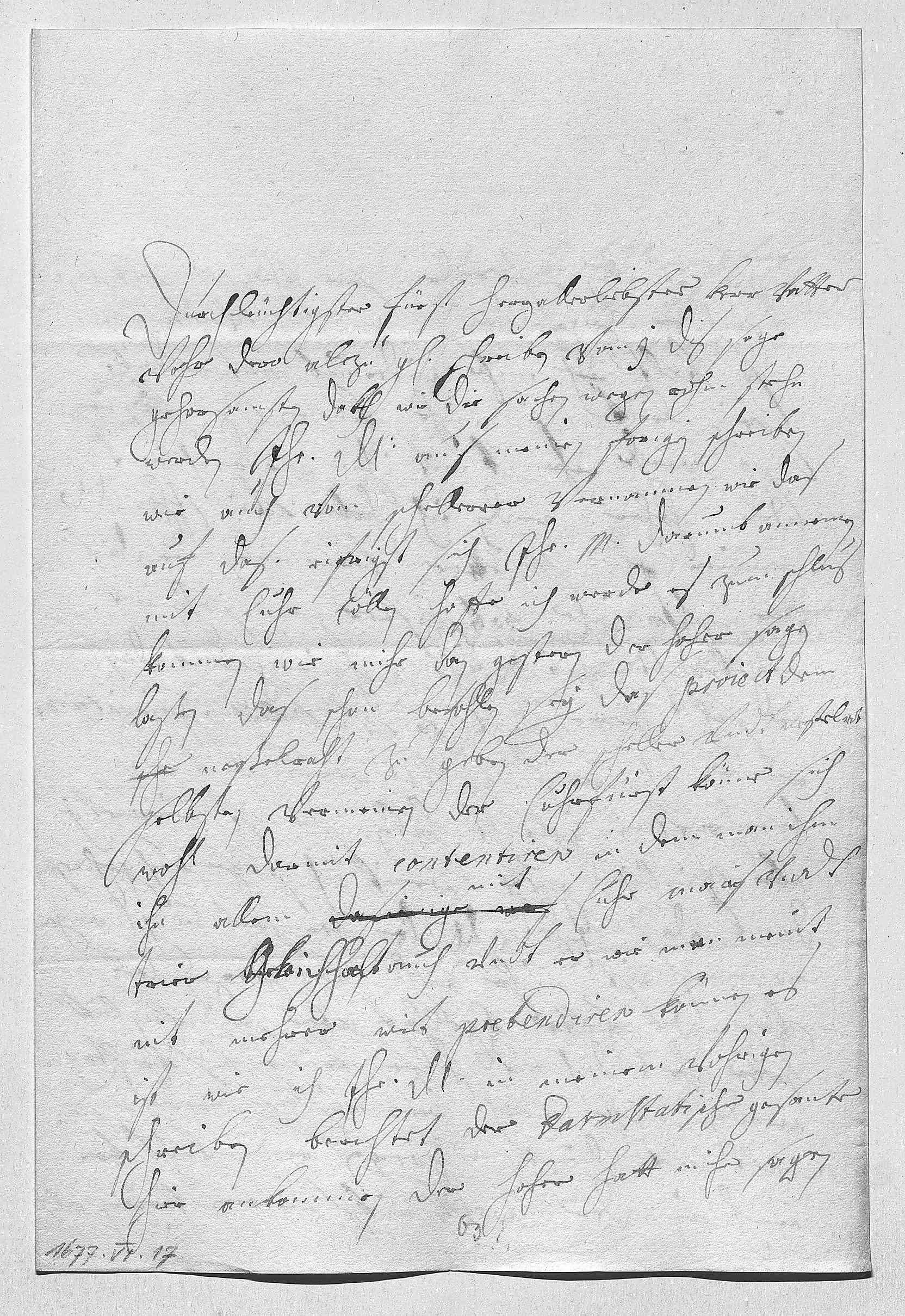 0001Durchleüchtigster Fürst, herzallerliebster herr vatter 0002Vohr dero alzu gnädigstes schreiben vom 1 dis sage 0003gehorsamsten dankh. Wie die sachen wegen Rohm stehn, 0004werden ihr Durchlaucht aus meinen forigen schreiben 0005wie auch vom Schellerrer vernommen, wie das 0006auf das eifrigst sich ihr Mayestät darumb annemen. 0007Mit Cuhr Cöllen, hoffe ich, werde es zum schlus 0008kommen, wie mihr dan gestern der Hoher sagen 0009laßen, das schon befohlen sey, das proiect dem 0010sche Neßelraht zu geben. Der Scheller vndt Neßelrat 0011selbsten vermeinen, der Cuhrfürst könne sich 0012wohl darmit contentiren, in dem man ihm 0013ihn allem dasienige was mitCuhr Mains vndt 0014Trier gleichhalt auch vndt er, wie man meint, 0015nit mehrer wirt pretendiren können. Es 0016ist, wie ich ihr Durchlaucht in meinem vohrigen 0017schreiben berichtet, der darmstatische gesante 0018hier ankommen. Hoher hatt mihr sagen
