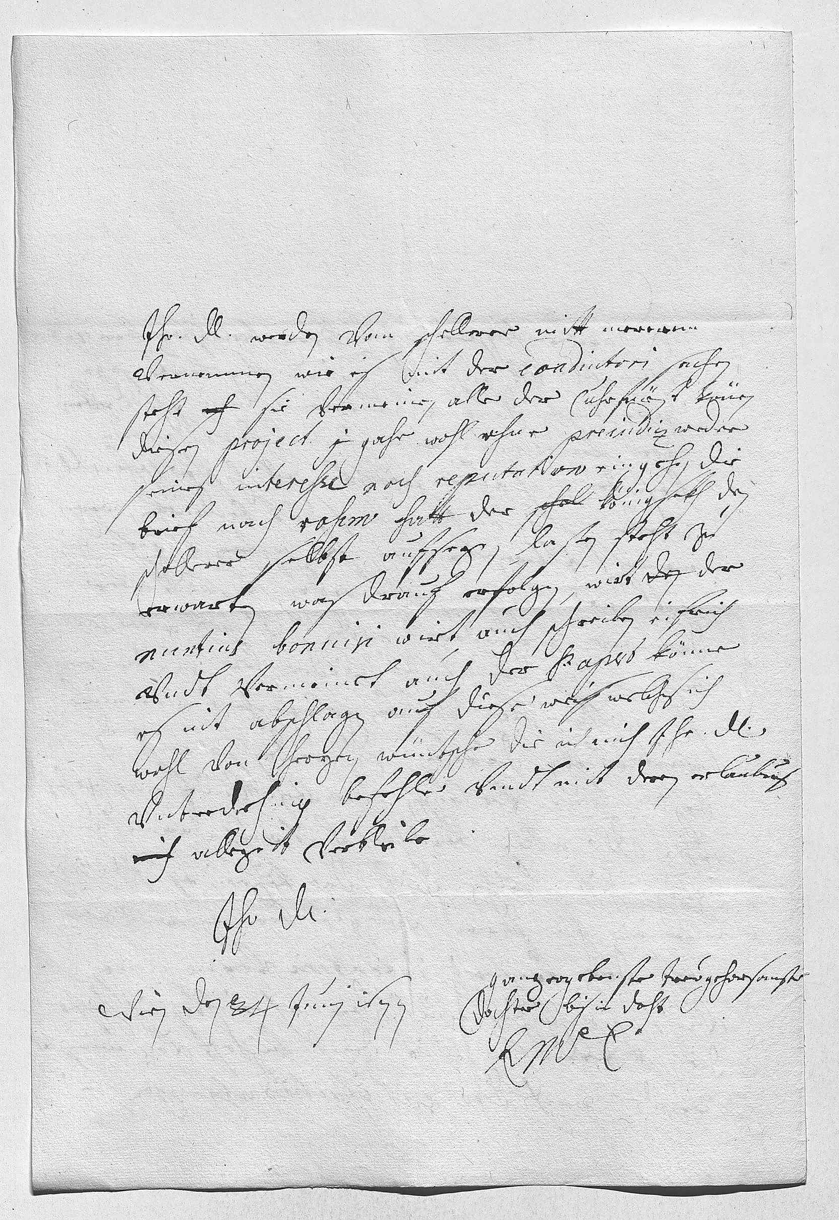0021Ihr Durchlaucht werden vom Schellerer mittmererem 0022vernemmen, wie es mit der coadiutori sachen 0023steht. sch Sie vermeinen alle, der Cuhrfürst könen 0024diesen project gahr wohl ohne preiudiz, weder 0025seines interesse noch reputation, eingehen. Die 0026brief nach Rohm hatt der schel Königsekh den 0027Schellerer selbst aufsezen laßen, steht zu 0028erwarten was drauf erfolgen wirt. den Der 0029Nuntius Bonuisi wirt auch schreiben eifrich 0030vndt vermeinet auch, der Papst könne 0031es nit abschlagen auf diese weis, welches ich 0032wohl von herzen wüntsche, die ich mich ihr Durchlaucht 0033vnterdehnig befehle vndt mit deren erlaubnus 0034mich allezeit verbleibe 0035ihr Durchlaucht 0036ganz ergebenste trewgehorsamste 0037dochter bis in doht 0038EMT 0039Wien den 24 juni 1677