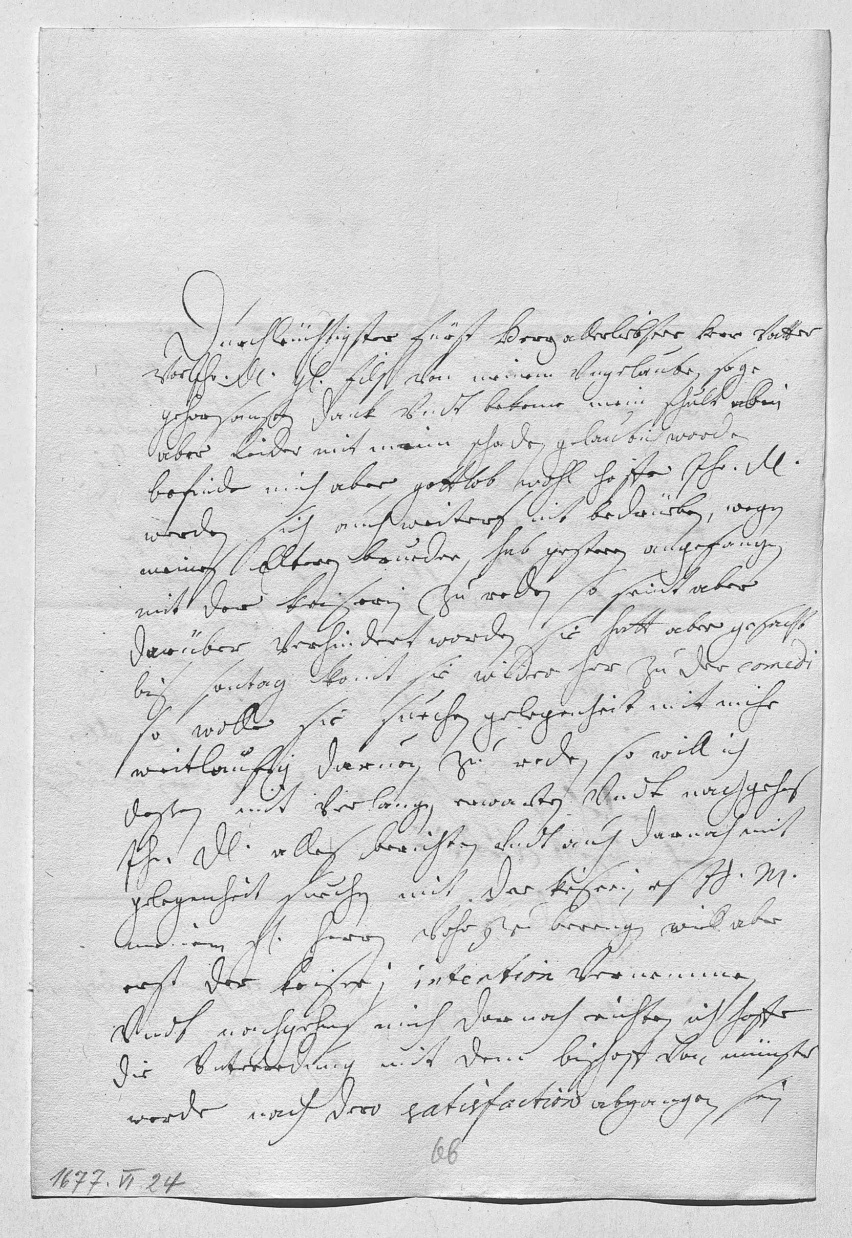 0001Durchleüchtigster Fürst, herz allerliebster herr vatter 0002Vor ihr Durchlaucht gnädigen fils von meinem vngelauben sage 0003gehorsamsten dank vndt bekenemein schult. Allein 0004aber leider ist mit mein schaden gelaubich worden, 0005befinde mich aber gottlob wohl, hoffe, ihr Durchlaucht 0006werden sich auch weiters nit bedrüeben. Wegen 0007meines elteren bruedern hab gesteren angefangen, 0008mit der Keiserin zu reden, so seindt aber 0009darüber verhindert worden. Sie hatt aber gesacht, 0010bis sontag komt sie wider her zu der comedi, 0011so wolle sie suechen gelegenheit, mit mihr 0012weitlaufig daruon zu reden. So will ich 0013deßen mit verlangen erwarten vndt nachgehns 0014ihr Durchlaucht alles berichten vndt auch darnach mit 0015gelegenheit suechen mit der Keiserin, es ihr Mayestät, 0016meinem gnädigsten herrn, vohr zu berengen. Will aber 0017erst der Keiserin intention vernemmen 0018vndt nachgehens mich darnach richten. Ich hoffe, 0019die vnterredung mit dem Bischoff von Münster 0020werde nach dero satisfaction abgangen sein.