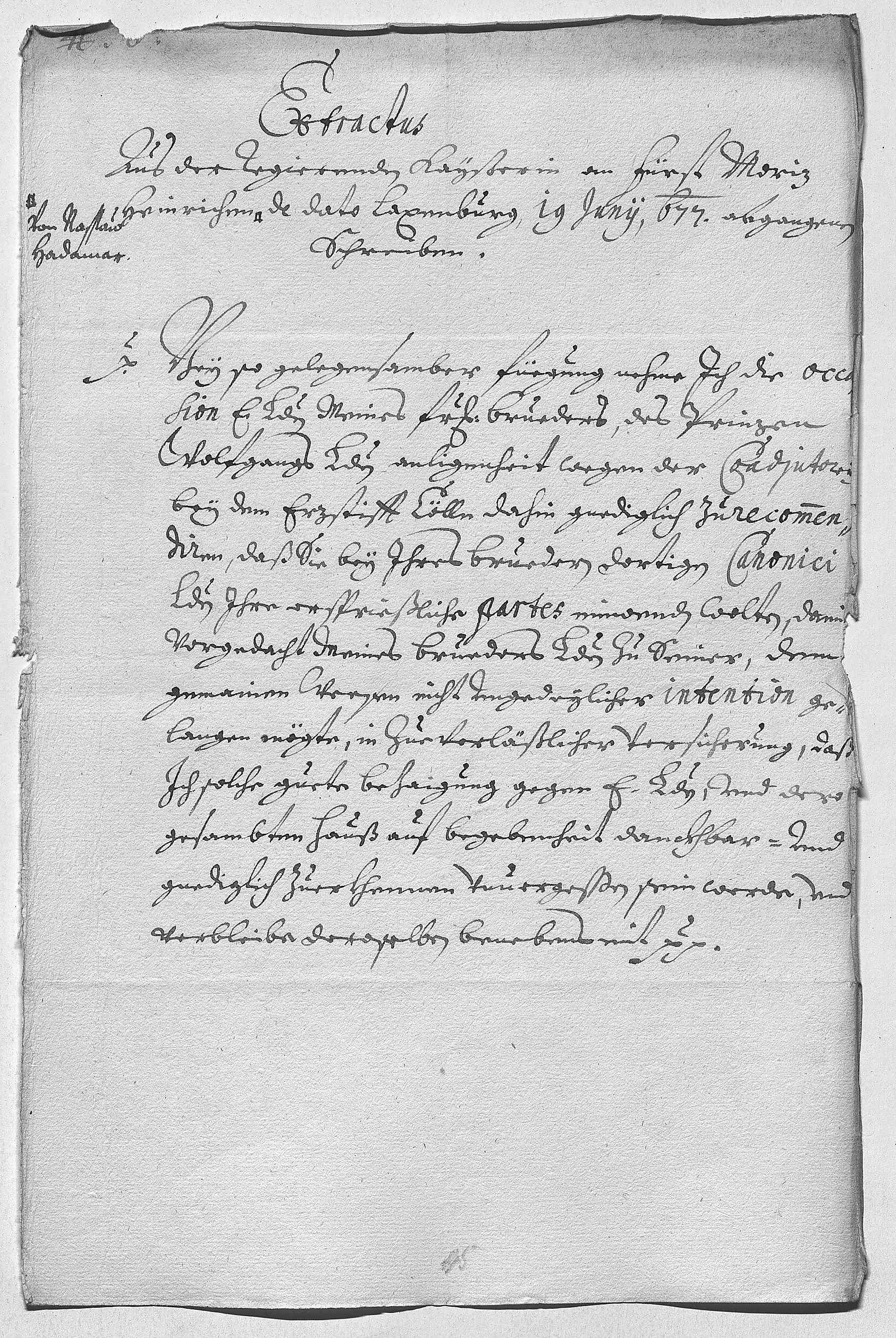 00400041Extractus 0042aus der regierenden Kayßerin an Fürst Moriz 0043Heinrichen von Nassav Hadamar de dato Laxemburg, 19 junij ,1677 abgangenen 0044schreiben 0045Bey so gelegensamber füegung nehme ich die occa- 0046sion ewer Liebden meines freundlichen brueders, des Prinzen 0047Wolfgangs Liebden anligenheit wegen der coadjutori 0048bey dem erzstift Cölln dahin gnediglich zu reccommen- 0049diren, daß sie bey ihres bruedern dortigen canonici 0050Liebden ihre ersprießliche partes einwenden wolten, damit 0051vorgedacht meines brueders Liebden zu seiner, dem 0052gemainen weesen nicht vngedeylicher intention ge- 0053langen mögte, in zueverläßlicher versicherung, daß 0054ich solche guete bezaigung gegen ewer Liebden und dero 0055gesambtem hauß auf begebenheit danckhbar= vnd 0056gnediglich zuerkhennen vnuergessen sein werde, vnd 0057verbleibe deroselben benebens mit praemissis praemittendis
