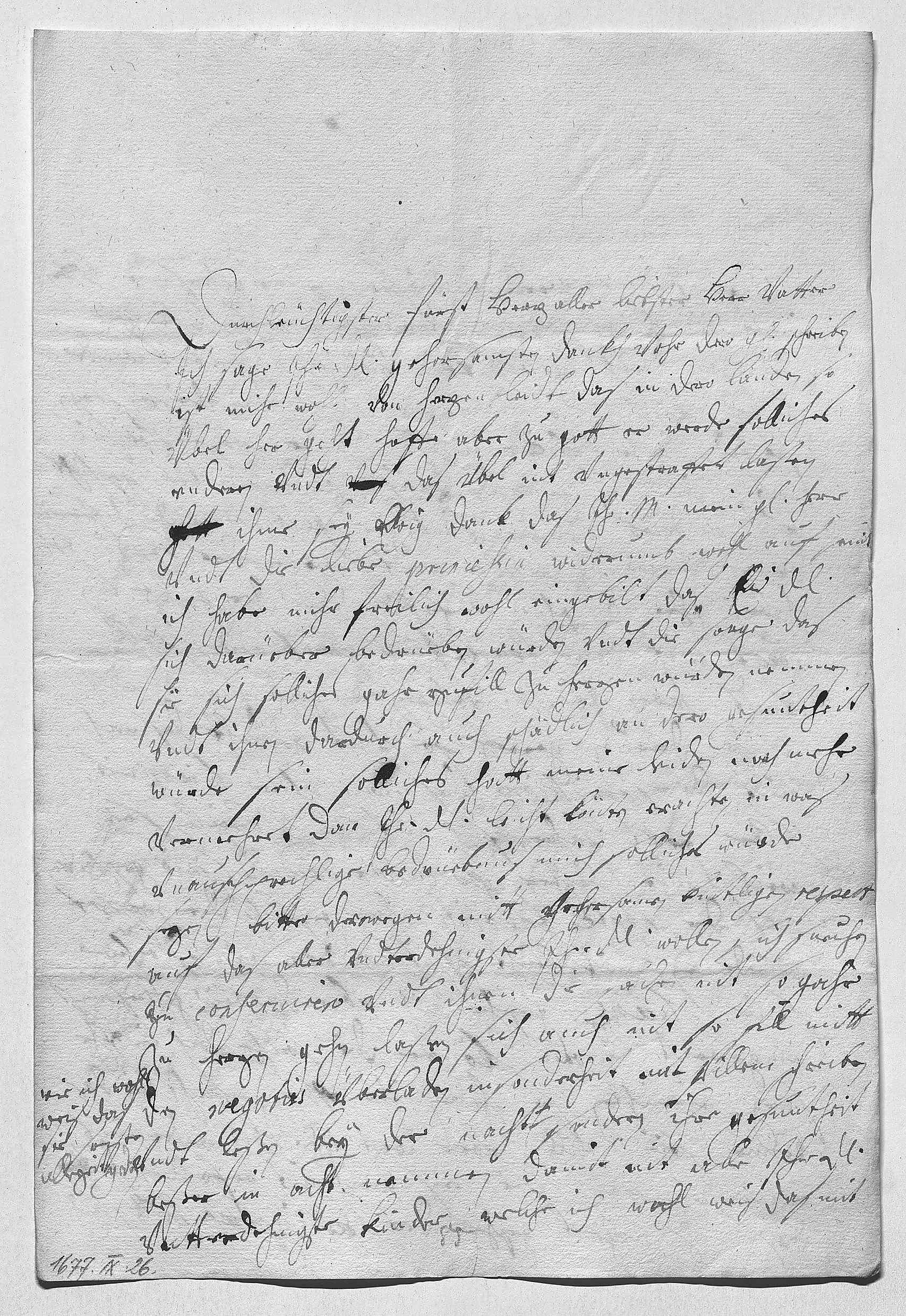0001Durchleüchtigster Fürst, herz aller liebster herr vatter 0002Ich sage ihr Durchlaucht gehorsamsten dankh vohr dero gnädiges schreiben. 0003Ist mihr wohl von herzen leidt, das in dero landen so 0004übel her geht, hoffe aber zu gott, er werde solliches 0005enderen vndt vns das übel nit vngestraffet laßen. 0006Hett Ihme sey ewig dank, das ihr Mayestät, mein gnädigster herr, 0007vndt die liebe Princessin widerumb wohl auf seint. 0008Ich habe mihr freilich wohl eingebilt, das ewer Durchlaucht 0009sich darüber bedrüeben würden vndt die sorge, das 0010sie sich solliches gahr zufill zu herzen würden nemmen 0011vndt ihnen dardurch auch schädlich an dero gesuntheit 0012würde sein, solliches hatt meine leiden noch mehr 0013vermehret, dan ihr Durchlaucht leicht könten erachten, in was 0014vnauschprechlige bedrüebnus mich solliches würde 0015sezen. Bitte derowegen mitt gehorsamen kintligen respect 0016auf das aller vndterdehnigste, ihr Durchlaucht wollen sich suechen 0017zu conseruiren vndt ihnen die sache nit so gahr 0018zu herzen gehn laßen, sich auch nit so fill mitt 0019den negotiis überladen, insonderheit mit villem schreiben 0020wie ich wohl weis, das sie sonsten allezeit gedan,0021vndt leßen bey der nacht, sondern ihre gesuntheit 0022beßer in acht nemmen, damit nit alle ihr Durchlaucht 0023vntterdehnigste kinder, welche ich wohl weis, das mit