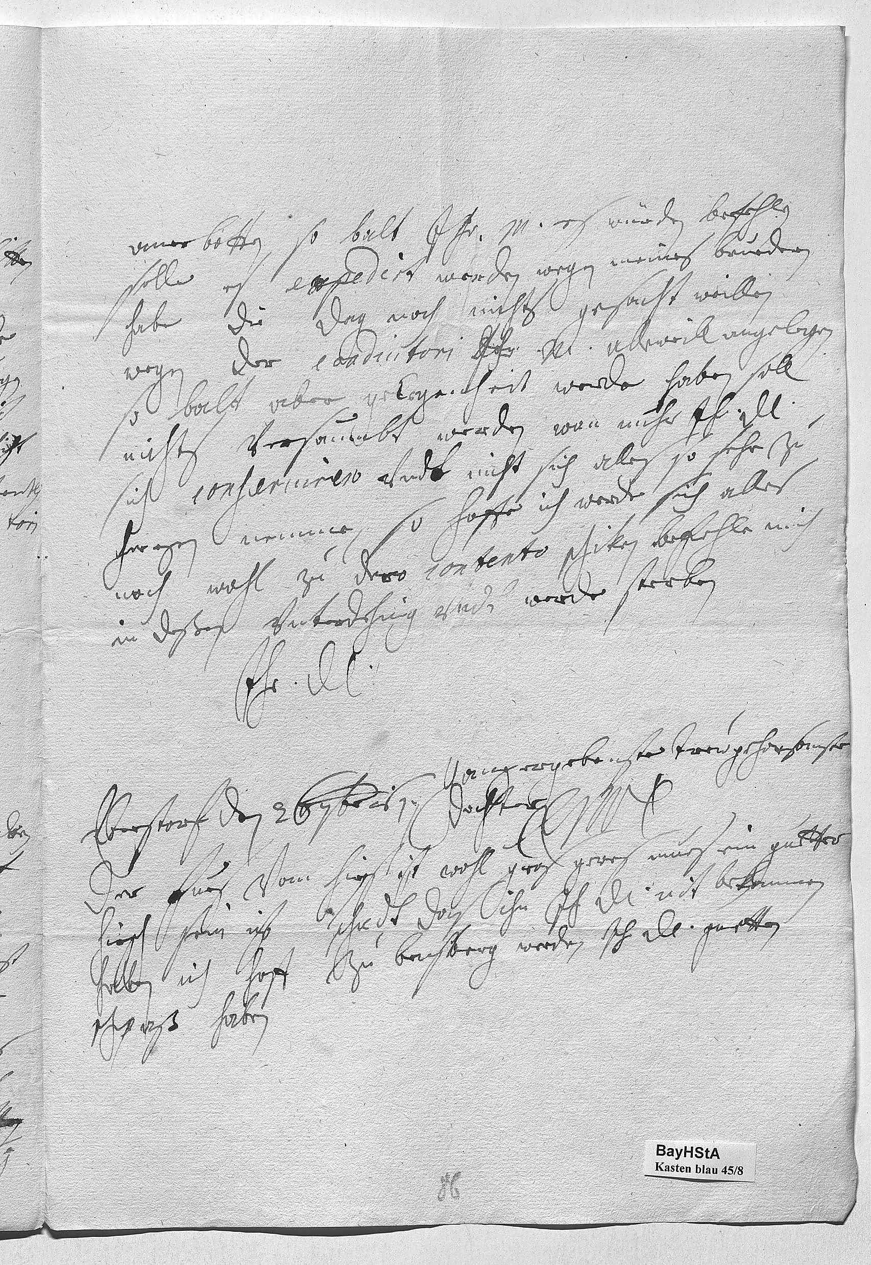 0047anerbotten, so balt ihr Mayestät es würden befehlen, 0048solle es expedirt werden. Wegen meines bruedern 0049habe die dag noch nichts gesacht, weillen 0050wegen der coadiutori ihr Mayestät alleweill angelegen, 0051so balt aber gelegenheit werde haben, soll 0052nichts versaumbt werden. Wan nuhr ihr Durchlaucht 0053sich conseruiren vndt nicht sich alles so sehr zu 0054herzen nemmen, so hoffe ich werde sich alles 0055noch wohl zu dero contento schiken. Befehle mich 0056in deßen vnterdehnig vndt werde sterben 0057ihr Durchlaucht 0058ganzergebenste trew gehorsamste 0059dochter 0060EMT 0061Eberstorf den 26 septembris 16770062Der fues vom hirsch ist wohl gros gewesen, mues ein guetter 0063hirsch sein, ist schadt, das ihn ihr Durchlaucht nit bekommen 0064haben. Ich hoff, zu Bensberg werden ihr Durchlaucht guetten 0065schpaß haben.