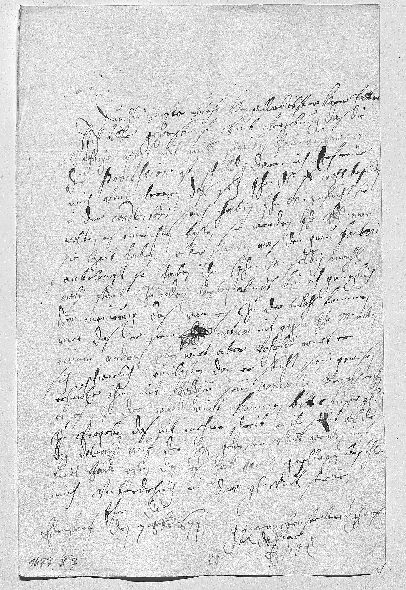 0001Durchleüchtigster Fürst, herzallerliebster herr vatter 0002Ich bitte gehorsamist vmb vergebung, das die 0003vohrige post nit mitt schreiben habe aufgewart, 0004die procession ist schuldig daran. Ich erfreüe 0005mich von herzen, das sich ihr Durchlaucht so wohl befinden. 0006In der coadiutori sach haben ihr Mayestät gesacht, sie 0007wolten es einrichten laßen, sie werden ihr Durchlaucht, wan 0008sie zeit haben, selber schreiben. Was den Grau Forbeni 0009anbelangt, so haben ihm ihr Mayestät selbig mahl 0010wohl stark zu reden laßen, vndt bin ich ganzlich 0011der meinung, das wan es zu der wahl kommen 0012wirt, das er sein stim votum nit gegen ihr Mayestät willen 0013einem andren geben wirt, aber vohrhin wirt er 0014sich schwerlich einlaßen, dan er sacht, sein gewisen 0015erlaube ihm nit, vohrhin sein votum zu verschprechen, 0016eh es zu der wahl wirt kommen. Bitte mihr gnädig 0017zu vergeben, das nit mehrer schreib, mihr sein al die 0018dag daraus auf der hez gewesen vndt werden iezt 0019gleich zum eßen, dan es hatt schon 8 geschlagen. Befehle 0020mich vnterdehnich in dero gnade vndt sterbe 0021ihr Durchlaucht 0022ganzergebenste trew gehorsam- 0023ste dochter 0024EMT 0025Eberstorf den 7 octobris 1677