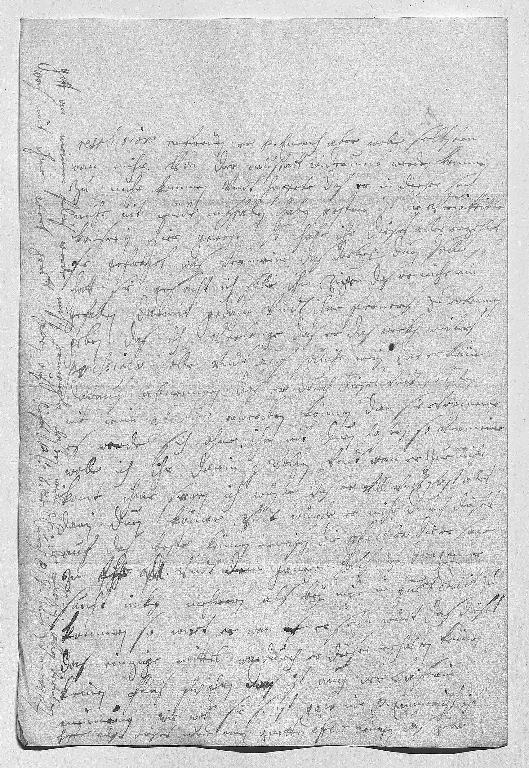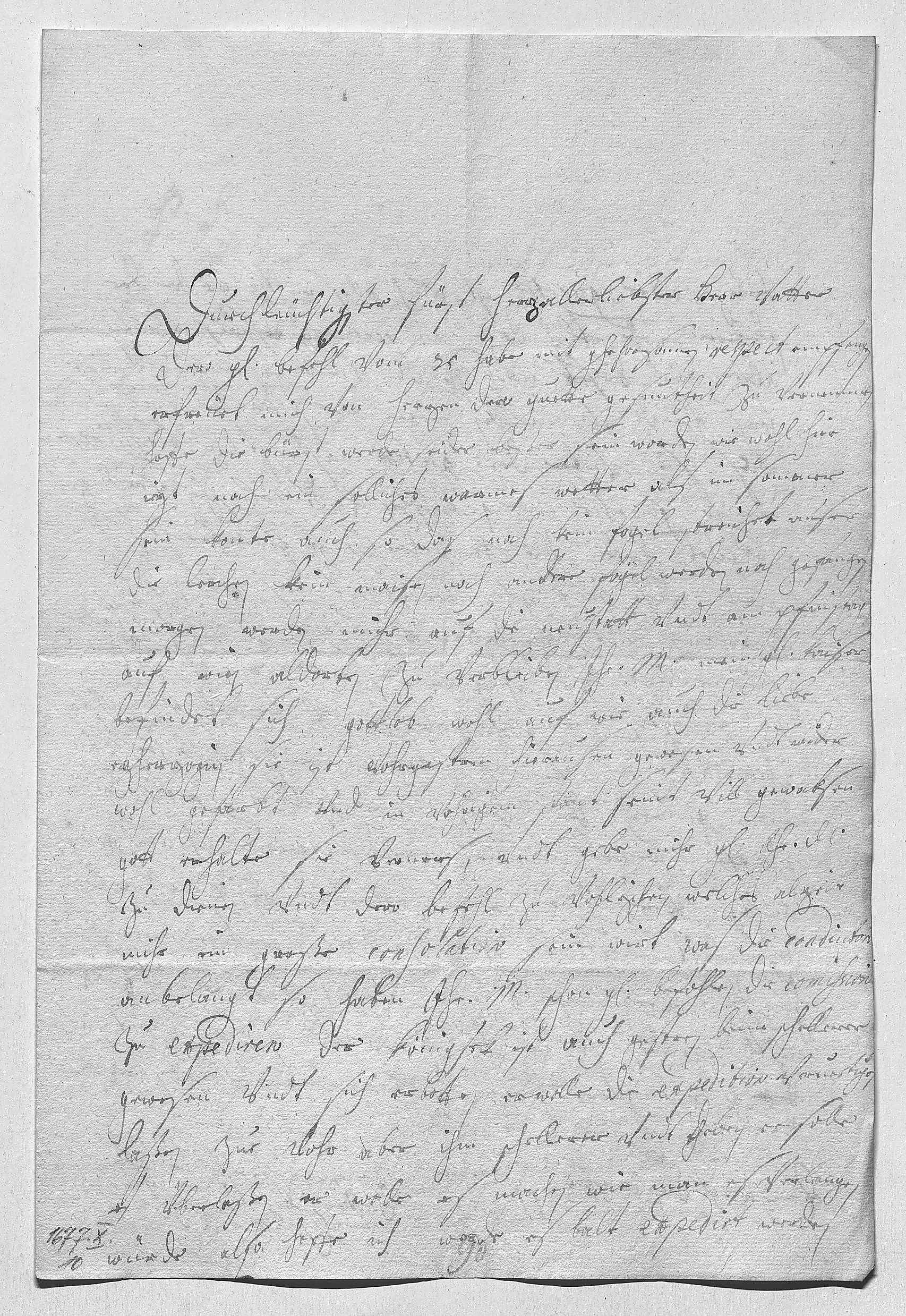 0001Durchleüchtigster Fürst, herzallerliebster herr vatter 0002Dero gnädigen befehl vom 25 habe mit ghehorsamen respect empfangen. 0003Erfreüet mich von herzen, dero guette gesuntheit zu vernemmen, 0004hoffe, die bürst werde seider beßer sein worden, wie wohl hier 0005iezt noch ein solliches warmes wetter, als im sommer 0006sein konte, auch so, das noch kein fogel streichet auser 0007die lerchen. Kein maisen noch andere fögel werden noch gefangen. 0008Morgen werden mihr auf die Neustatt vndt am pfinstag 0009auf Wien, aldorten zu verbleiben. Ihr Mayestät, mein gnädigster Kaiser, 0010befindet sich gottlob wohl auf wie auch die liebe 0011Erzherzogin . Sie ist vohrgestern hierausen gewesen vndt wider 0012wohl gefärbt vnd in vohrigem stant, seint vill gewaksen. 0013Gott erhalte sie verners, vndt gebe mihr gnade, ihr Durchlaucht 0014zu dienen vndt dero befehl zu vohlzihen, welches alzeit 0015mihr ein große consolation sein wirt. Was die coadiutori 0016anbelangt, so haben ihr Mayestät schon gnädigst befohlen, die comission 0017zu expediren. Der Königsek ist auch gestern beim Schellerer 0018gewesen vndt hat sich erbotten, erwolle die expedition veruertigen 0019laßen, zue vohr aber ihm Schellerer vndt geben, er solle 0020es überleßen, er wolle es machen, wie man es verlangen 0021würde. Also, hoffe ich, werde es balt expedirt werden.