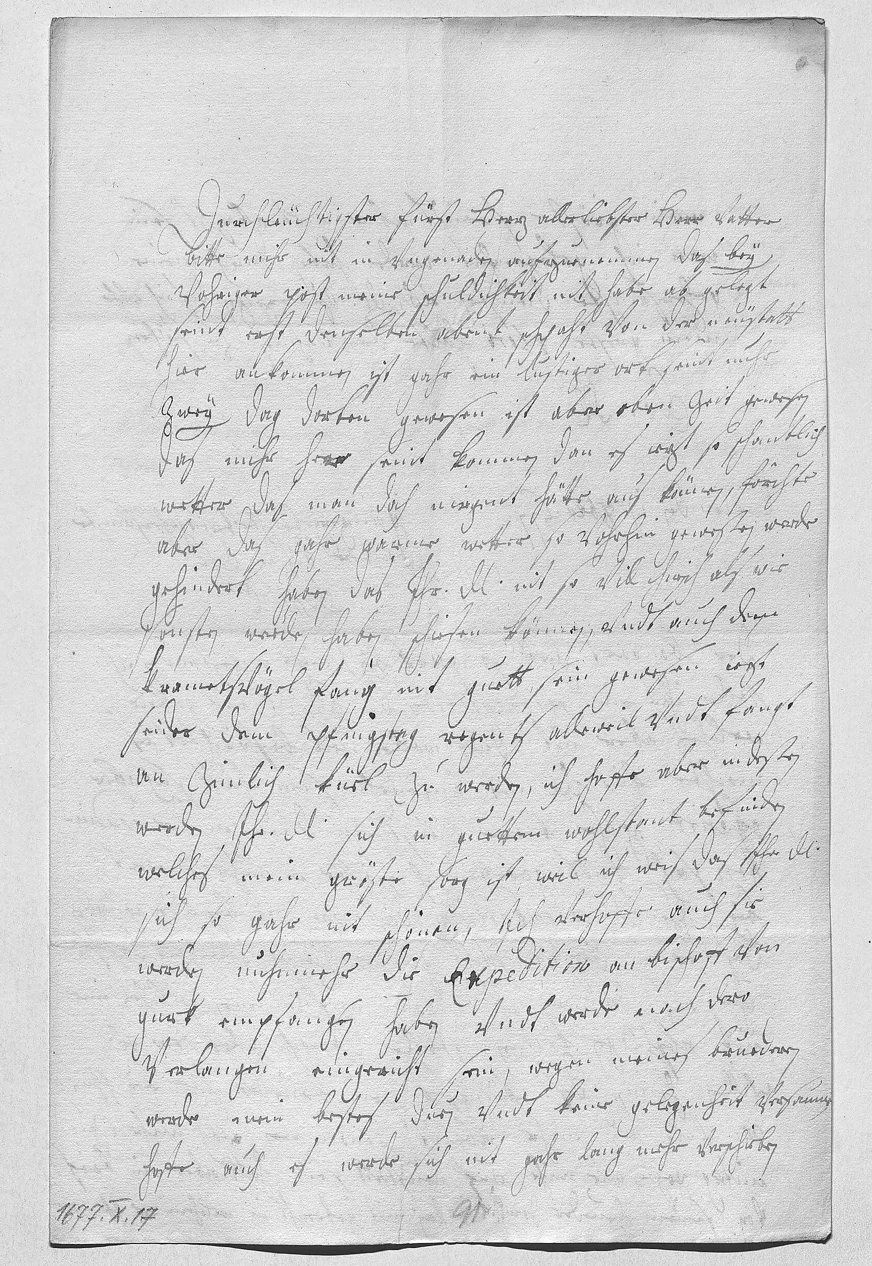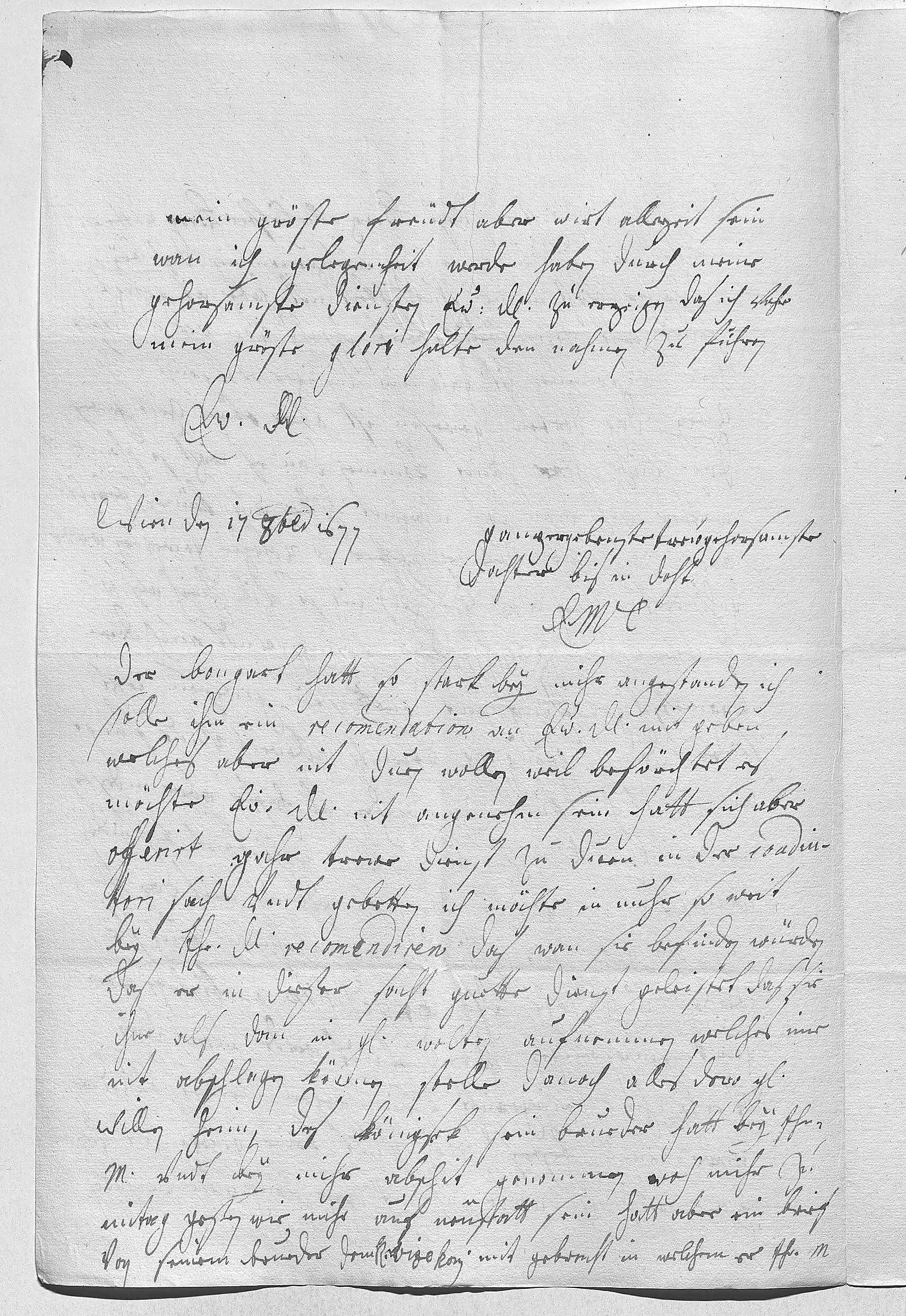 0023Mein gröste freüdt aber wirt allezeit sein, 0024wan ich gelegenheit werde haben, durch meine 0025gehorsamste diensten ewer Durchlaucht zu erzeigen, das ich vohr 0026mein gröste glori halte, den nahmen zu führen 0027ewer Durchlaucht 0028ganzergebenste trewgehorsamste 0029dochter bis in doht 0030EMT 0031Wien den 17 octobris 16770032Der Bongart hatt so stark bey mihr angestanden, ich 0033solle ihm ein recomendation an ewer Durchlaucht mit geben, 0034welches ich aber nit duen wollen, weil beförchtet, es 0035möchte ewer Durchlaucht nit angenehm sein. Hatt sich aber 0036offerirt, gahr trewe dienst zu duen in der coadiu- 0037tori sach vndt gebetten, ich möchte in nuhr so weit 0038bey ihr Durchlaucht recomendiren, das wan sie befinden würden, 0039das er in dieser sacht guette dienst geleistet, das sie 0040ihne als dan in gnaden wolten aufnemmen, welches ime 0041nit abschlagen können. Stelle danoch alles dero gnädigstem 0042willen heim. Des Königsek sein brueder hatt bey ihr 0043Mayestät vndt bey mihr abschit genommen, woh mihr zu 0044mitag geßen, wie mihr auf Neüstatt sein. Hatt aber ein brief 0045von seinem brueder, dem Reichsvizekanzler, mit gebracht, in welchem er ihr Mayestät