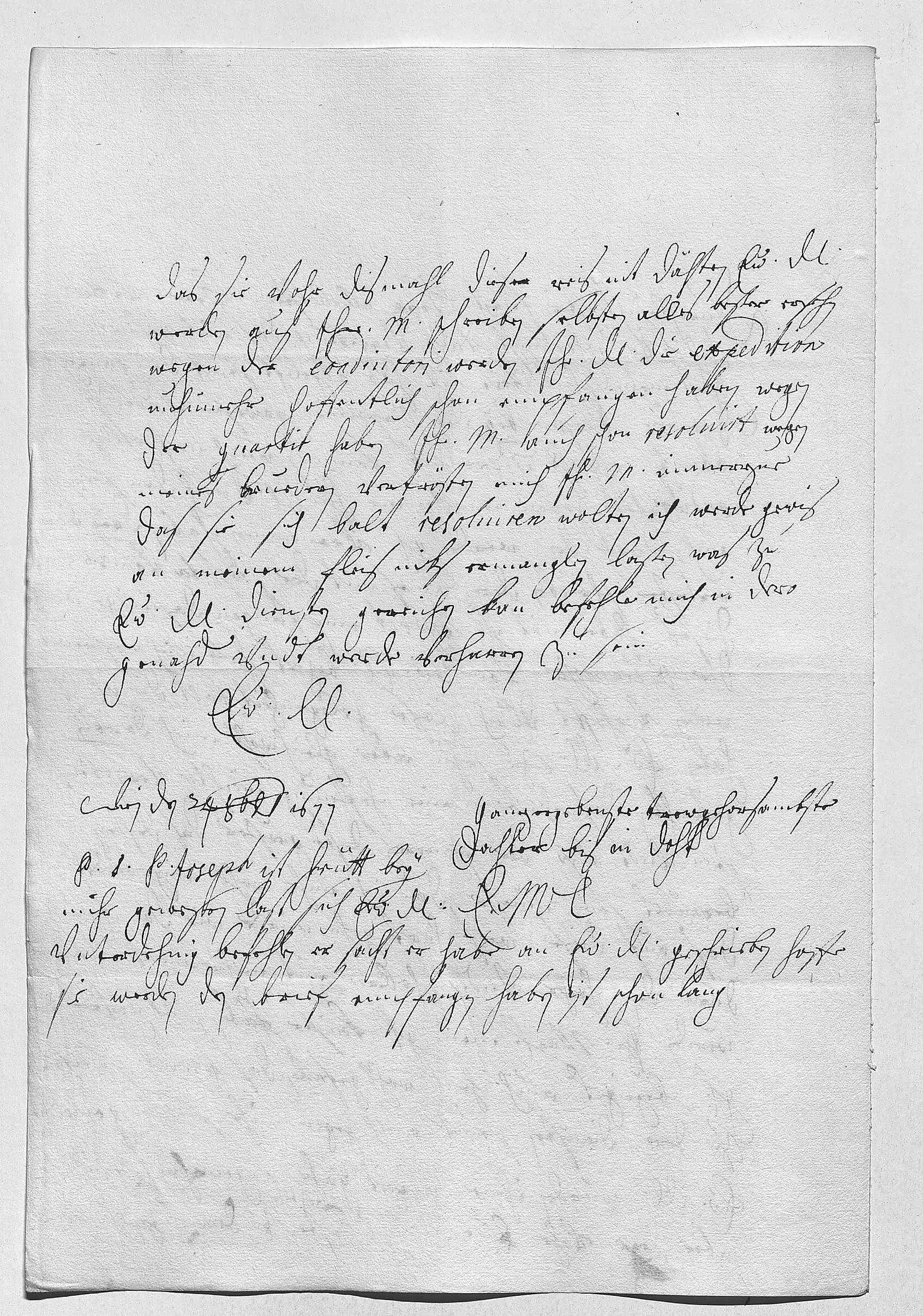 0023das sie vohr dismahl diesen reis nit dähten. Ewer Durchlaucht 0024werden aus ihr Mayestät schreiben selbsten alles beßer ersehn. 0025Wegen der coadiutori werden ihr Durchlaucht die expedition 0026nuhnmehr hoffentlich schon empfangen haben. Wegen 0027der quartir haben ihr Mayestät auch schon resoluirt. Wegen 0028meines bruedern vertrösten mich ihr Mayestät immerzue, 0029das sie sich balt resoluiren wolten, ich werde gewis 0030an meinem fleis niks ermanglen laßen, was zu 0031ewer Durchlaucht diensten gereichen kan. Befehle mich in dero 0032genahd vndt werde verharren zu sein 0033ewer Durchlaucht 0034ganzergebenste trewgehorsambste 0035dochter bis in doht 0036EMT 0037Wien den 24 octobris 16770038P. S. Pater Joseph ist heütt bey 0039mihr gewesen, last sich ewer Durchlaucht 0040vnterdehnig befehlen. Er sacht, er habe an ewer Durchlaucht geschrieben, hoffe, 0041sie werden den brief empfangen haben, ist schon lang her.